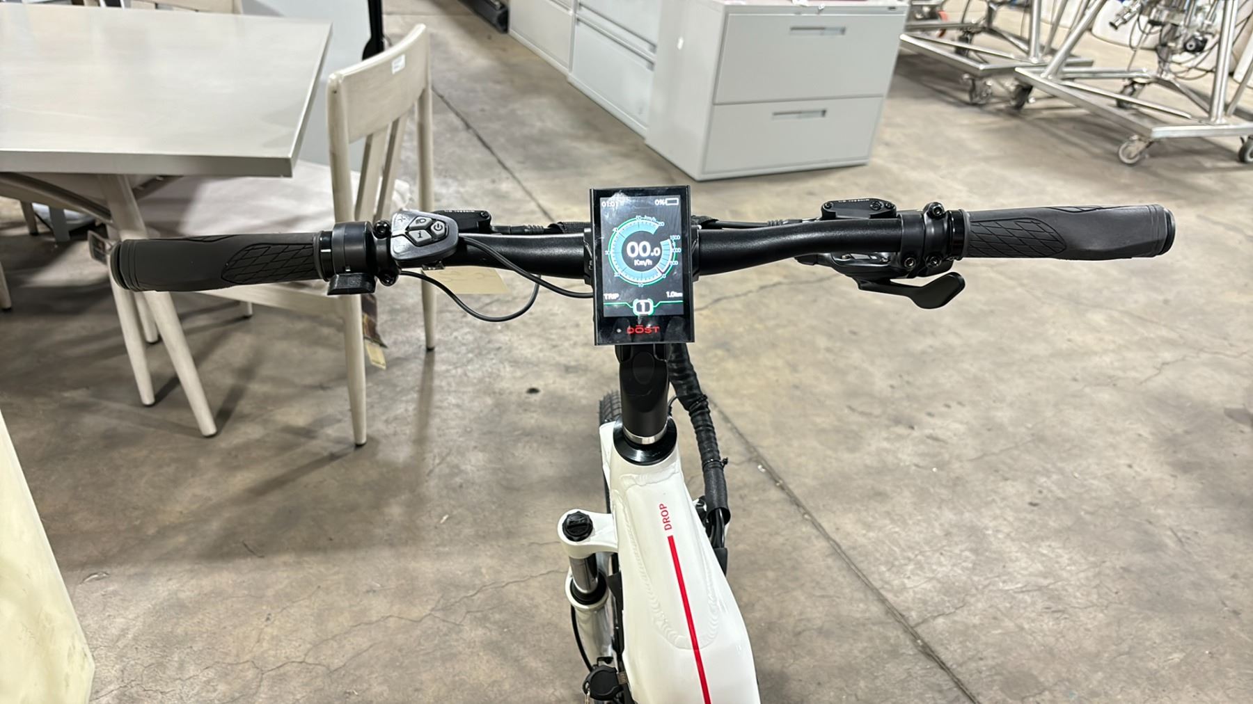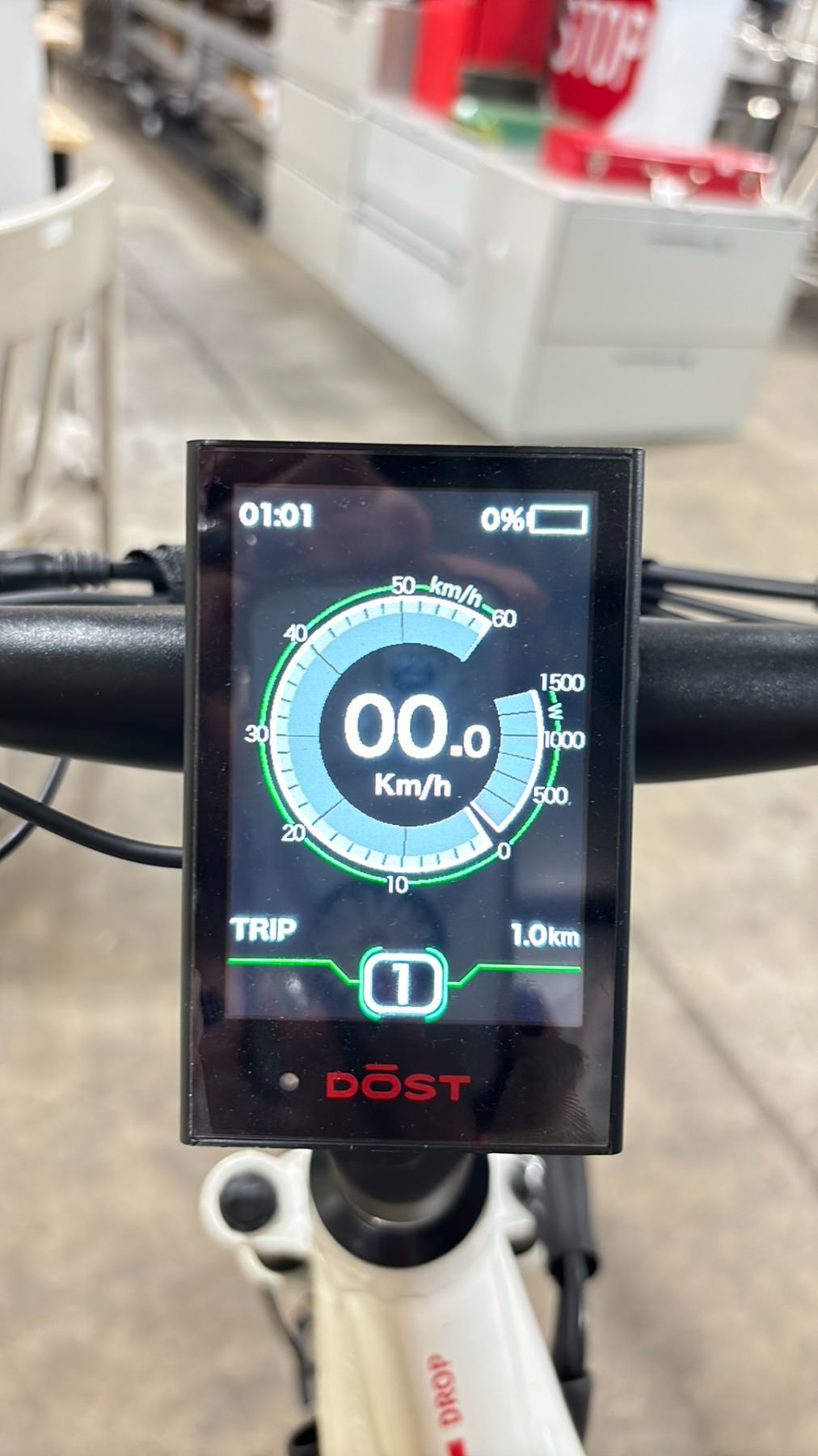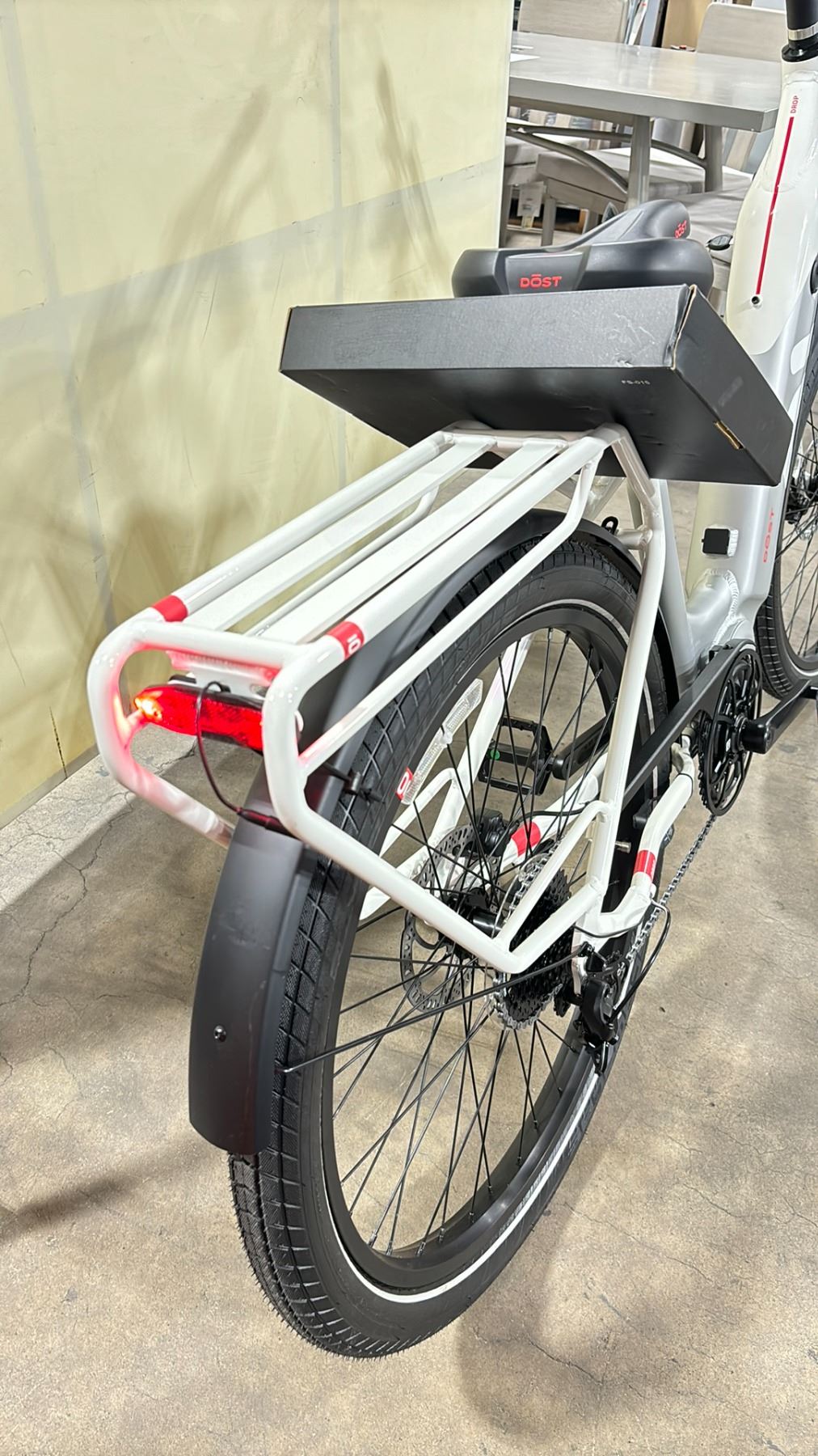 DOST DROP GLACIER WHITE 9 SPEED, 17.5"ELECTRIC BIKE; 500W MID DRIVE MOTOR, 100 KM RANGE, 120 NM TORQUE, 48V 14 AH LITHIUM ION FRAME BATTERY WITH 48V 2 AMP SMART CHARGER, DOST MULTI COLOR BACKLIT DIGITAL DISPLAY LCD WITH USB CHARGER, INTEGRATED FRONT + REAR LIGHT, INTELLIGENT 5 LEVEL PEDAL ASSIST, 27.5" TIRES ON ALUMINUM ALLOY RIMS, REAR RACK WITH 100 LB CARRYING CAPACITY AND A MAX LOAD ( RIDER + CARGO ) OF 300LBS *IN BOX*