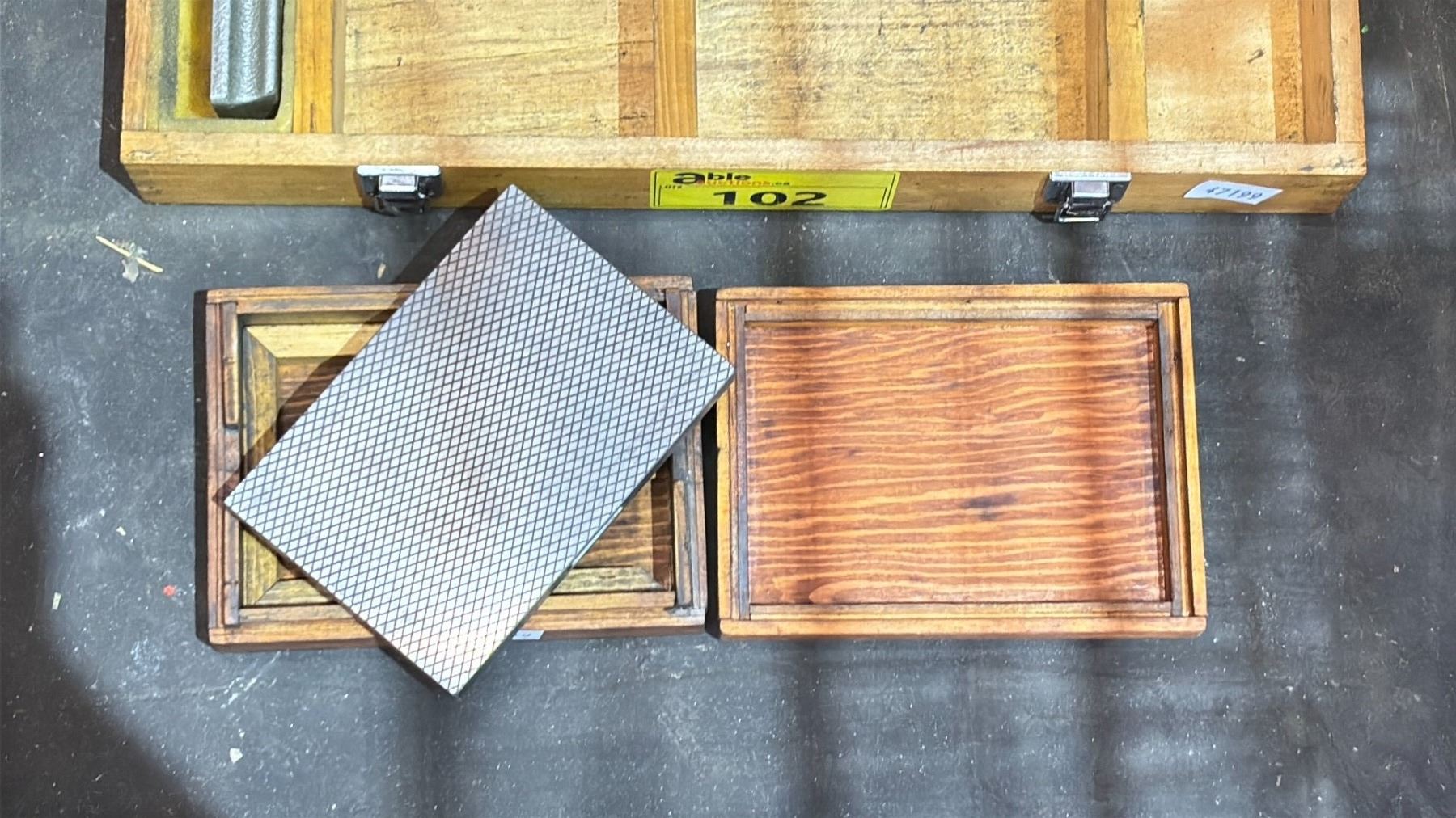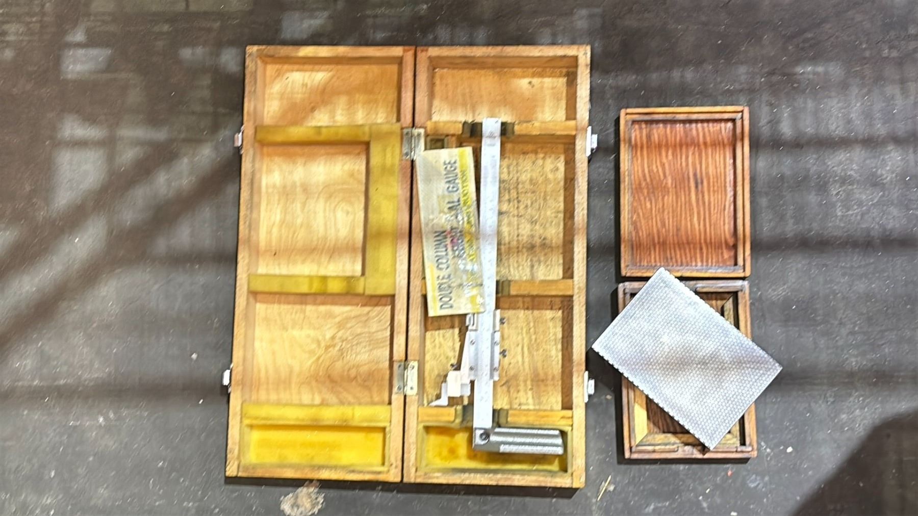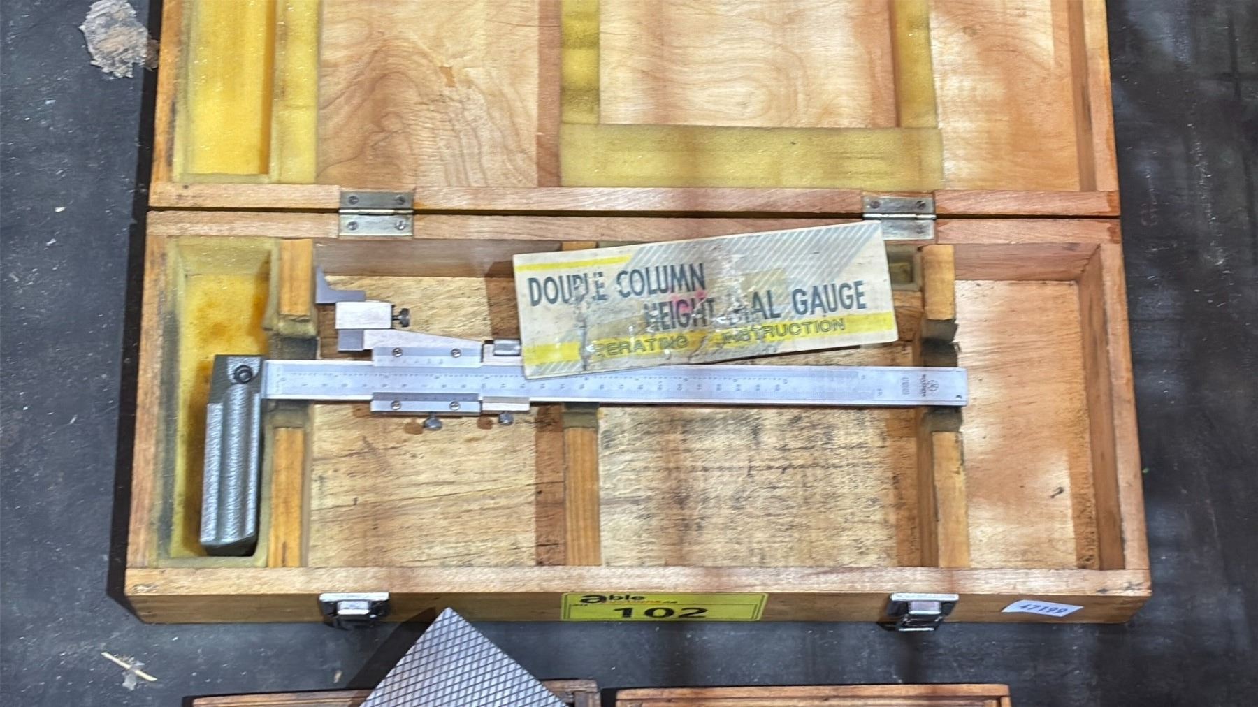 DOUBLE COLUMN HEIGHT GAUGE IN A WOODEN TRANSPORT CASE & DIAMOND PATTERN CALIBRATION PLATE