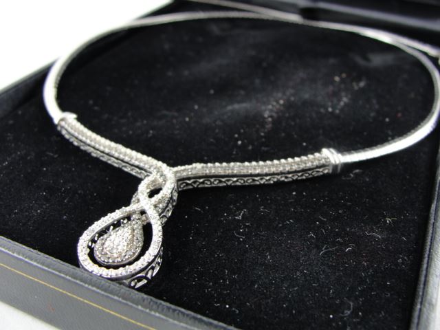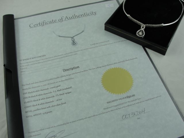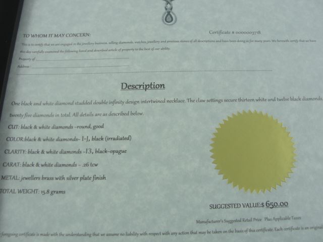 DOUBLE INFINITY BLACK AND WHITE DIAMOND NECKLACE WITH 25DIAMONDS. INCLUDES $650 CERTIFICATE