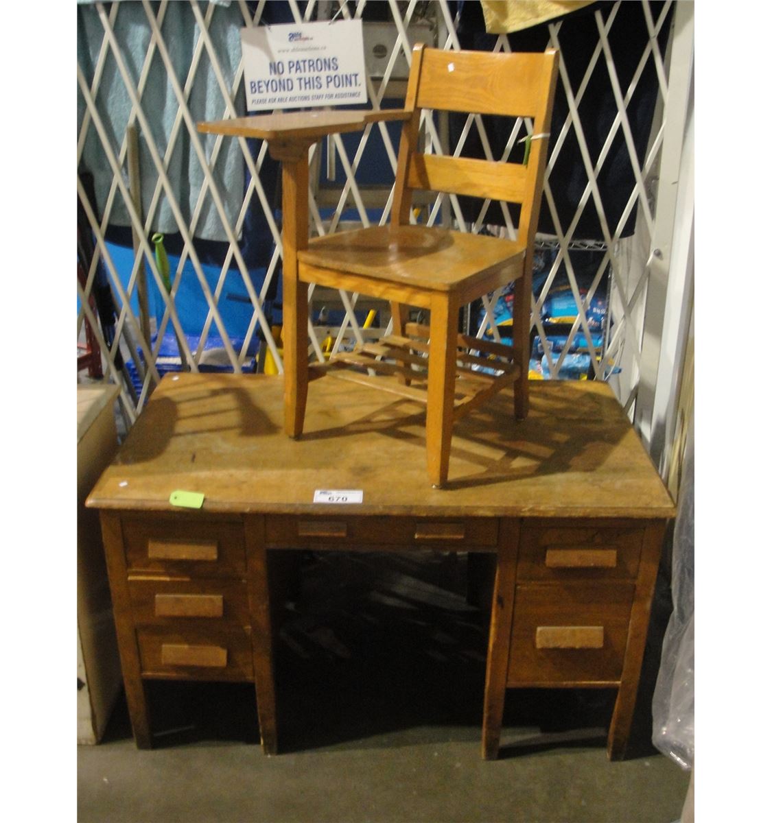 DOUBLE PEDASTOL OFFICE DESK AND AN OAK STUDENTS DESK
