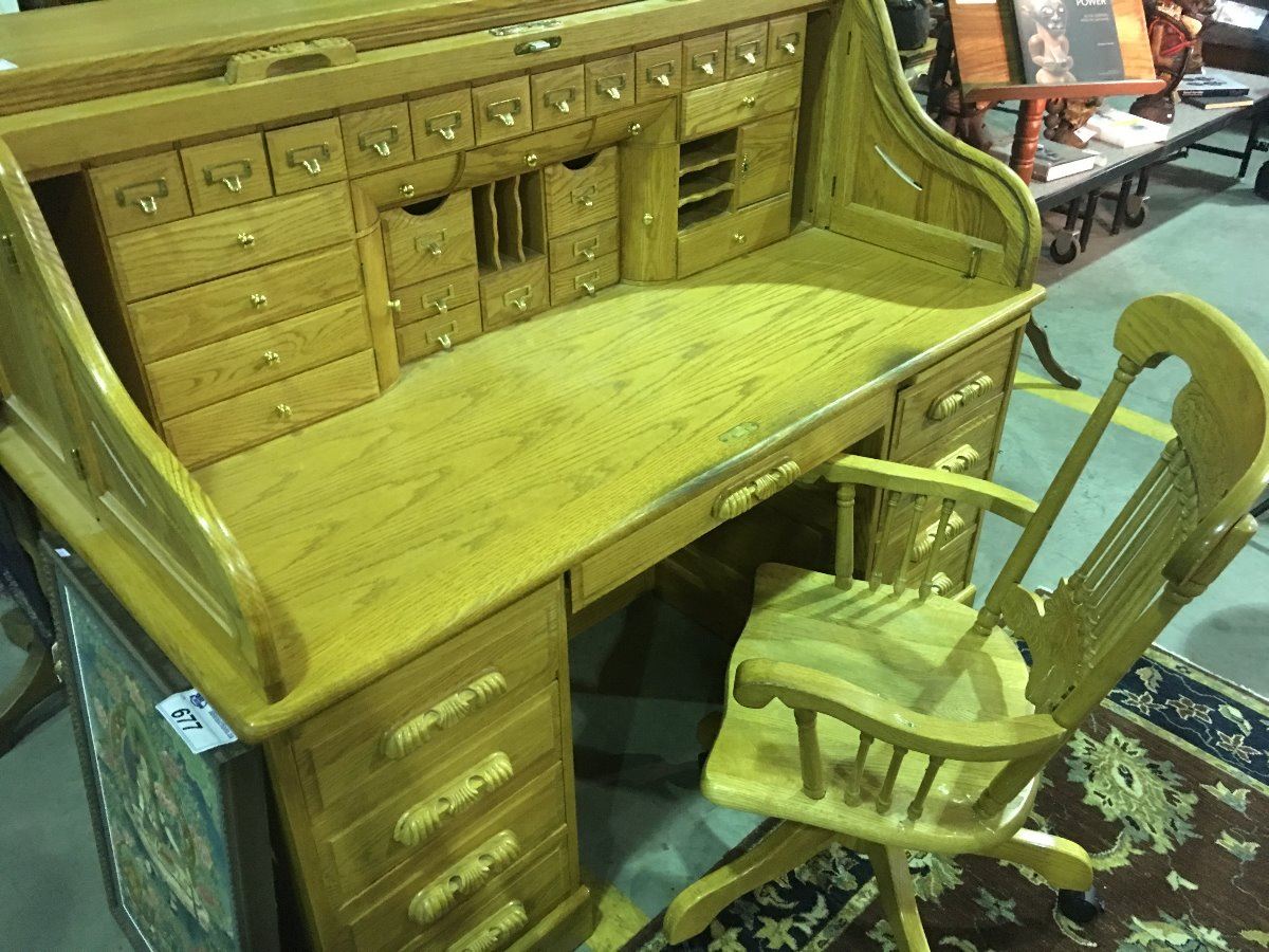 DOUBLE PEDESTAL OAK ROLL TOP DESK WITH CHAIR