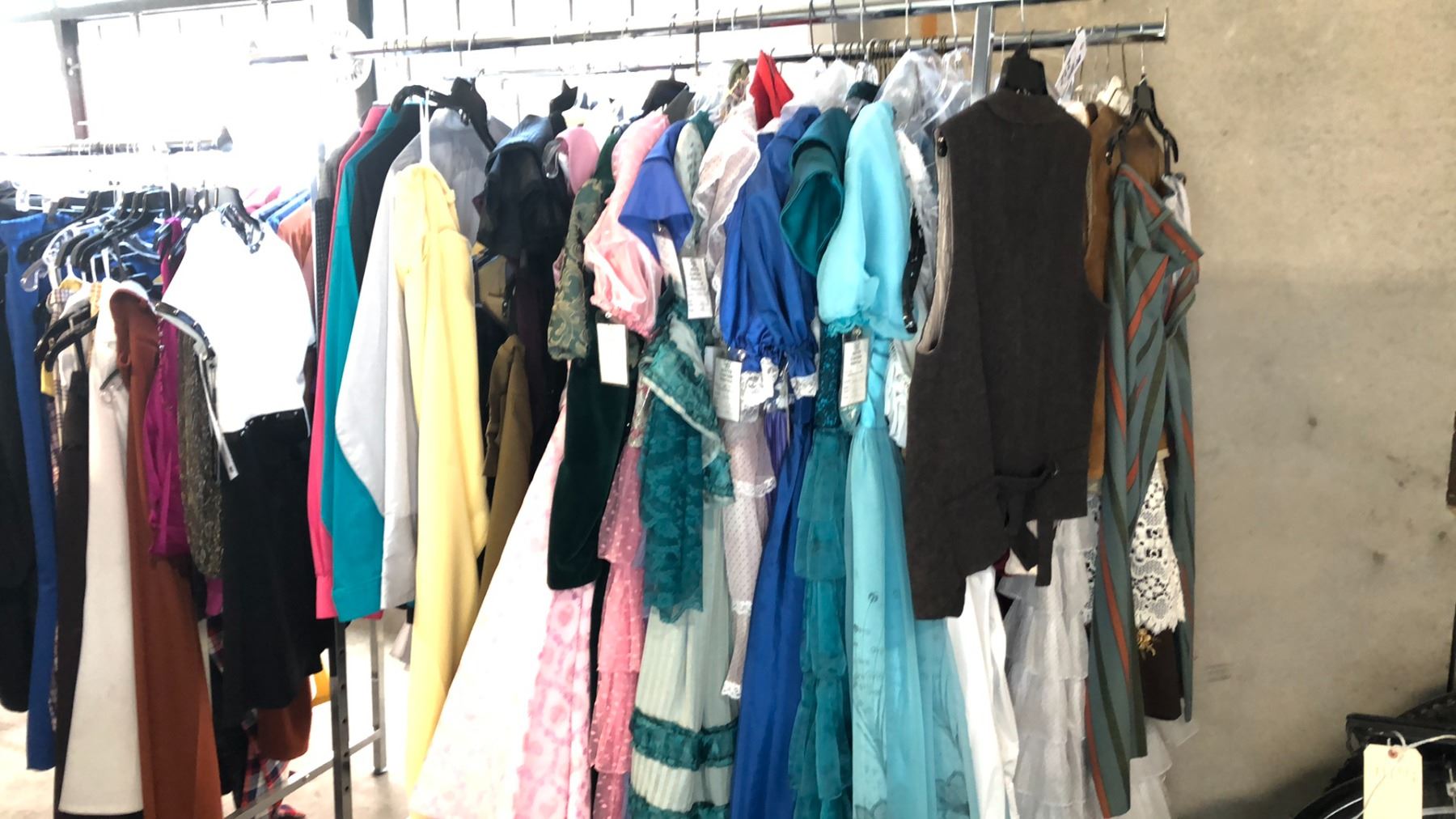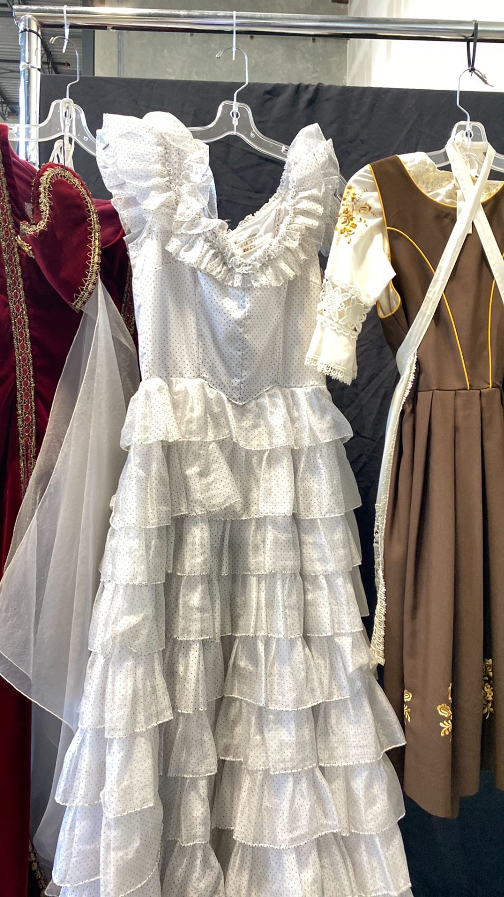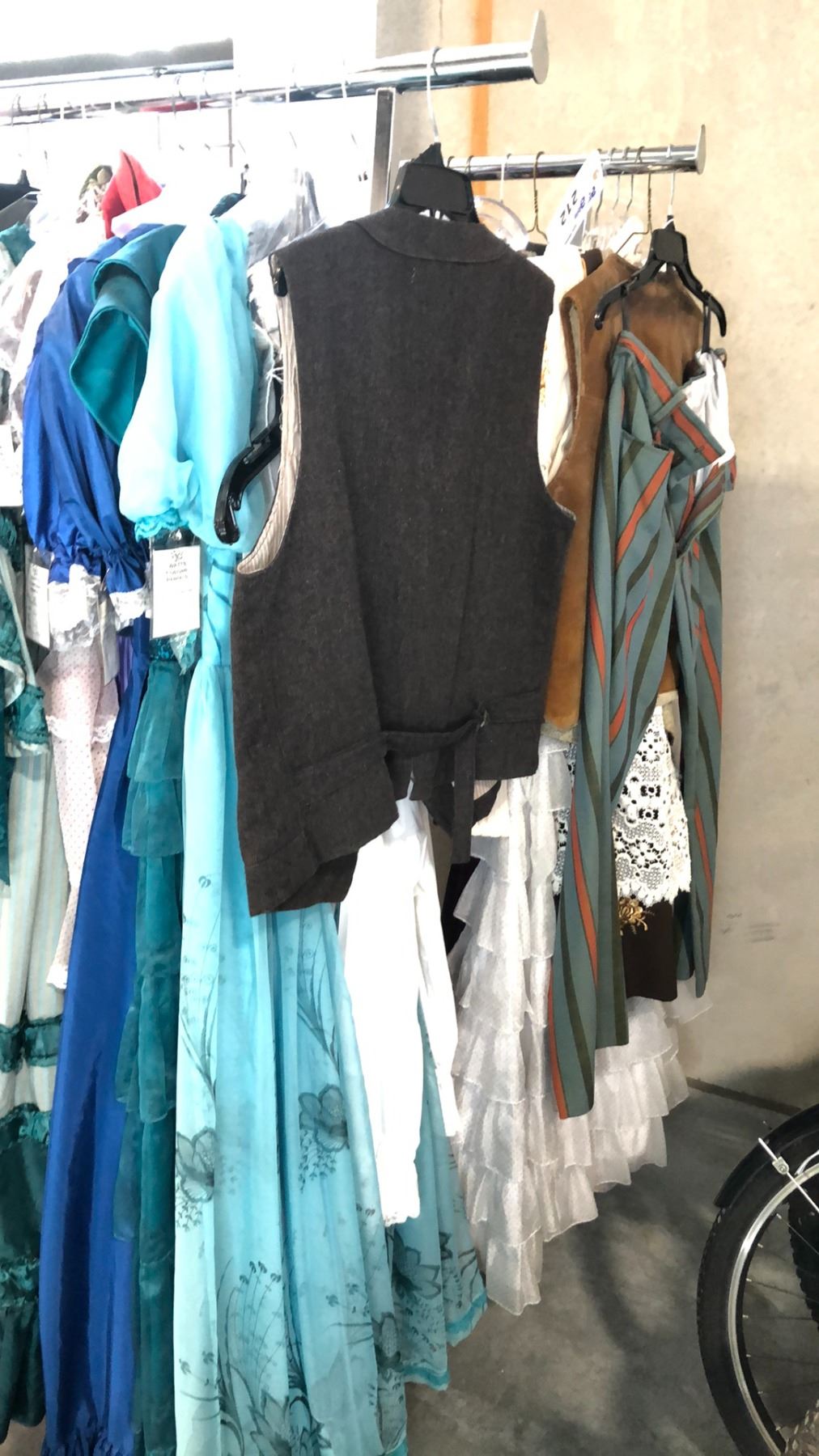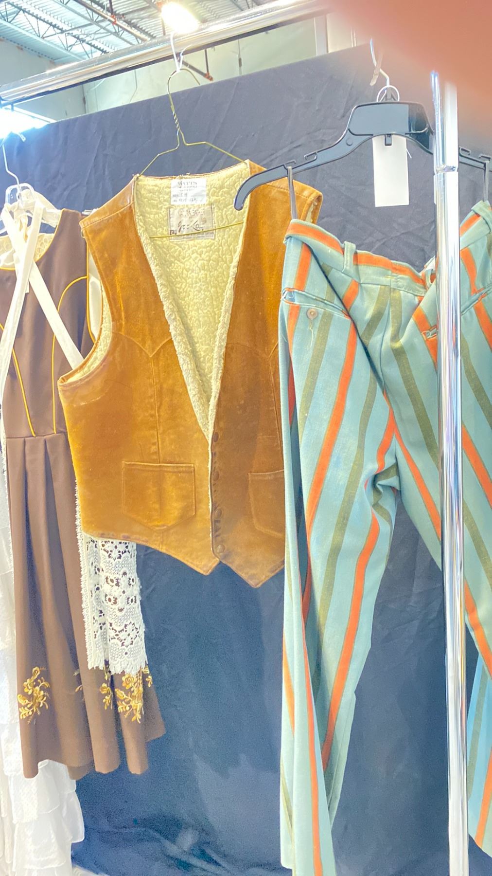 DOUBLE RACK OF COSTUMES: SOUTHERN BELLE DRESS, RENAISSANCE DRESS WITH HEAD PIECE, SUEDE VEST 1960'S PANTS