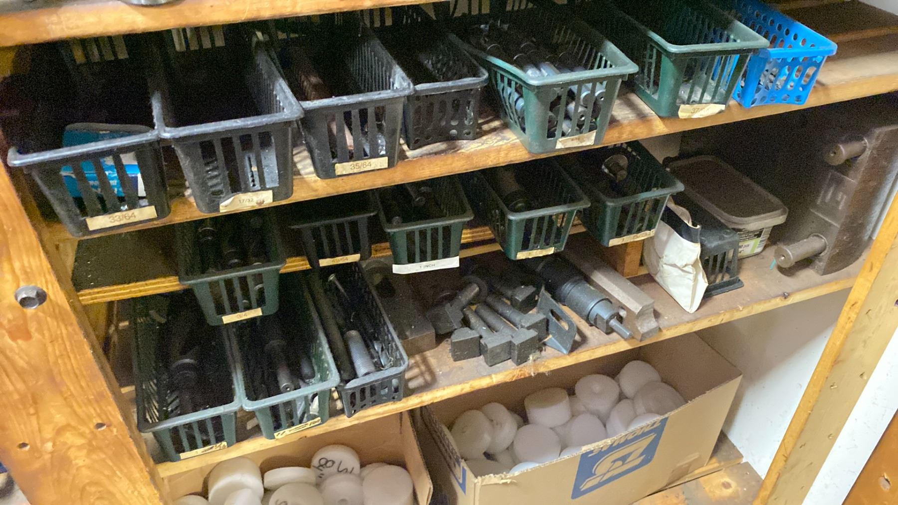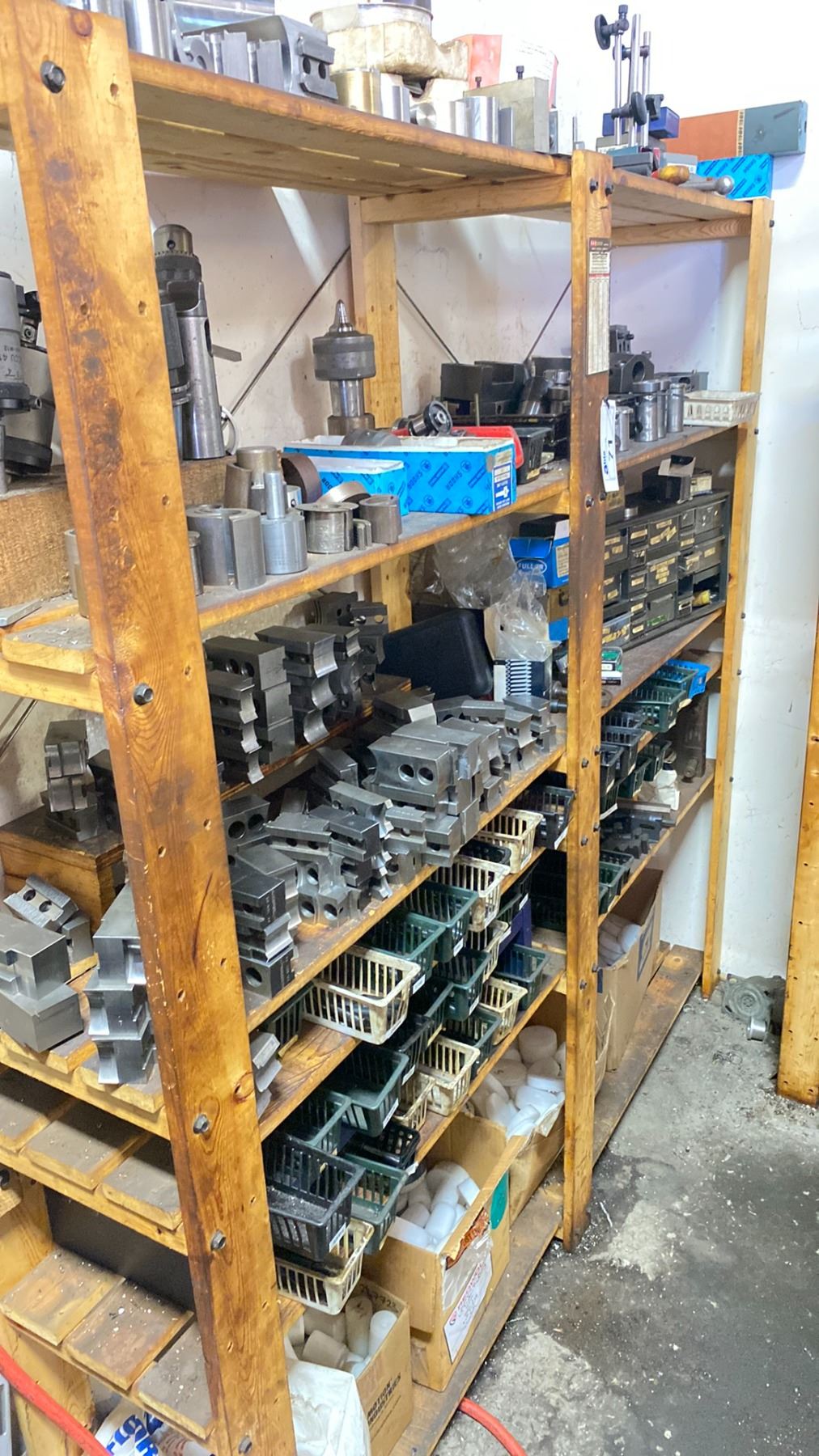 DOUBLE WOODEN SHELF UNIT FILLED WITH ASSORTED MACHINIST TOOLING PARTS AND ACCESSORIES FOR LATHE, MILLING