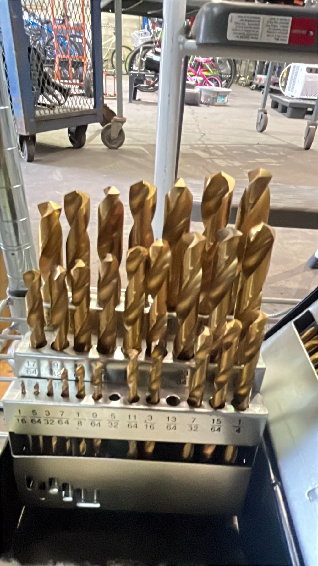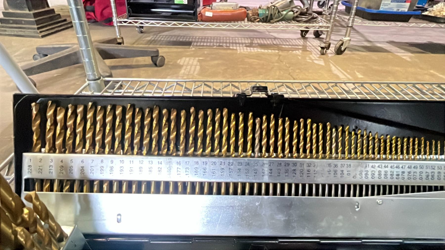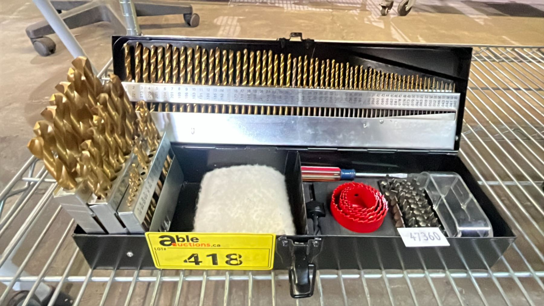 DRILL BITS, SCREWDRIVER BITS & HOLE SAW BITS IN A METAL TRANSPORT CASE
