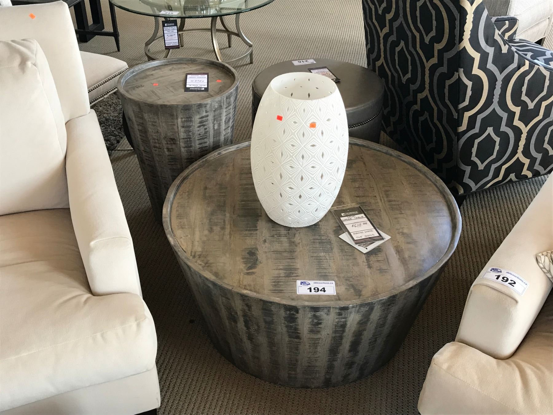 DRUM GREY WASHED MANGO WOOD COCKTAIL TABLE & END TABLE SET WITH DECOR ITEM