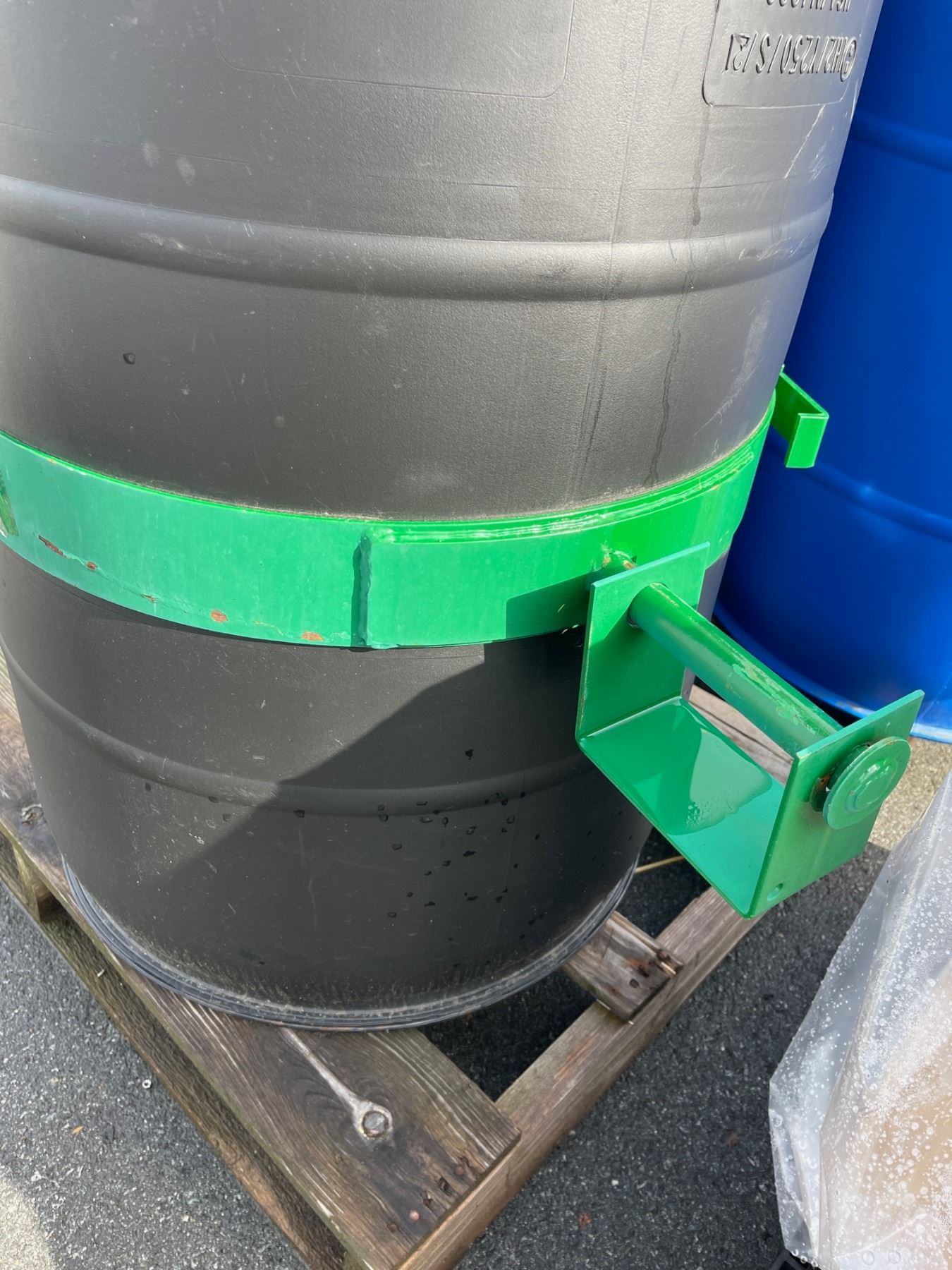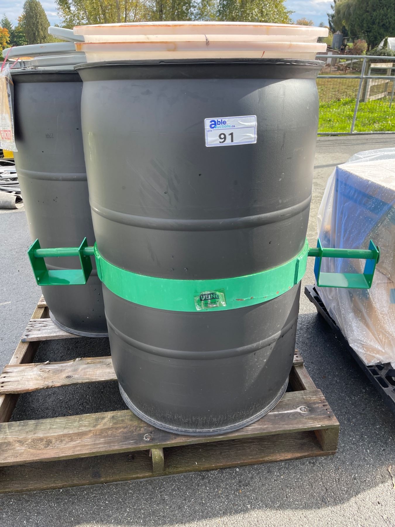 DRUM TILT RING WITH FORKLIFT POCKETS, 4 STORAGE BARRELS WITH CARTON OF 10 MIL DRUM LINERS