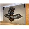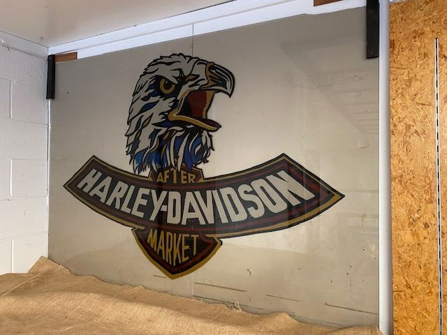 EAGLE GLASS HARLEY DAVIDSON APPROX 66"X44", HAS A BIT OF GLASS MISSING ON UPPER RIGHT SIDE