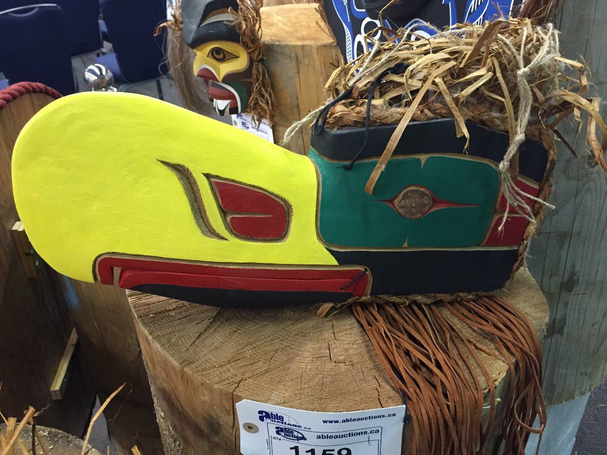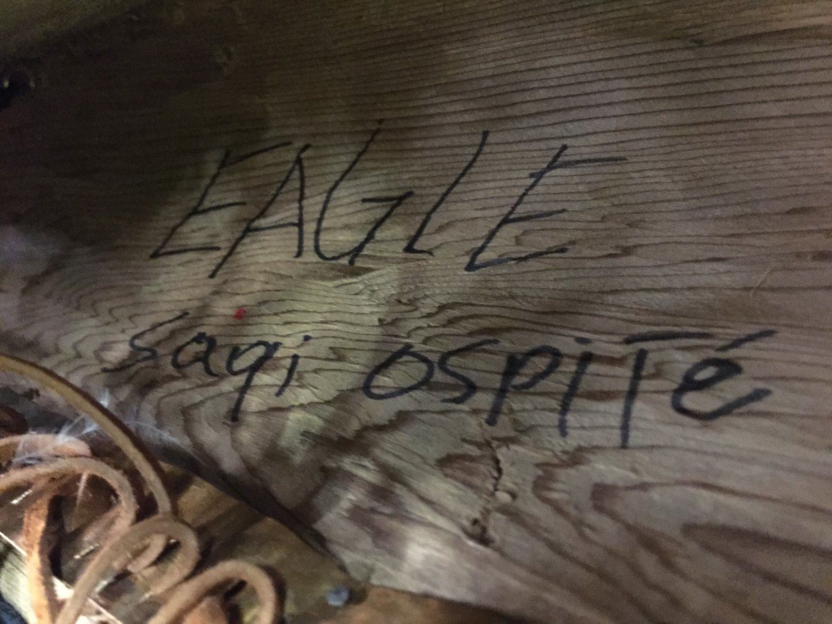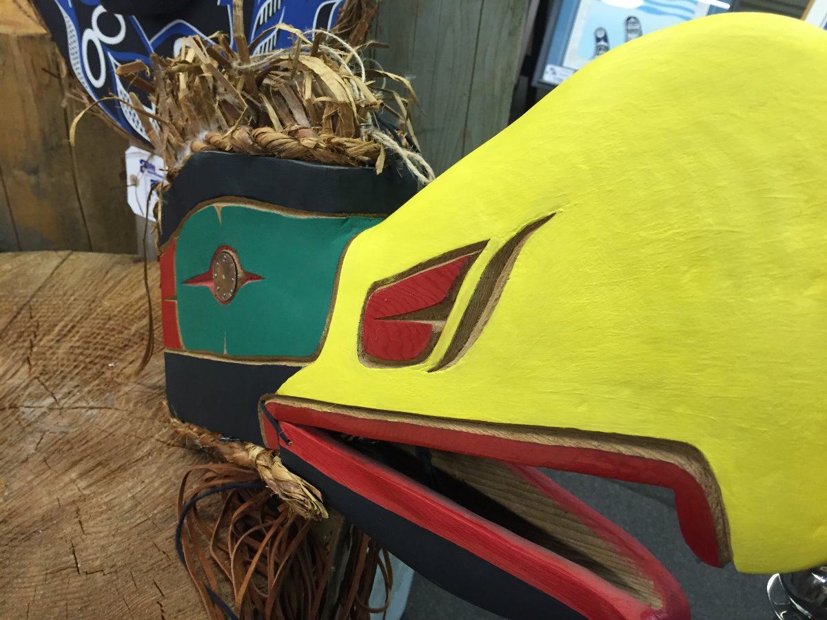 EAGLE MASK WITH COPPER EYES, SIGNED "SAGI OSPITE" 19" L X 5" W
