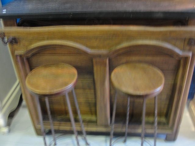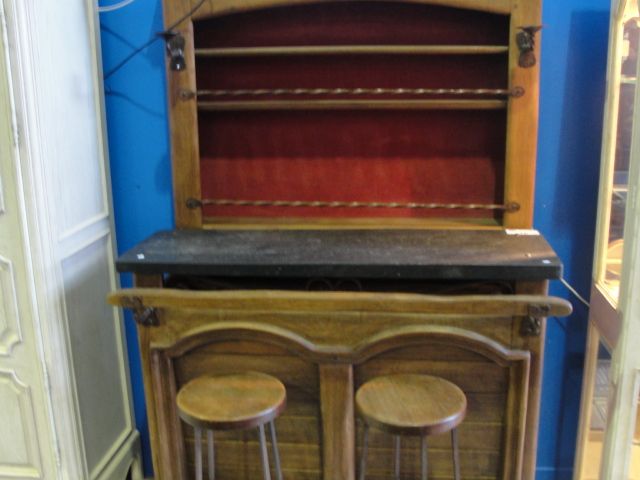 EARLY 1900'S ARTS AND CRAFTS OAK AND WROUGHT IRON 4 PIECE BAR SET WITH BLACK SLATE COUNTER AND 2 STOOLS