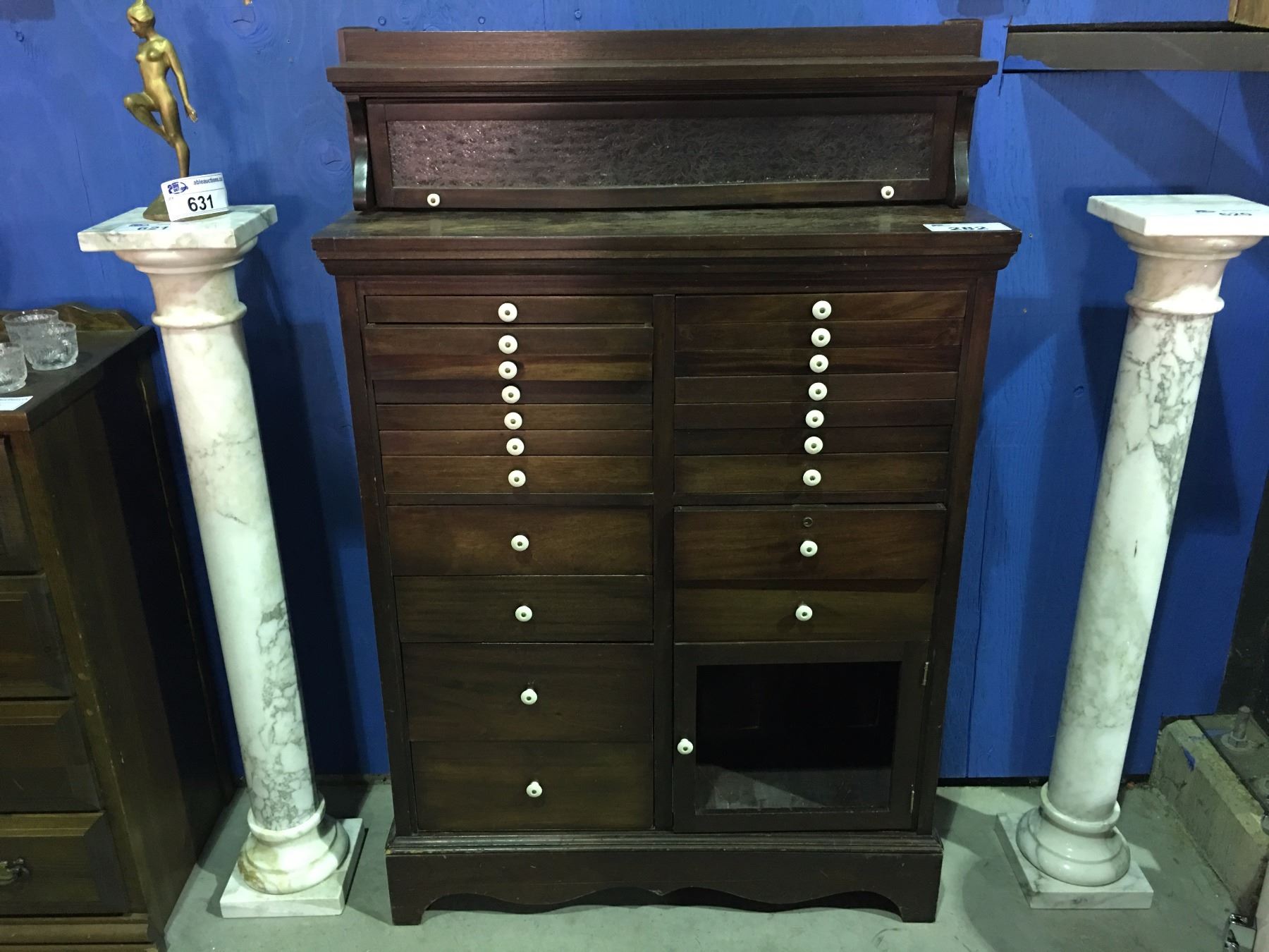 EARLY 1900'S MAHOGANY WITH WHITE PORCELAIN DRAWER PULLS DENTISTRY CABINET