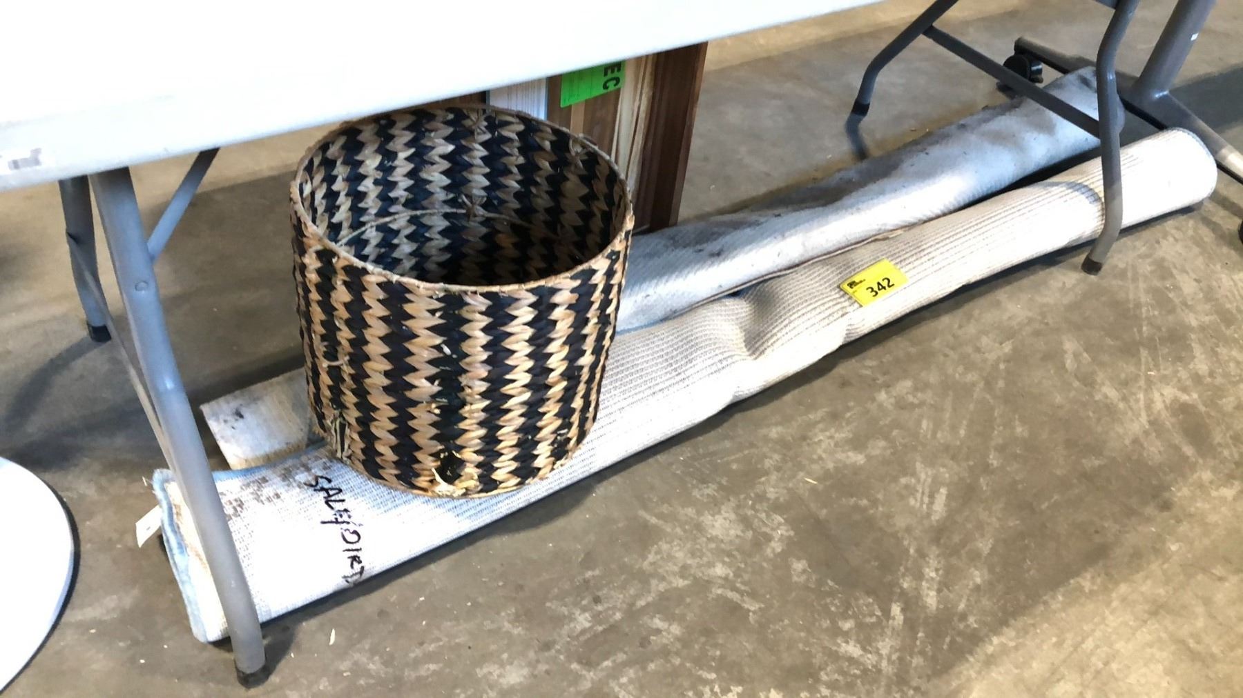 EARTH TONE ROUND CARPET, SISAL COLLECTION LIGHT BLUE TAILORED TOUCH PATTERN, RATTAN BASKET AND PASTRY BOARD