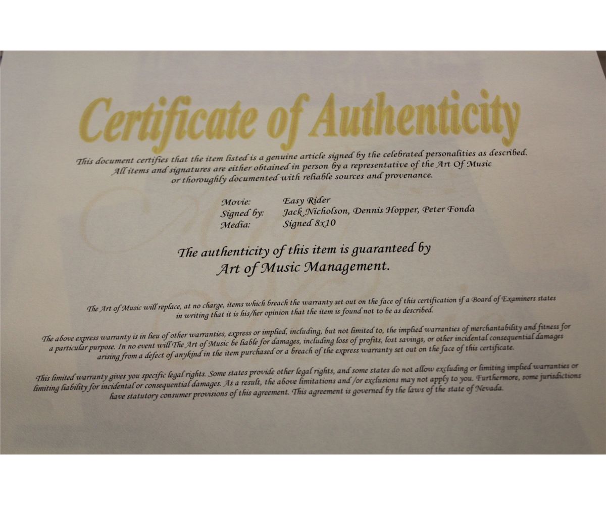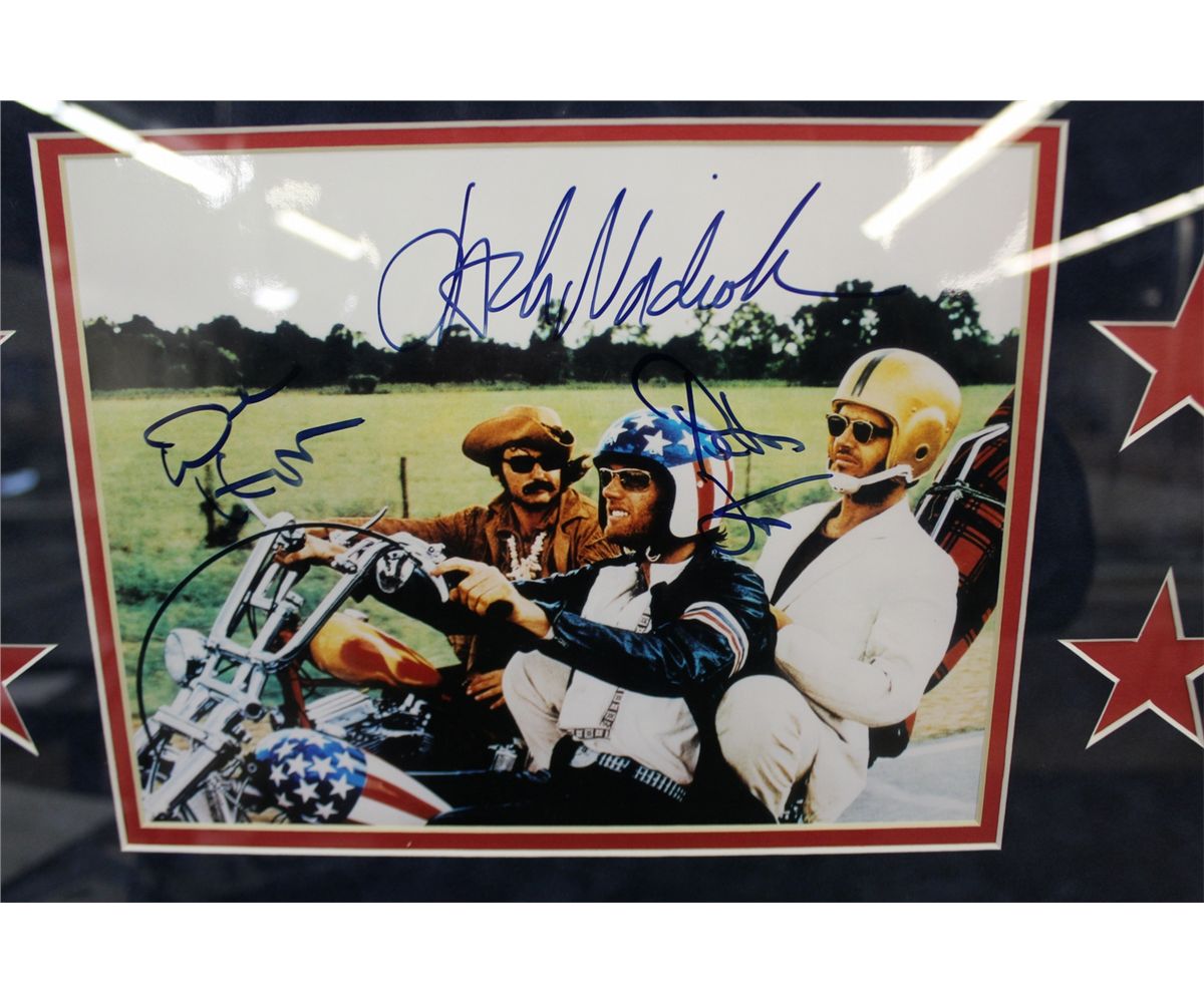 EASY RIDER CUSTOM FRAMED COLOUR PHOTO WITH SIGNATURES OF: PETER FONDA, WYATT DENNIS HOPPER, BILLY JACK NICHOLSON AND GEORGE HANSON. WITH COA FROM THE ART OF MUSIC MANAGEMENT