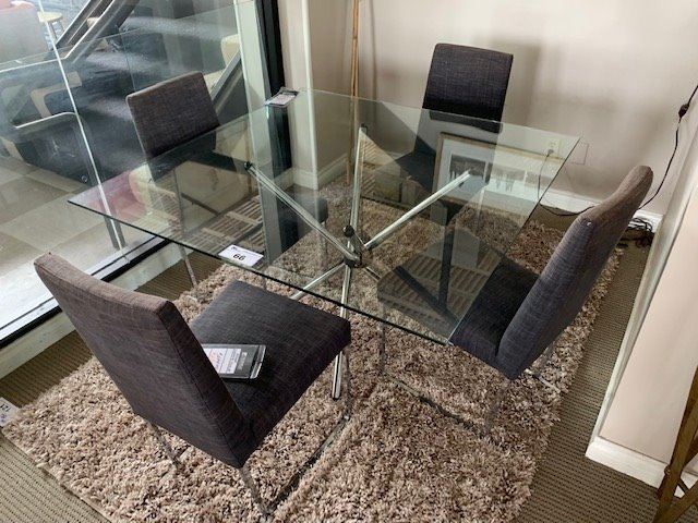 EDGE MODERN GLASS & CHROME 5 PIECE DINING SET INCLUDING: 47" X 47" TABLE & 4 METAL & FABRIC NG CHAIRS