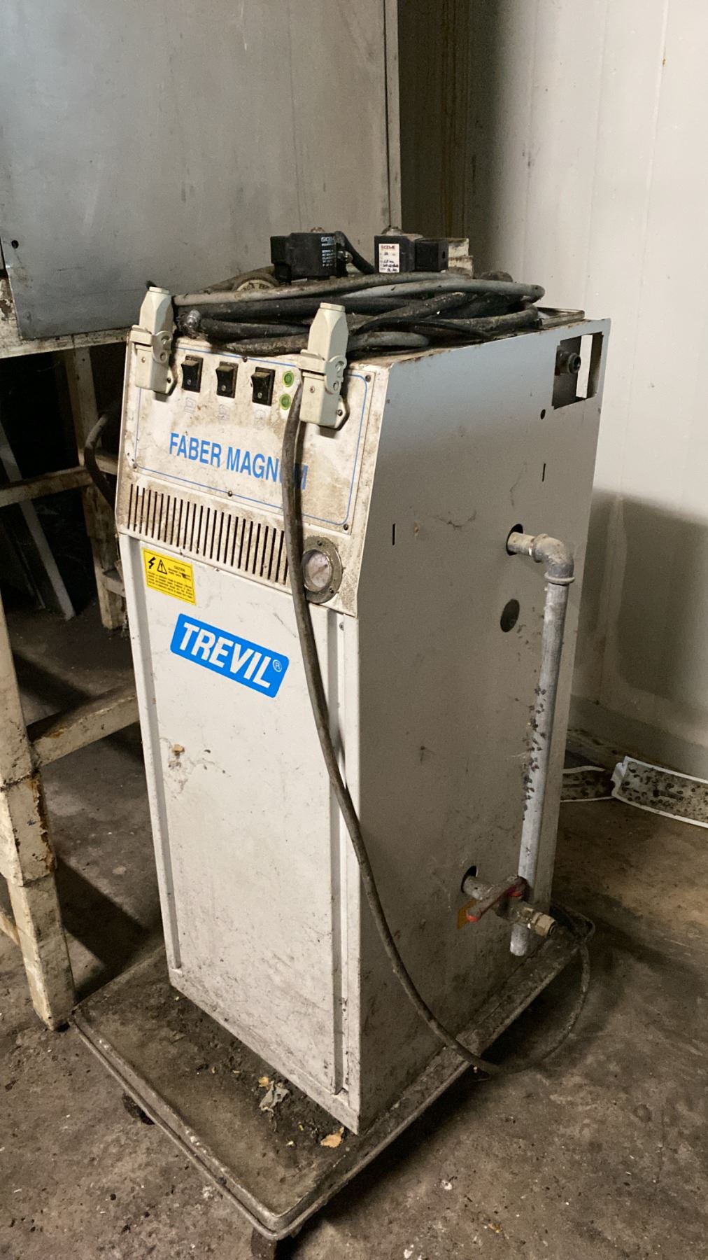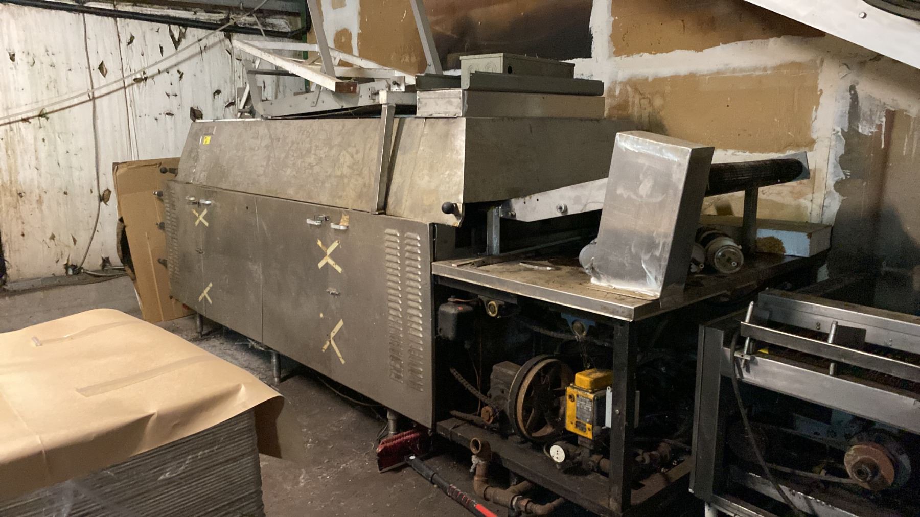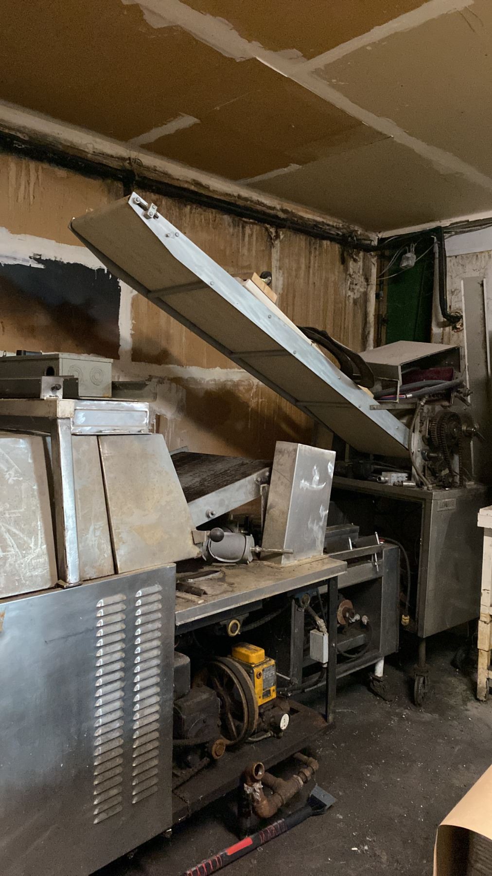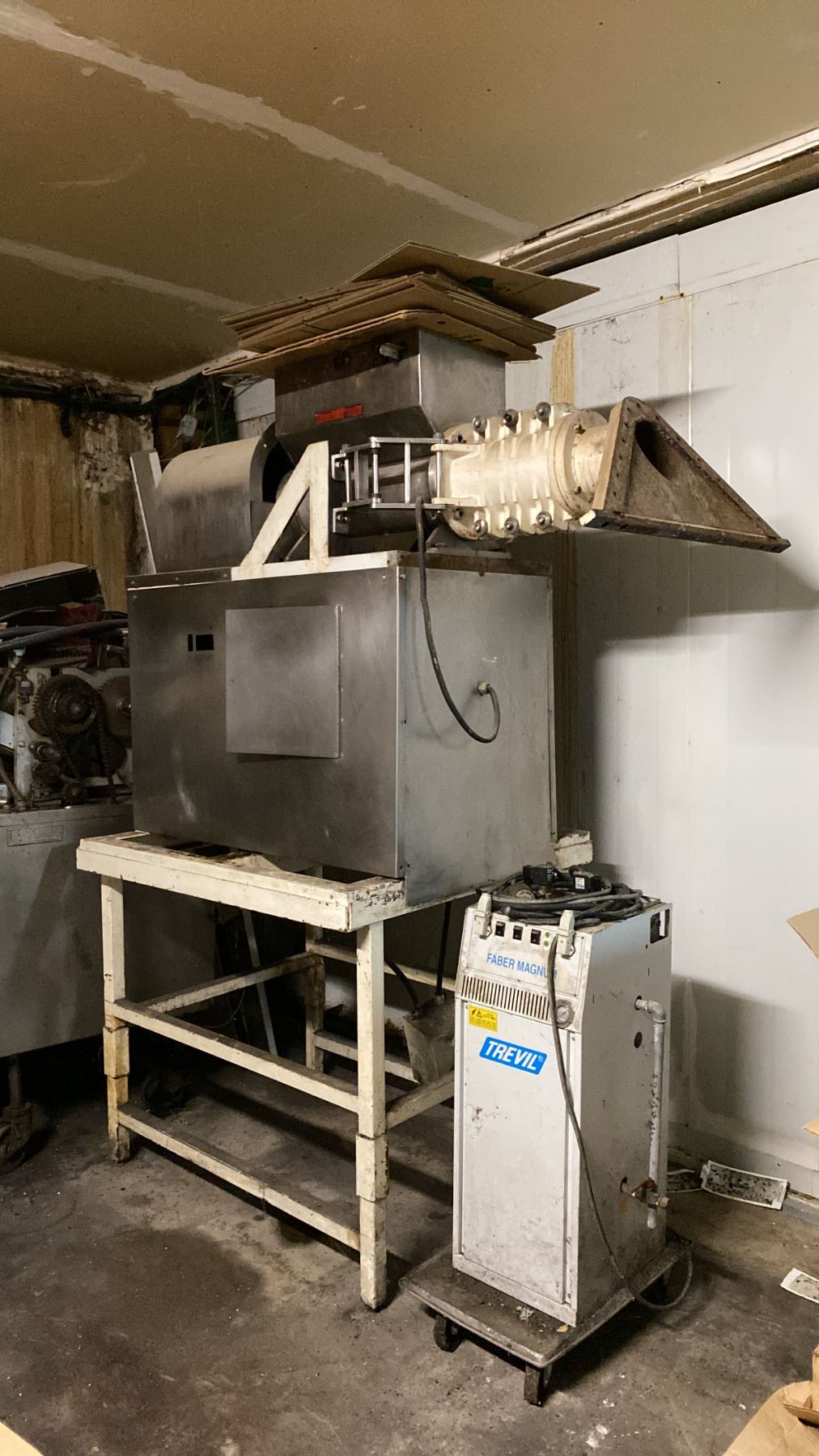 EEM STAINLESS STEEL LARGE SCALE CONVEYOR OVEN, STAINLESS STEEL ROLLER FEEDER SYSTEM, EEM DROP FEEDER SYSTEM, LARGE STAINLESS STEEL COATING SPRAYER ON STAND, & FABER MAGNUM TREVIL SYSTEM ON CART *CART INCLUDED* *MUST TAKE ALL*