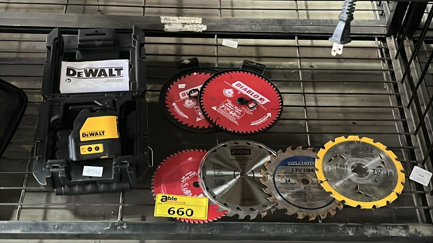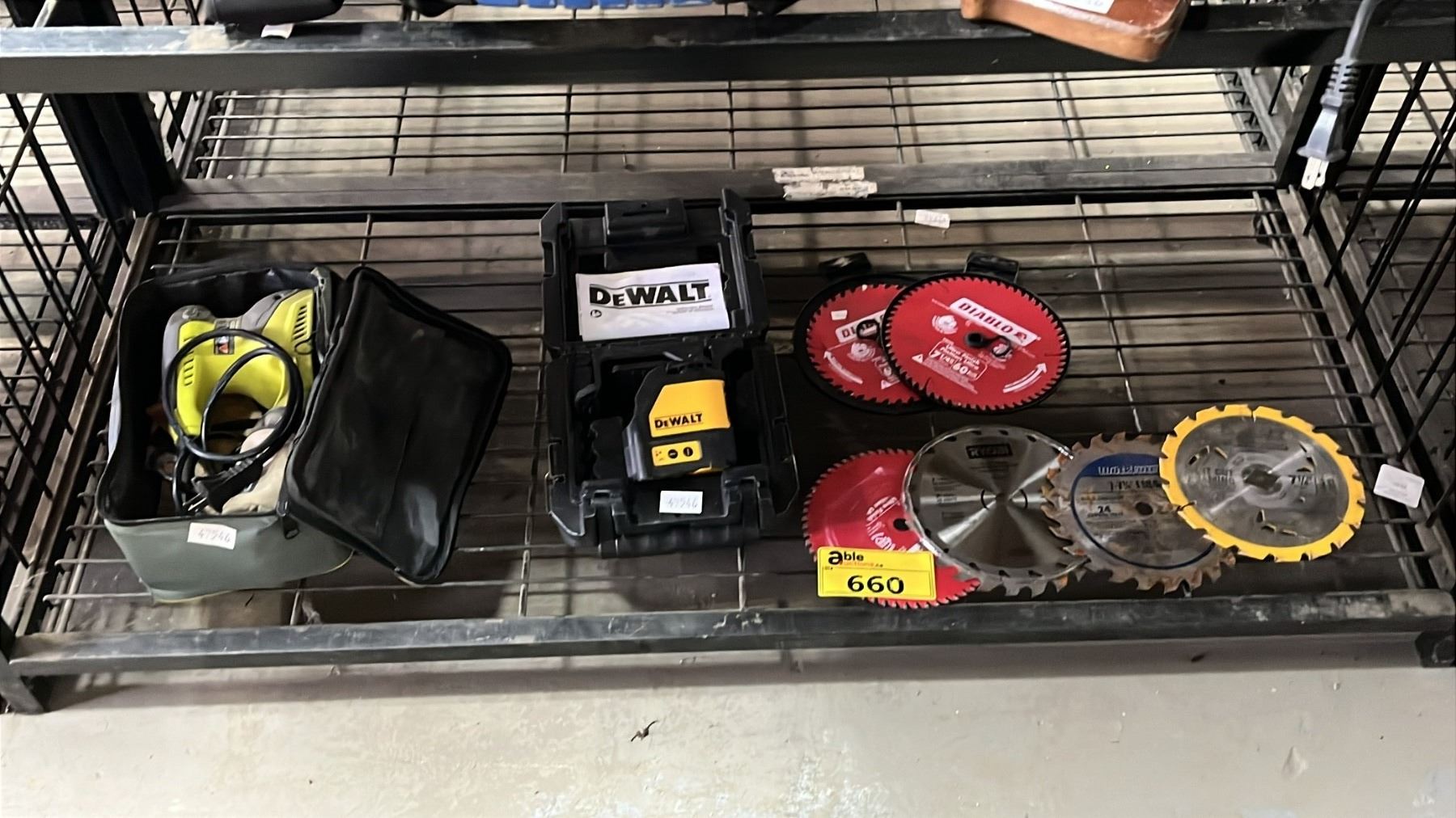 ELECTRIC SANDER, DEWALT LASER LEVEL & ASSORTED SAW BLADES