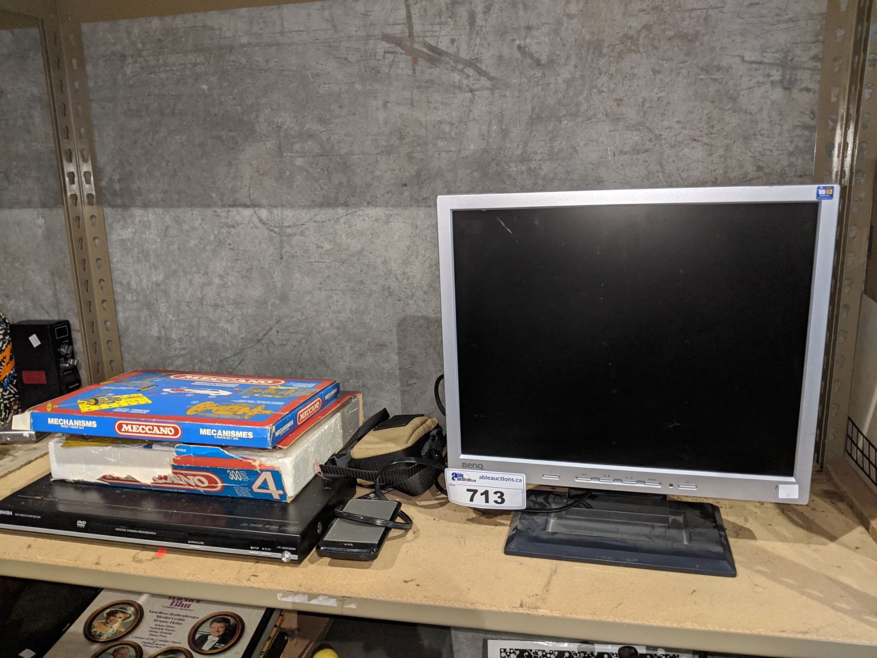 ELECTRONICS SHELF INCLUDING BENQ MONITOR, TOSHIBA DVD PLAYER, TOYS, CAMERAS AND MORE