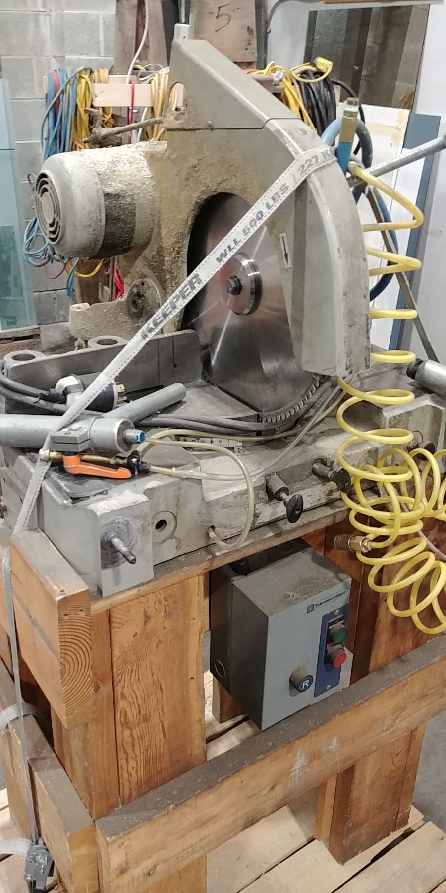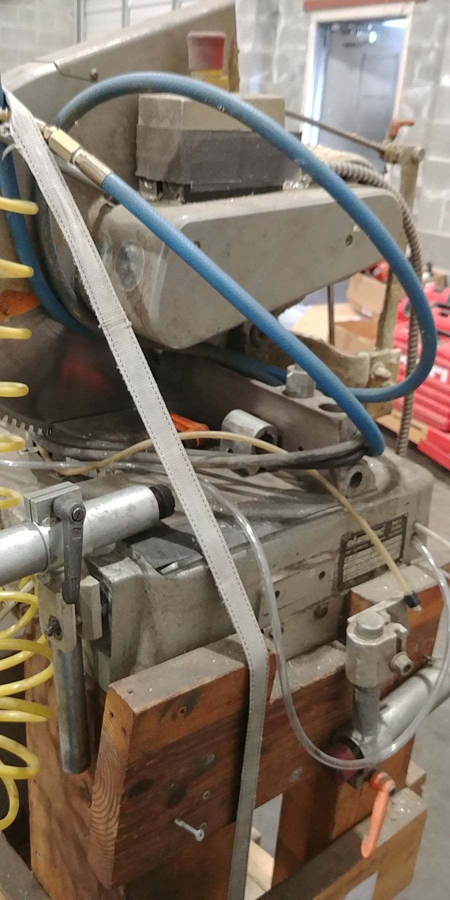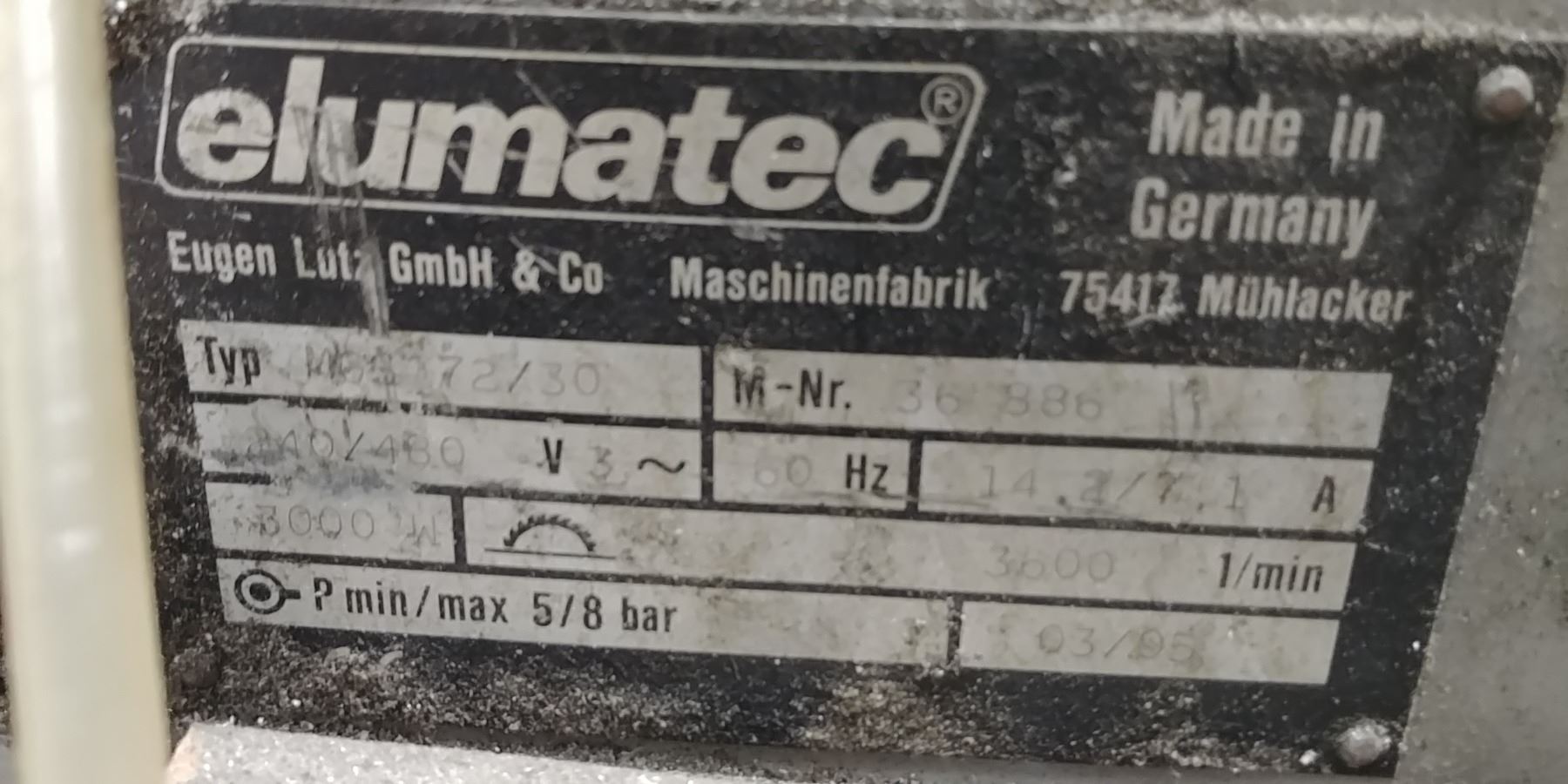 ELUMATEC MODEL 36 886 AIR DRIVEN MITER SAW. COMES WITH AIR CLAMPS. MADE IN GERMANY