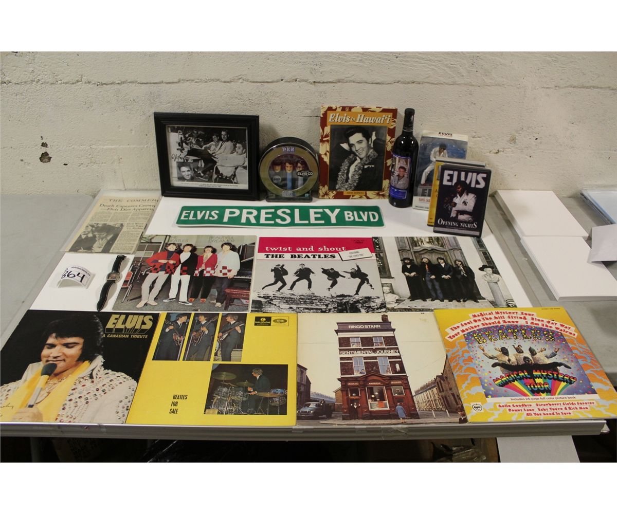 ELVIS AND BEATLES COLLECTABLES- INCLUDES SIGNED AND FRAMED PHOTO OF DJ FONTANA (ELVIS' DRUMMER) ELVIS WRISTWATCH (NEW BATTERY), DEATH NEWSPAPER, ELVIS COLLECTABLES AND GIANT ELVIS POSTER. ALSO RARE 1974 & 1975 ELVIS HILTON HOTEL CONCERT FILM FOOTAGE, ENTIRE FRANK SINATRA SHOW , WELCOME HOME ELVIS. ALSO SIX RARELY PLAYED BEATLE LPS IN EXCELLENT CONDITION, INCLUDING RARE 1963 BBC RADIO APPEARANCES, MAGICAL MYSTERY TOUR ON APPLE RECORDS WITH COLOUR BOOK) AND OTHERS