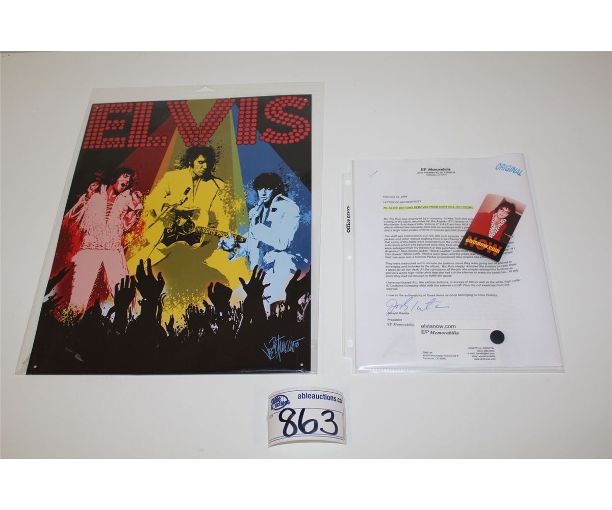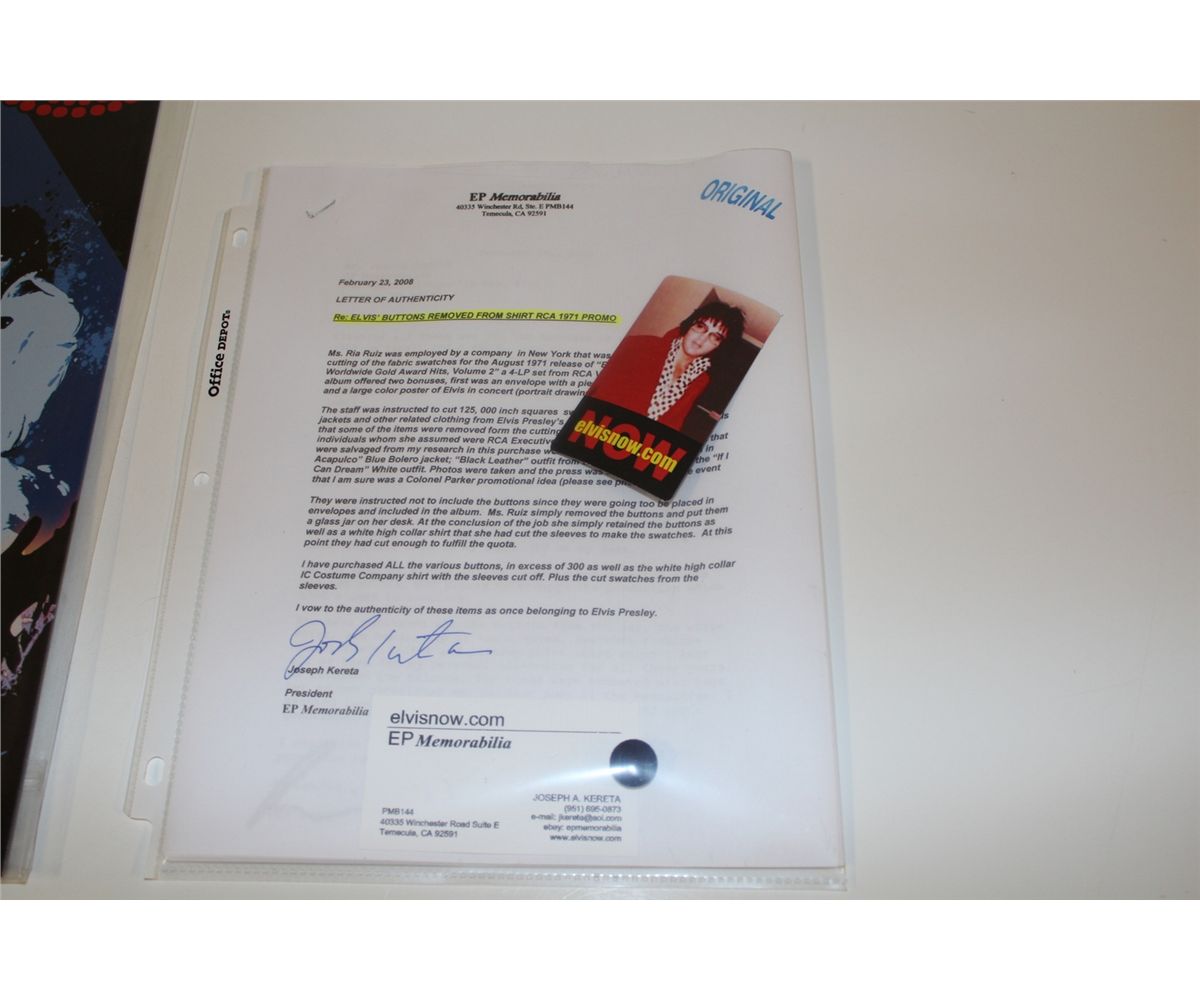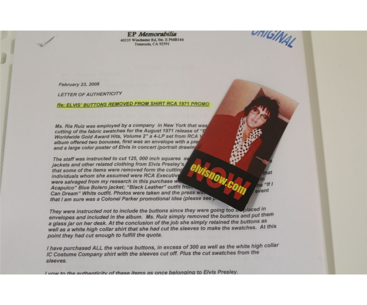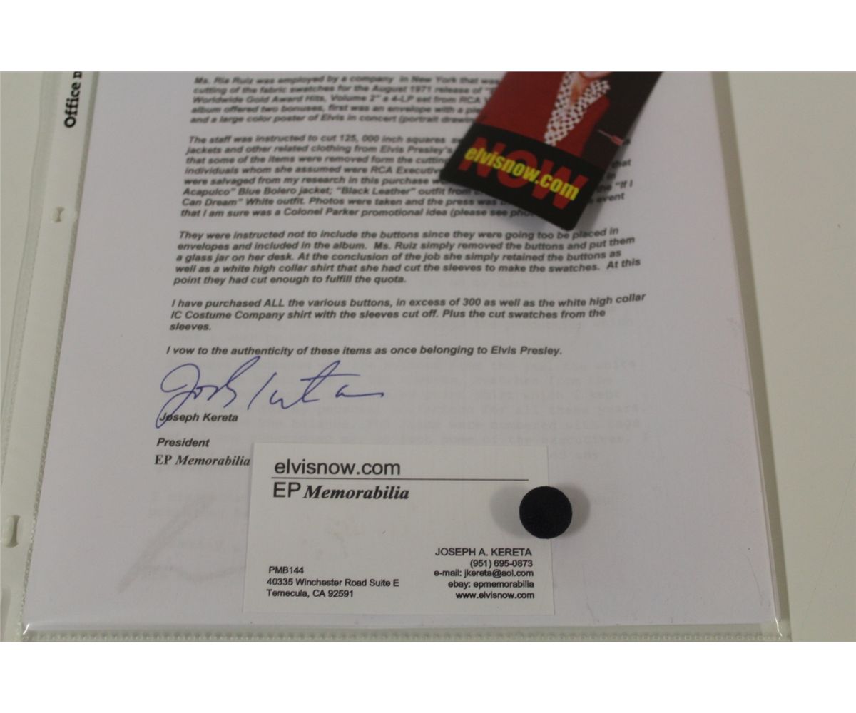 ELVIS PRESLEY CLOTHING ITEM - A PERSONAL PIECE OF THE KING OF ROCK AND ROLL. IN THE EARLY 70S A QUANTITY OF HIS PERSONAL WARDROBE WAS CUT INTO SMALL PIECES TO BE INCLUDED IN A NEW ALBUM RELEASE AS A PROMOTION, BUT NOT THE BUTTONS. RECOGNIZED ELVIS MEMORABILIA EXPERT JOSEPH KERETA (SEEN ON STORAGE WARS) OBTAINED THESE BUTTONS FOR SALE TO COLLECTORS. COMES WITH SIGNED DOCUMENTATION.  LOT INCLUDES NEW IN PACKAGE METAL ELVIS ARTWORK.