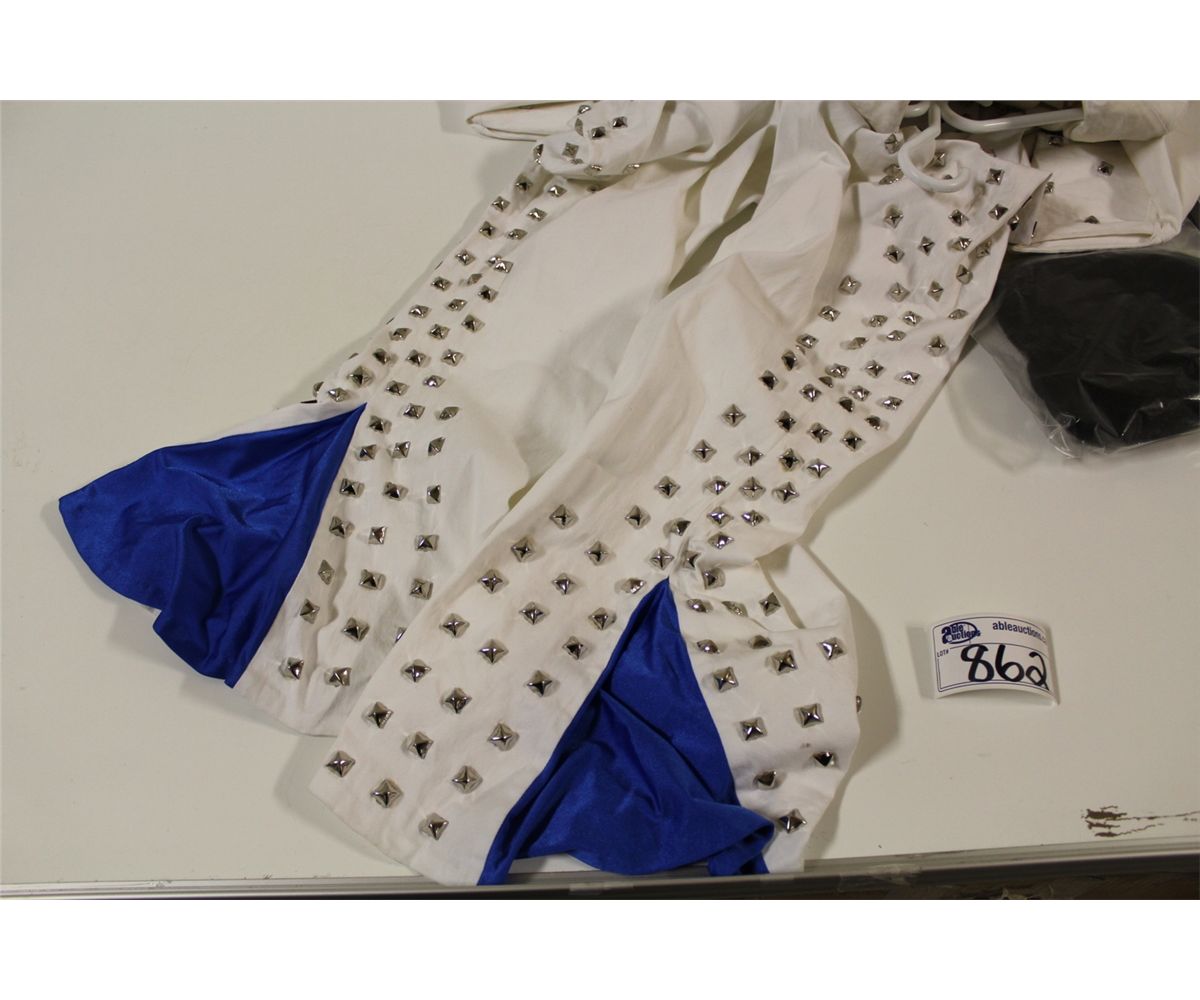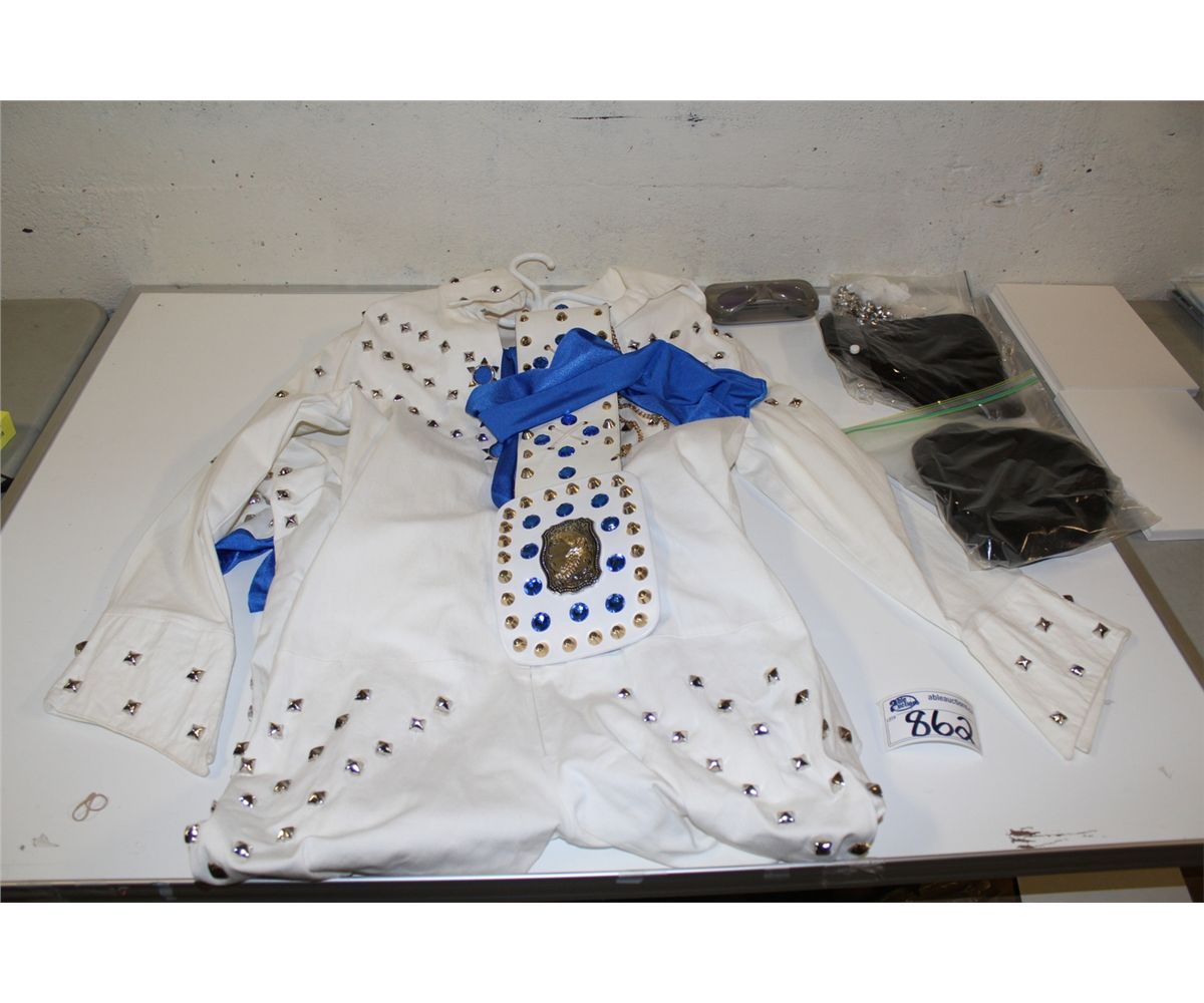 ELVIS PRESLEY COLLECTOR ITEMS AND JUMPSUIT INCLUDES CLOCK, COLLECTORS BOOK, MUSIC BOOK, LARGE FRAMED PHOTO, (68 COMEBACK SPECIAL) & RARE EARLY 70S LAKE TAHOE CONCERT RECORDING. ALSO INCLUDES PROFESSIONAL ELVIS IMPERSONATOR (WHITE) JUMPSUIT (33-34 LEG, 36-38 WAIST)A RARELY WORN SPARE THAT INCLUDES BELTS, GLASSES, SPARE STUDS AND NEW WIG IN PACKAGE PLUS SPARE WIG (BOOTS NOT INCLUDED).