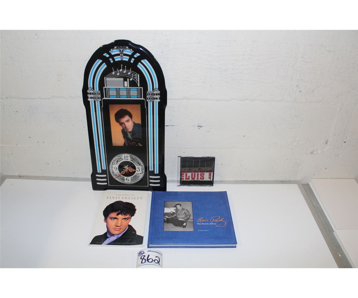 ELVIS PRESLEY COLLECTOR ITEMS AND JUMPSUIT INCLUDES CLOCK, COLLECTORS BOOK, MUSIC BOOK, LARGE