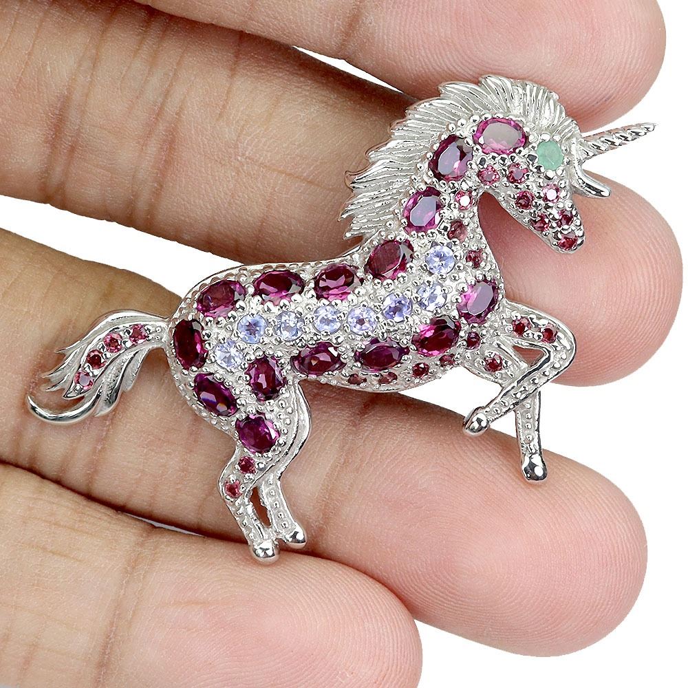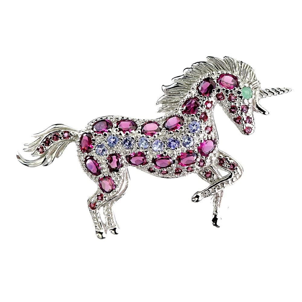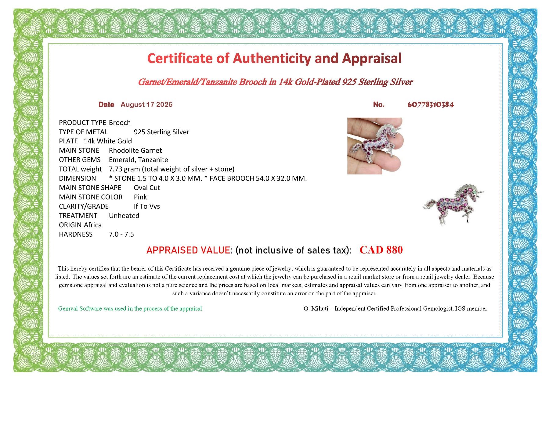 EMERALD, TANZANITE & RHODOLITE GARNET UNICORN BROOCH IN 14K WHITE GOLD-PLATED 925 STERLING SILVER APPRAISED REPLACEMENT VALUE CAD 880 – DIGITAL CERTIFICATE