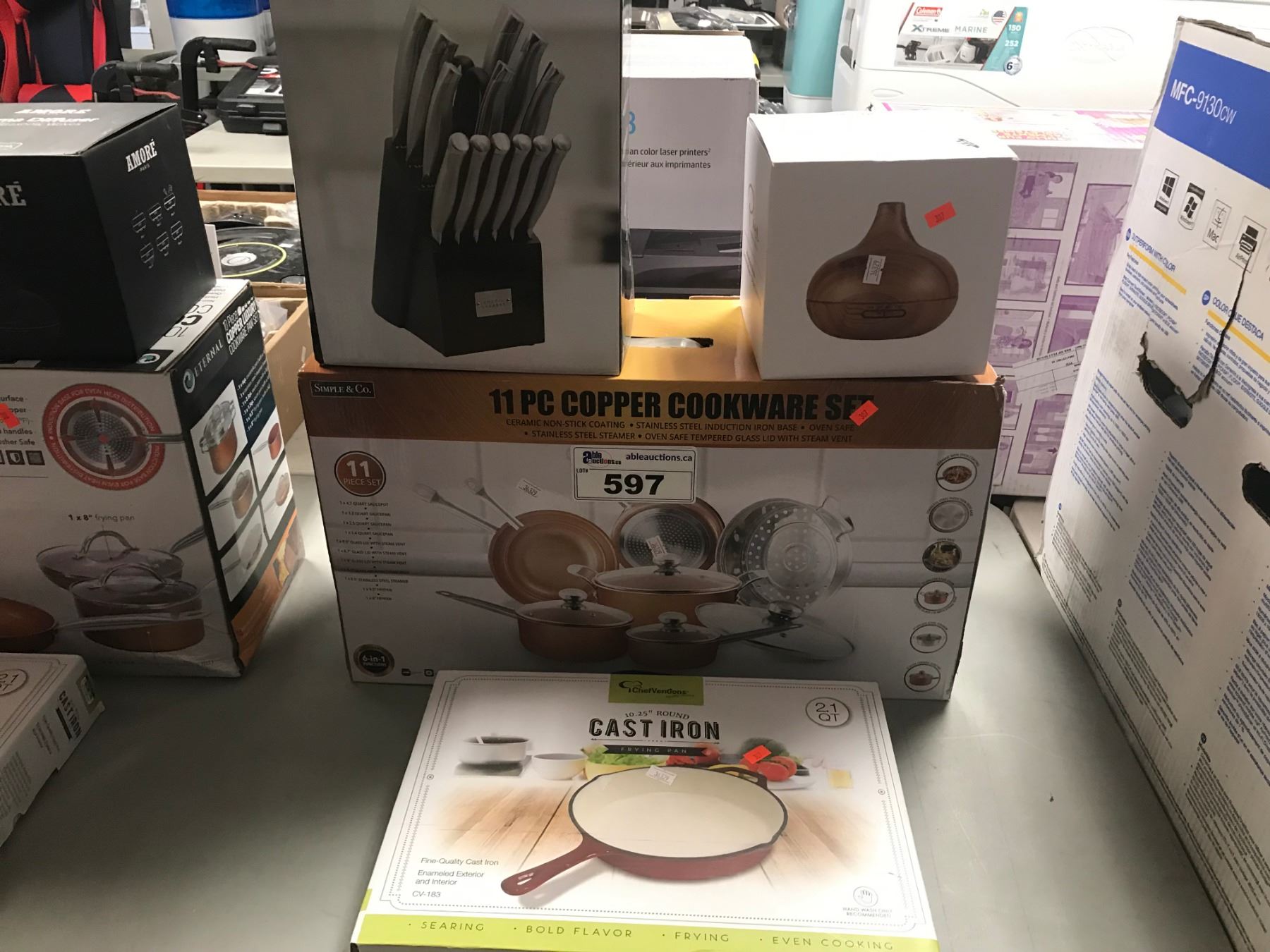 EMERIL LAGASSE KNIFE BLOCK SET, AROMA OIL DIFFUSER, COPPER COOKWARE SET, 10.25" CAST IRON PAN