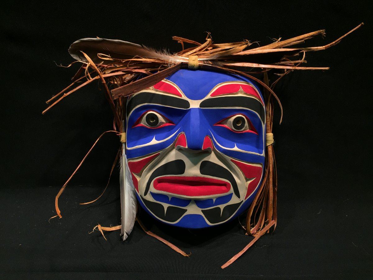 EMIL THIBERT,'MOON MASK',HAND CARVED CEDAR WITH CEDAR STRIPS AND FEATHERS , SOULTEAUX NATION B.C. , 13'' H X 12'' W