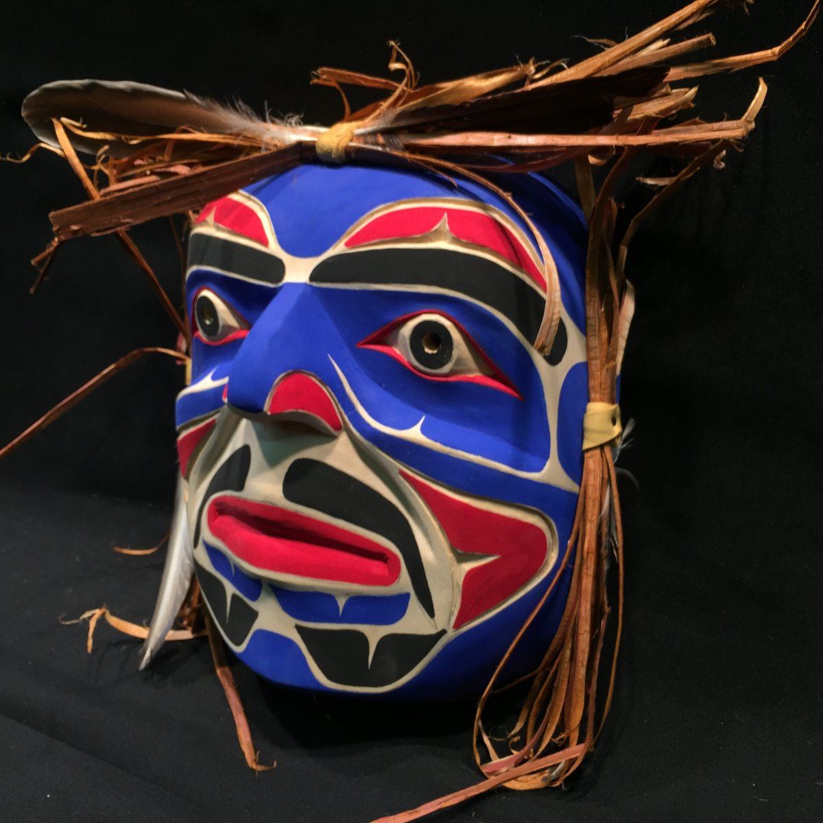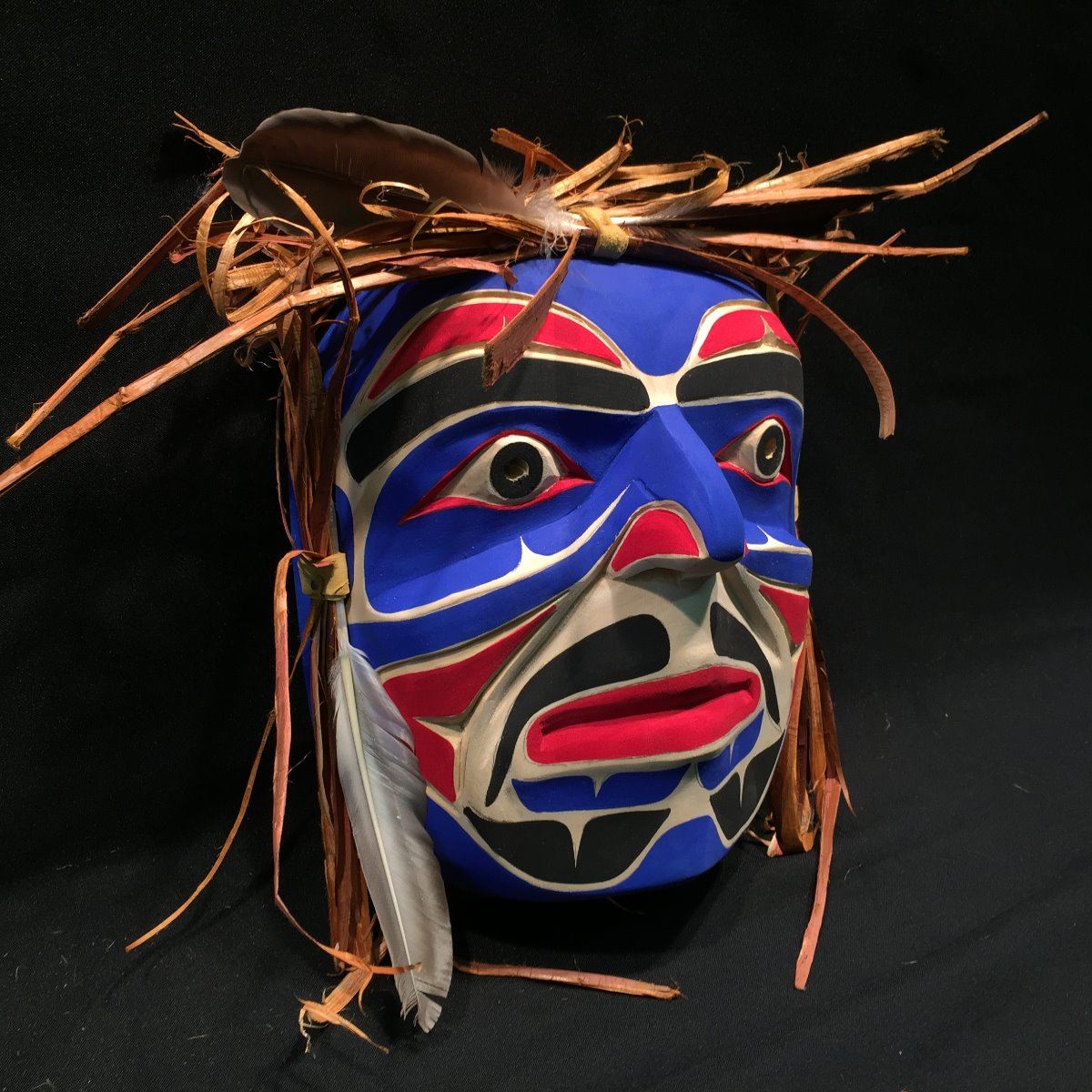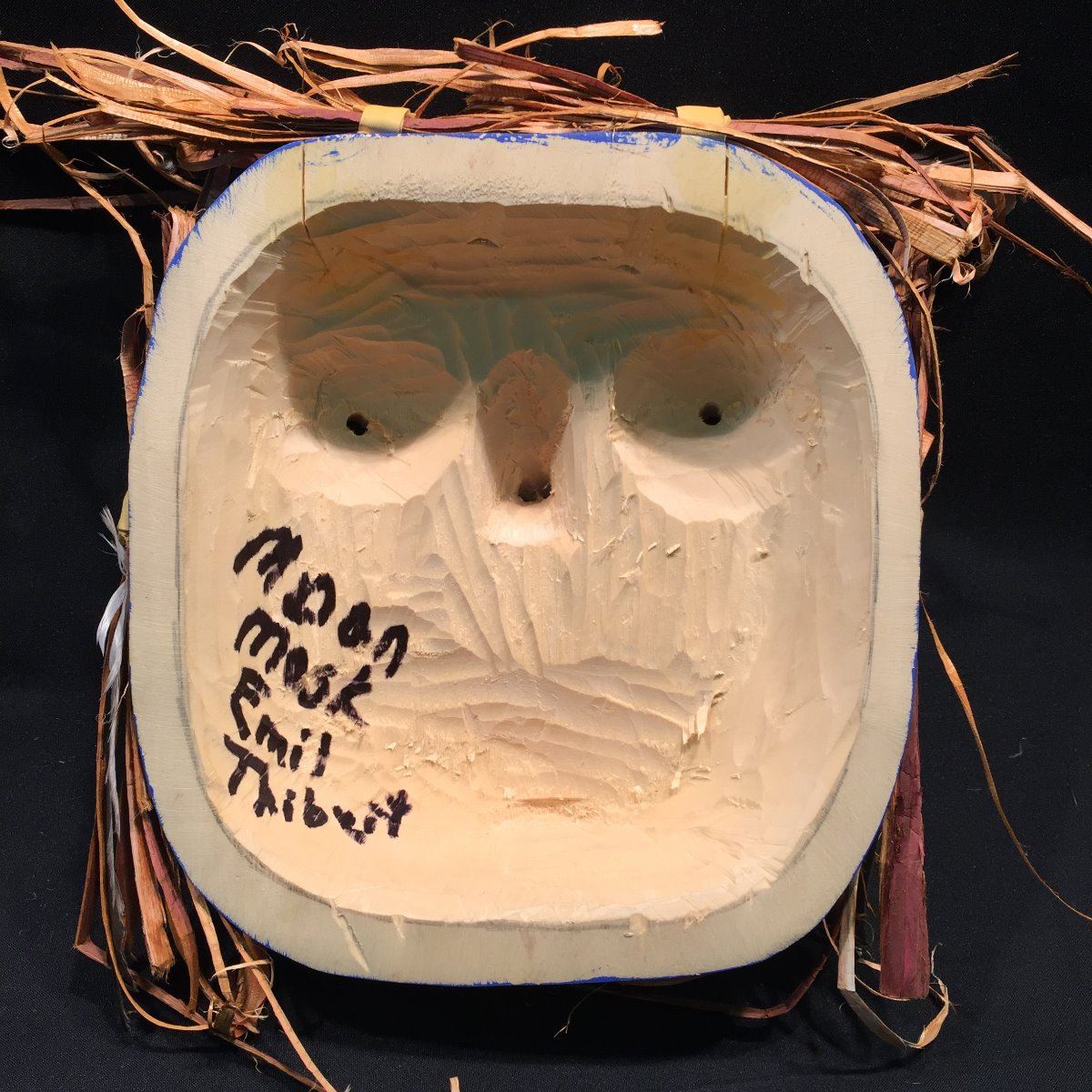 EMIL THIBERT, ''MOON MASK', HAND CARVED CEDAR WITH CEDAR STRIPS AND FEATHERS , SOULTEAUX NATION