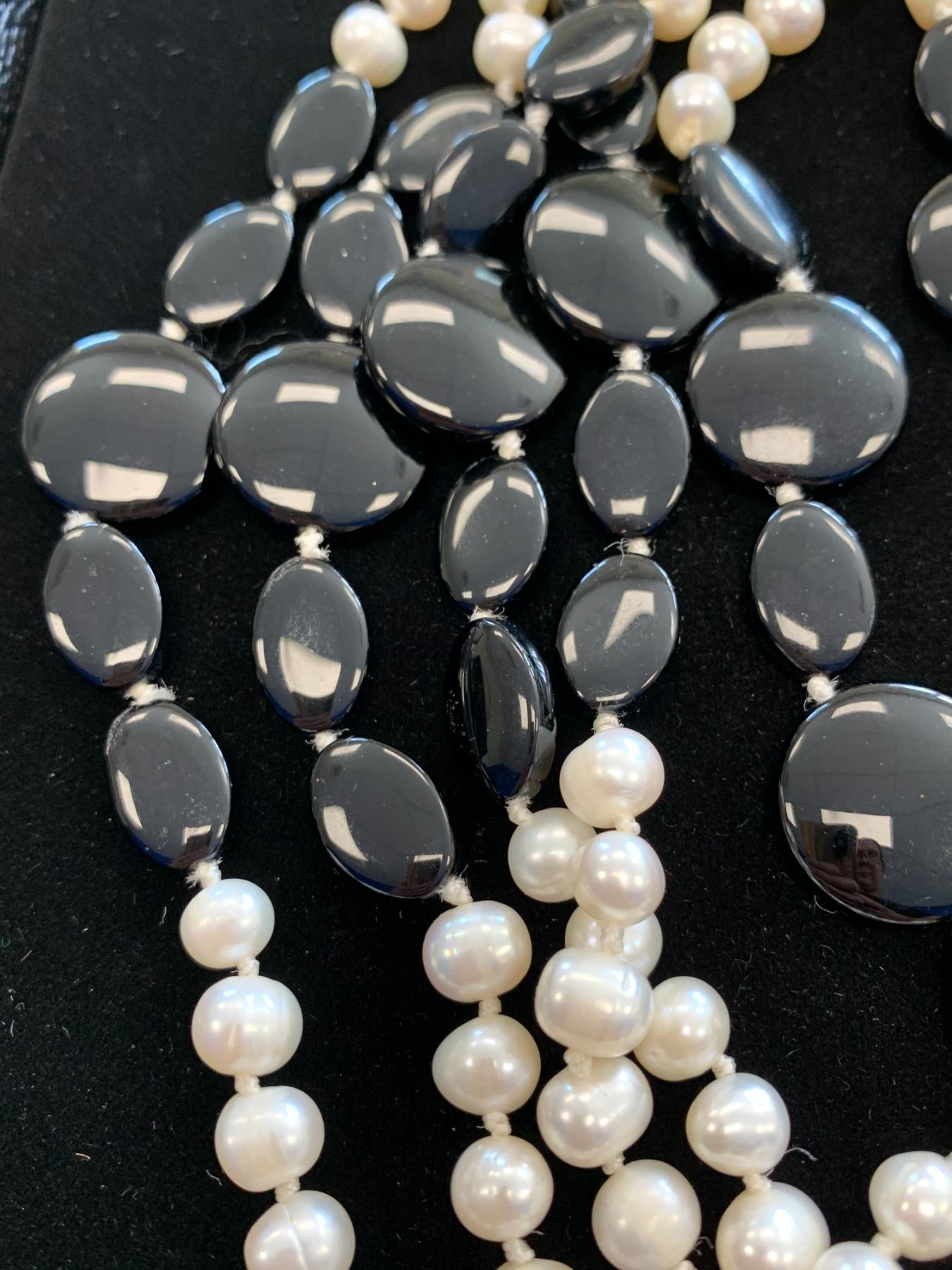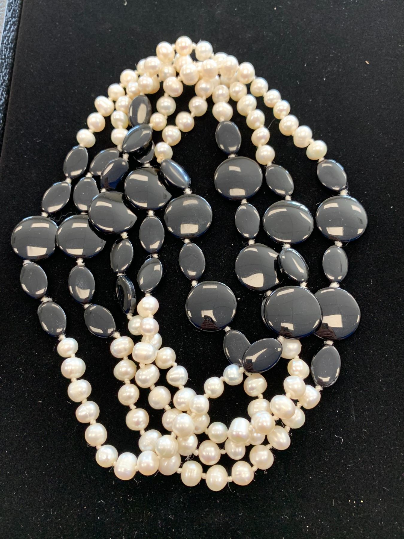 ENHANCED BLACK AGATE AND FRESHWATER PEARL ENDLESS NECKLACE 64"