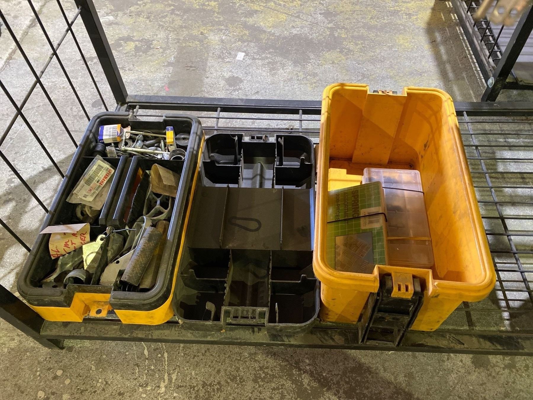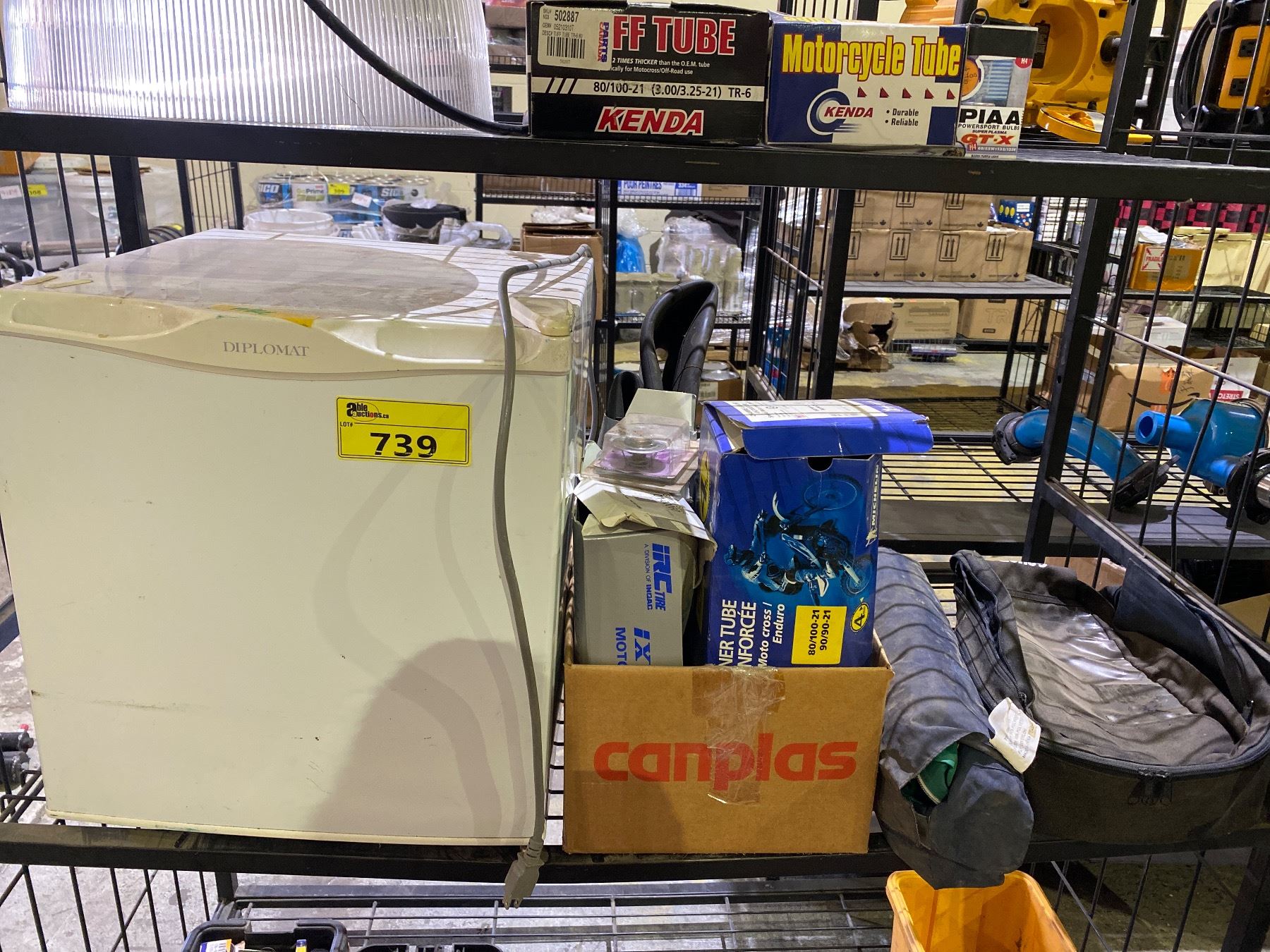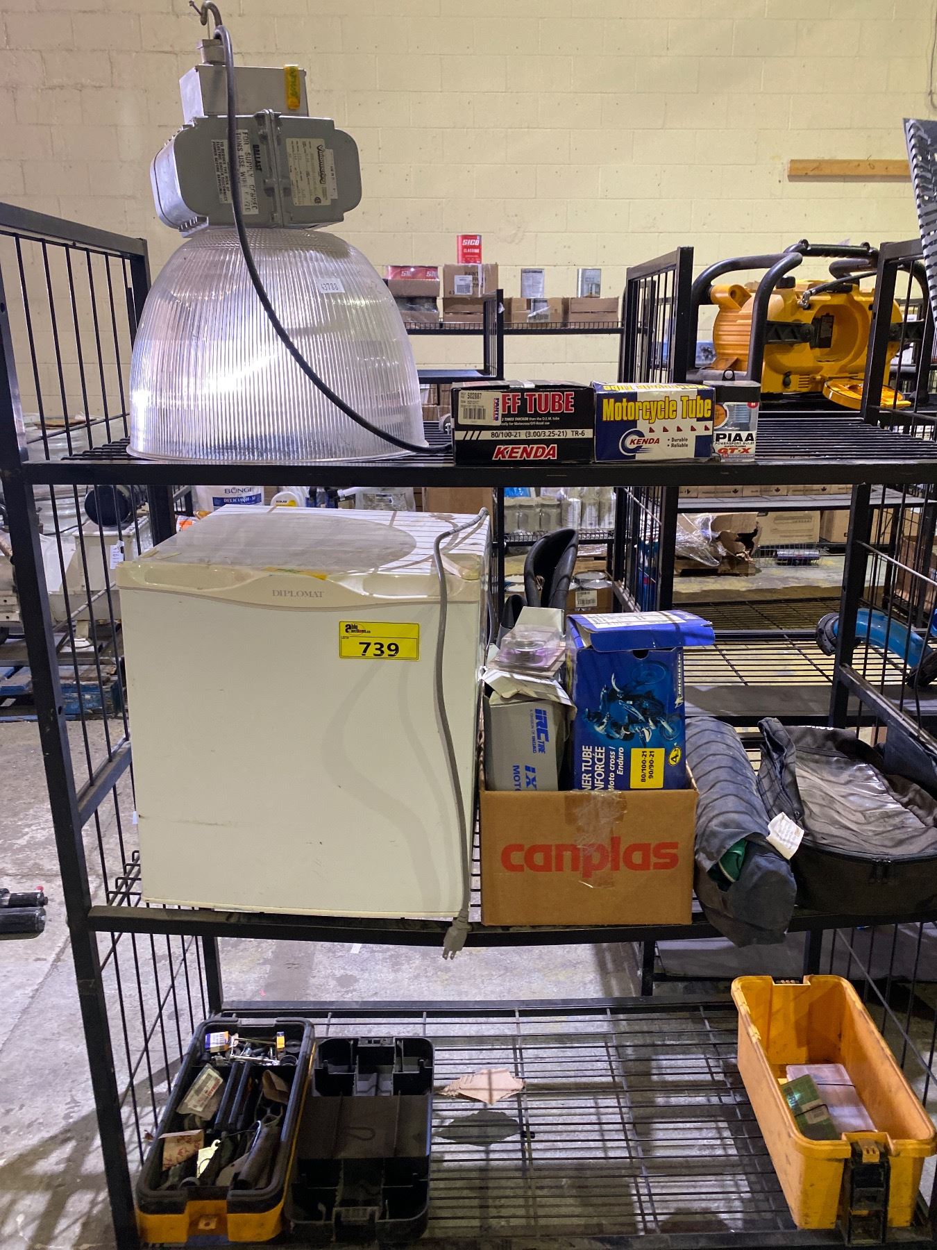 ENTIRE RACK (RACK NOT INCLUDED) OF ASSORTED MOTORCYCLE PARTS, MINI FRIDGE, TOOLS AND MORE