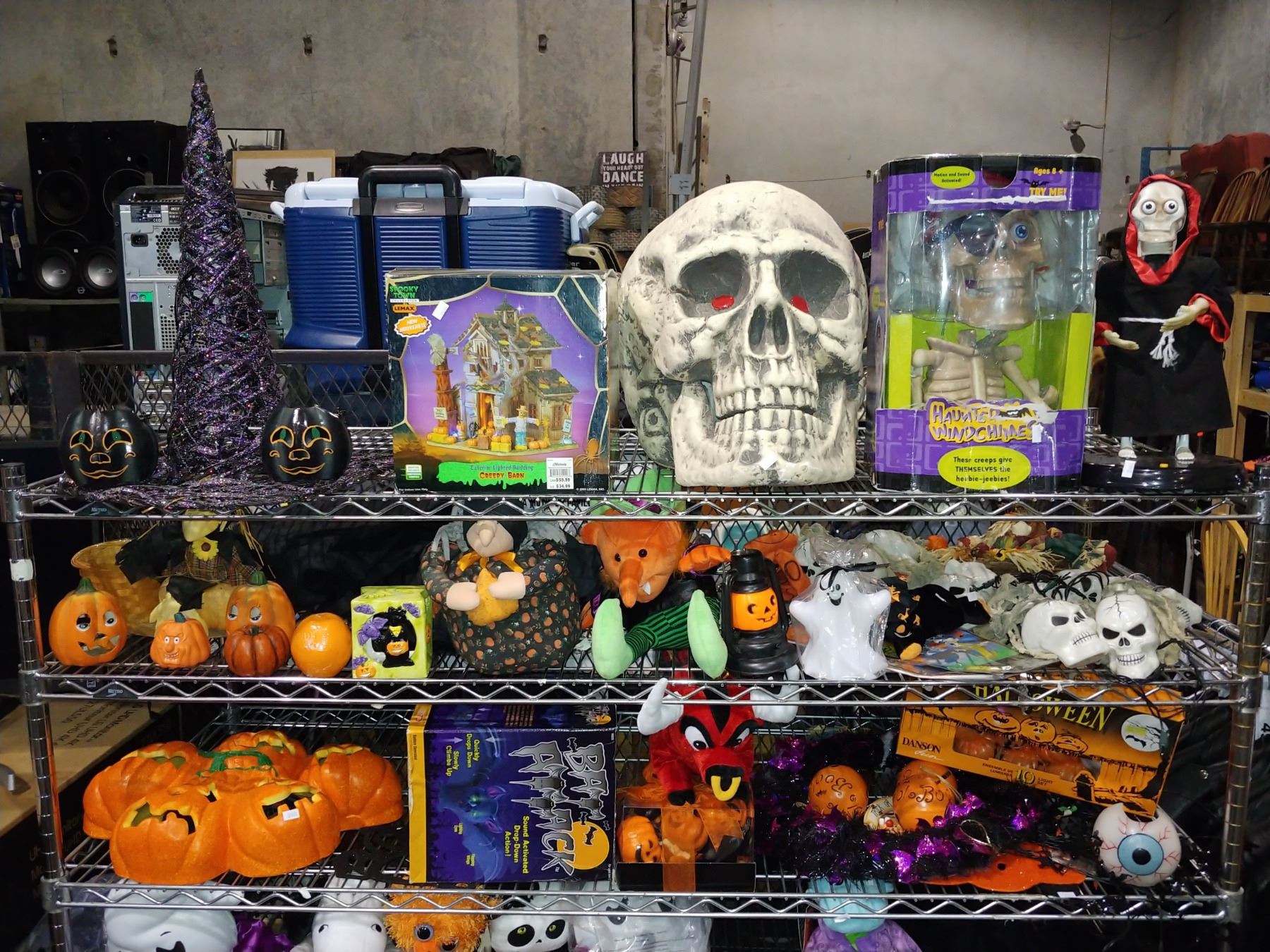 ENTIRE ROLLING RACK FILLED WITH HALLOWEEN DECOR INCLUDING HALLMARK / CARLTON FIGURES, HANGING SKELETONS, PUMPKIN THEMED DECOR AND MUCH MORE - RACK NOT INCLUDED
