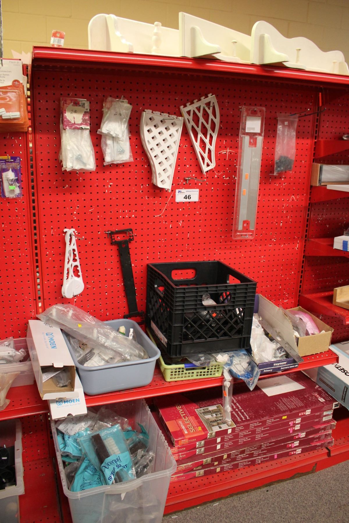 ENTIRE SHELF OF ASSORTED CLOSET HARDWARE, CABINET DOORS, AND MORE