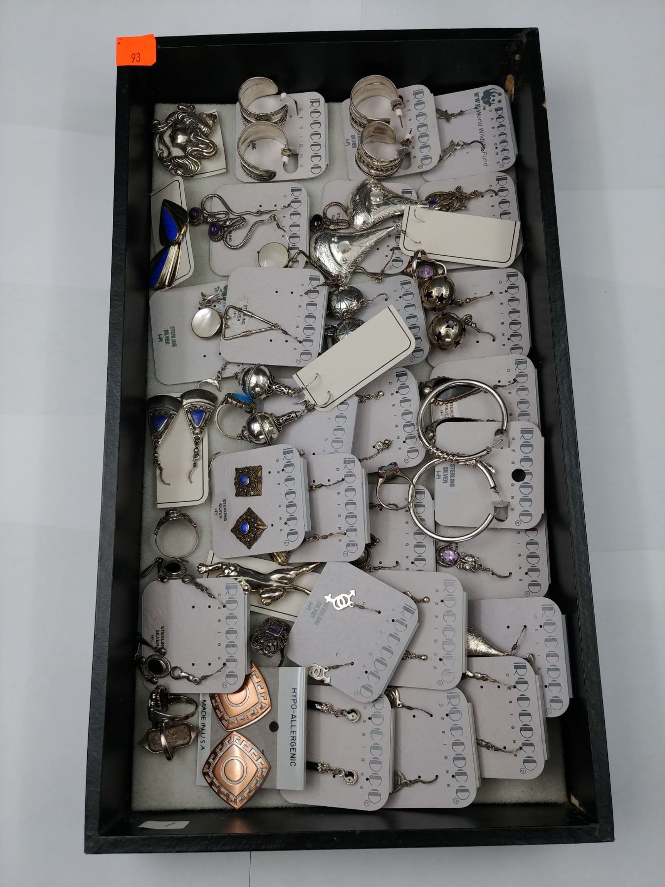 ENTIRE TRAY OF JEWELLERY INCLUDING .925 STERLING SILVER EARRINGS, BROOCHES, RINGS AND MORE