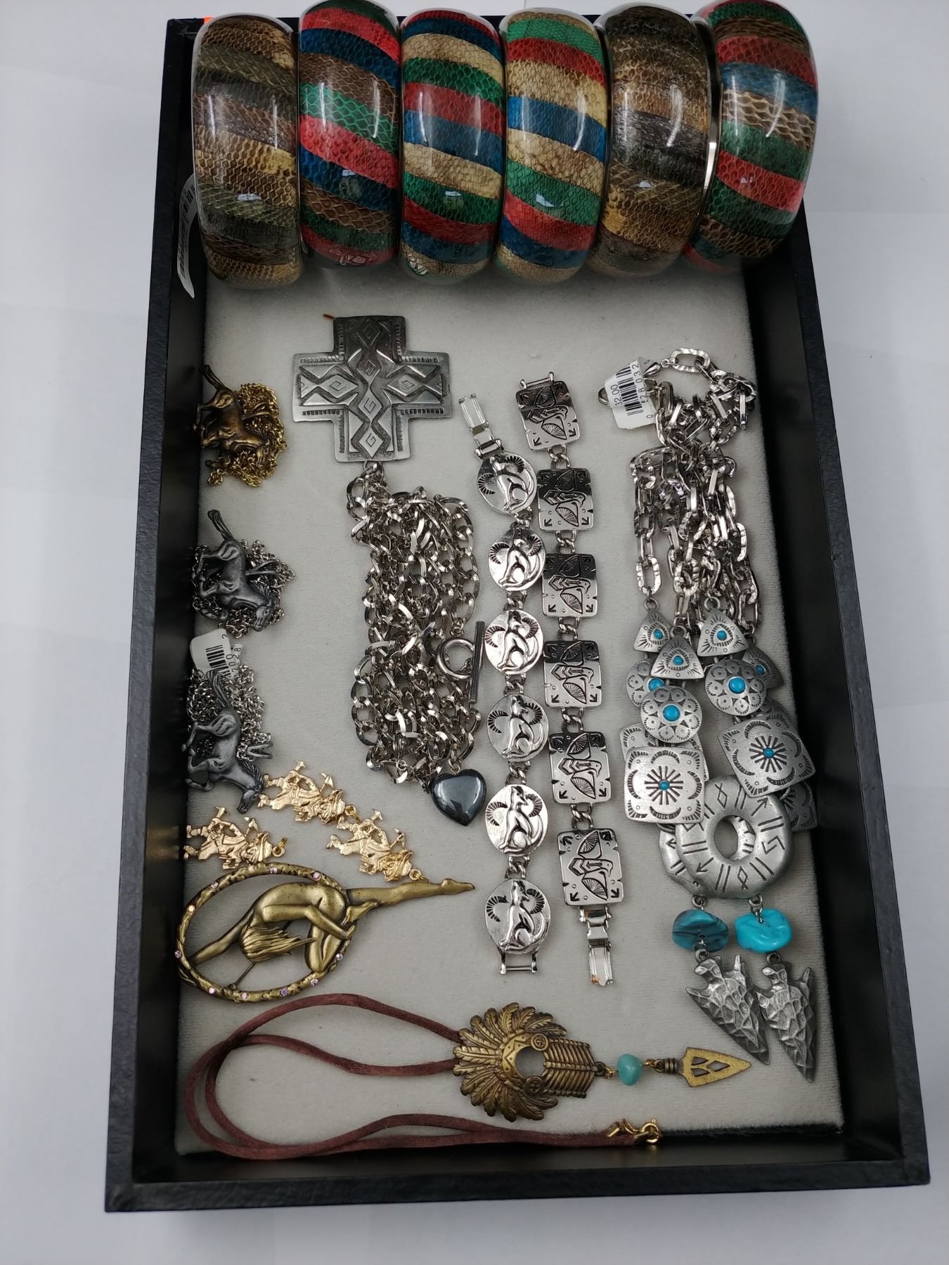 ENTIRE TRAY OF JEWELLERY INCLUDING BANGLES, NECKLACES, PENDANTS, BROOCH AND MORE