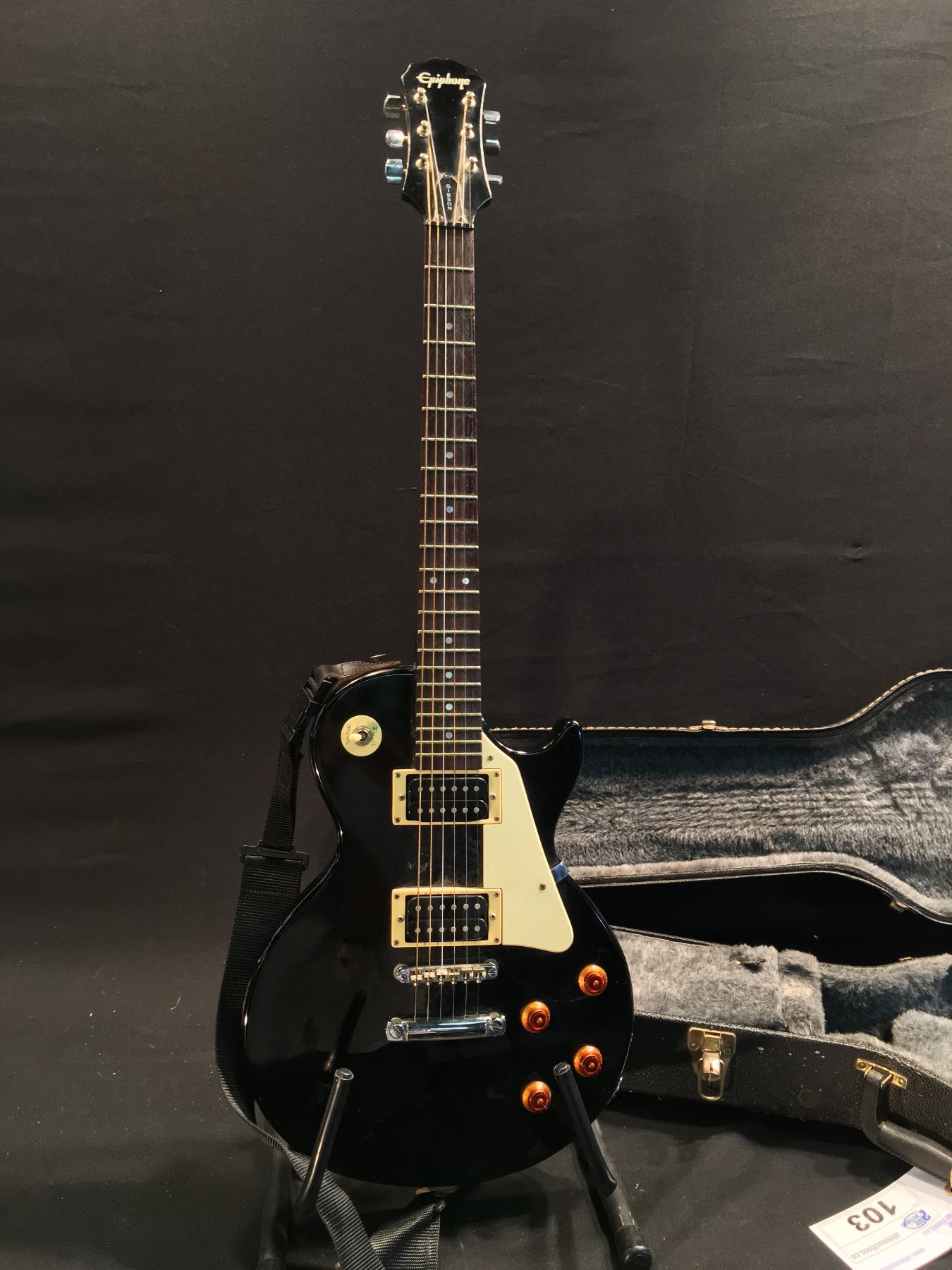 EPIPHONE LES PAUL GUITAR, WITH TWO HUMBUCKER PICKUPS, PICK GUARD, TWO TONE AND TWO VOLUME CONTROLS, THREE POSITION PICKUP SELECTOR SWITCH, SERIAL NUMBER S94050498, COMES WITH HARD SHELL CASE