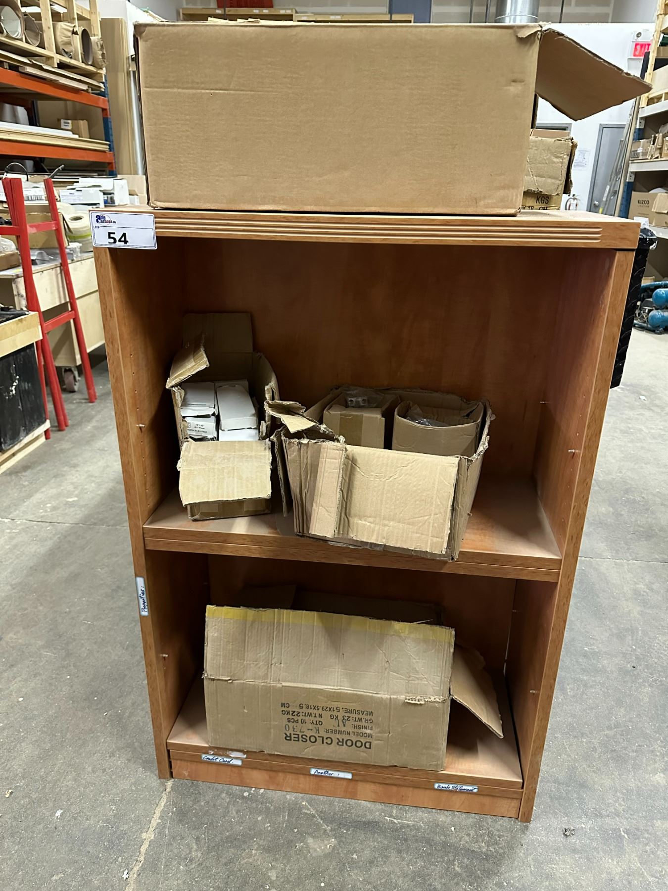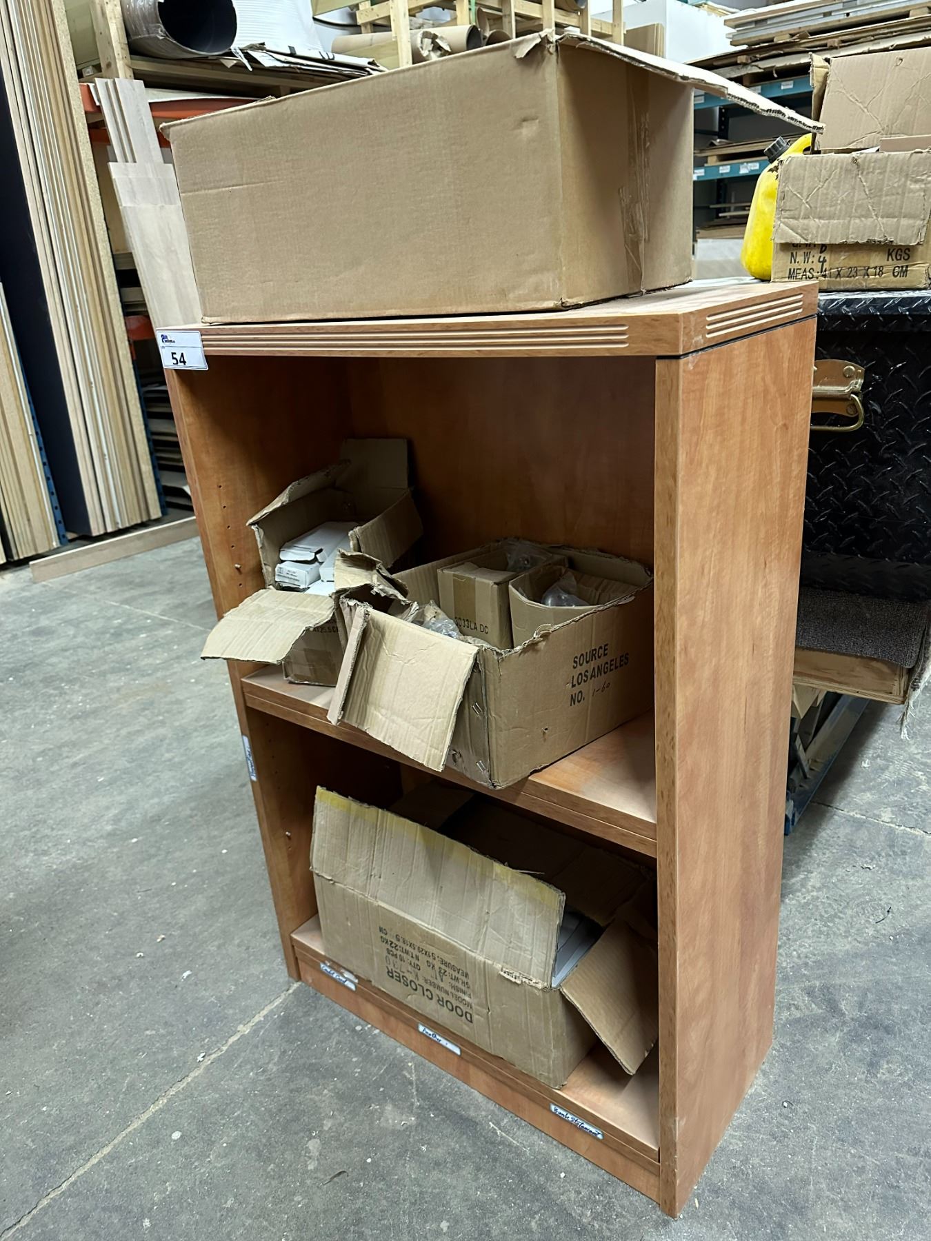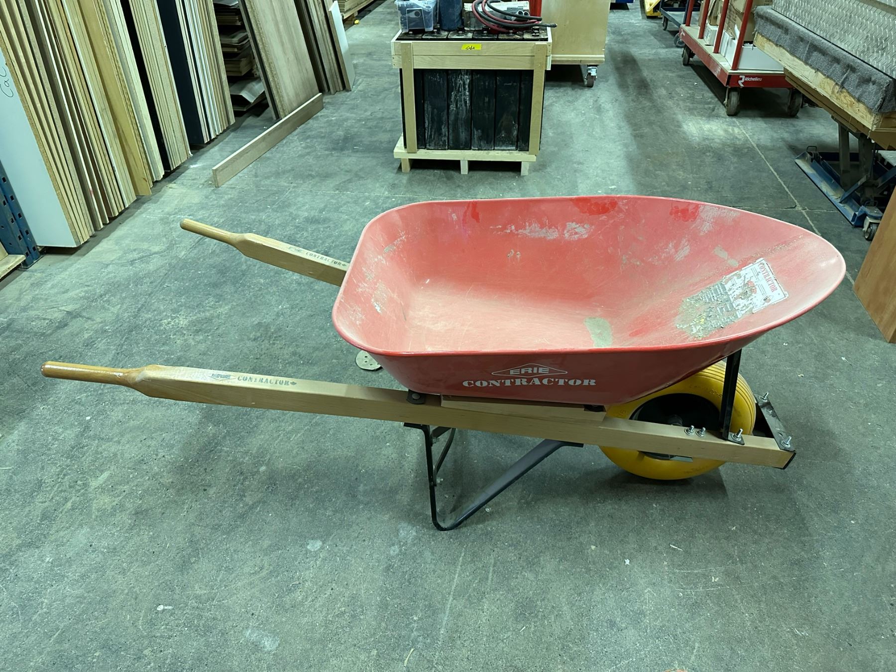 ERIE RED INDUSTRIAL WHEELBARROW AND LIGHT WOOD 5 TIER SHELF WITH CONTENTS