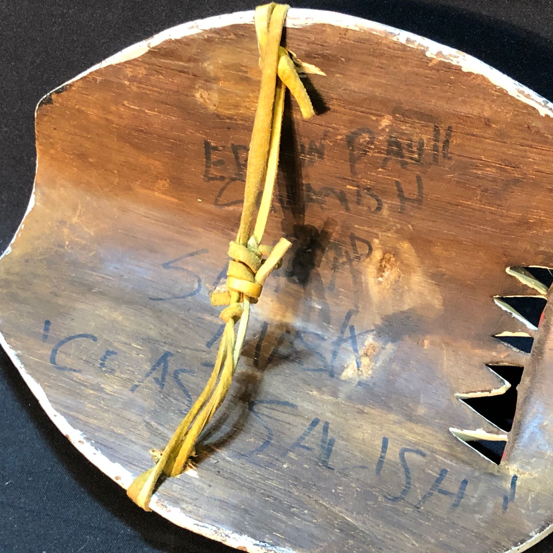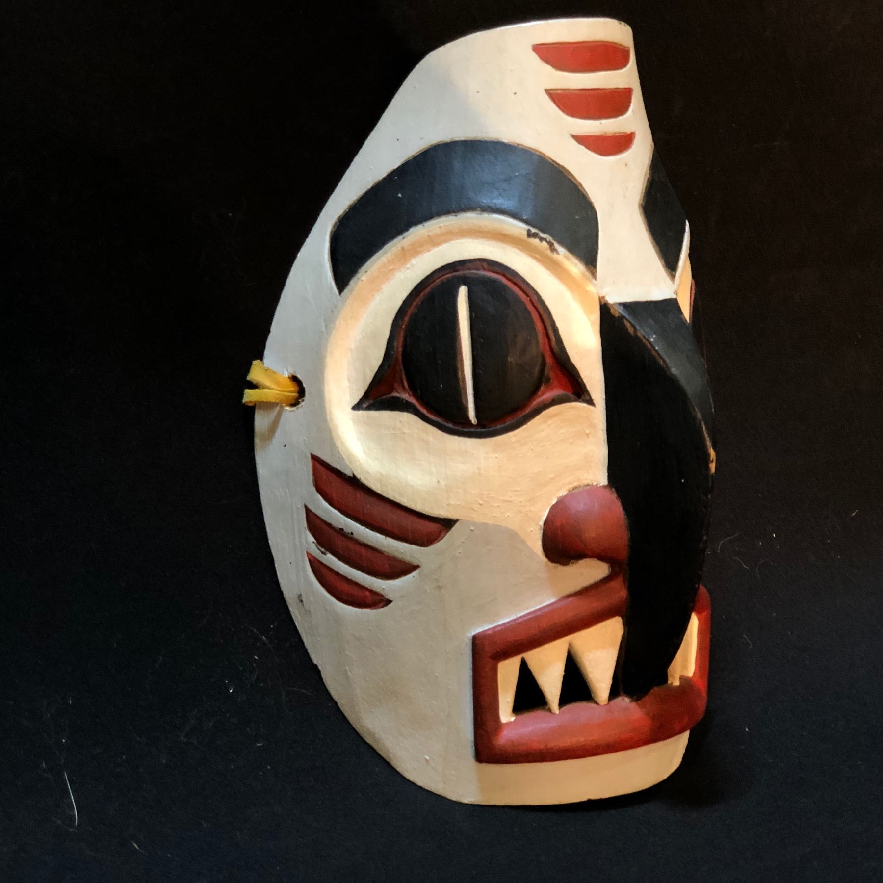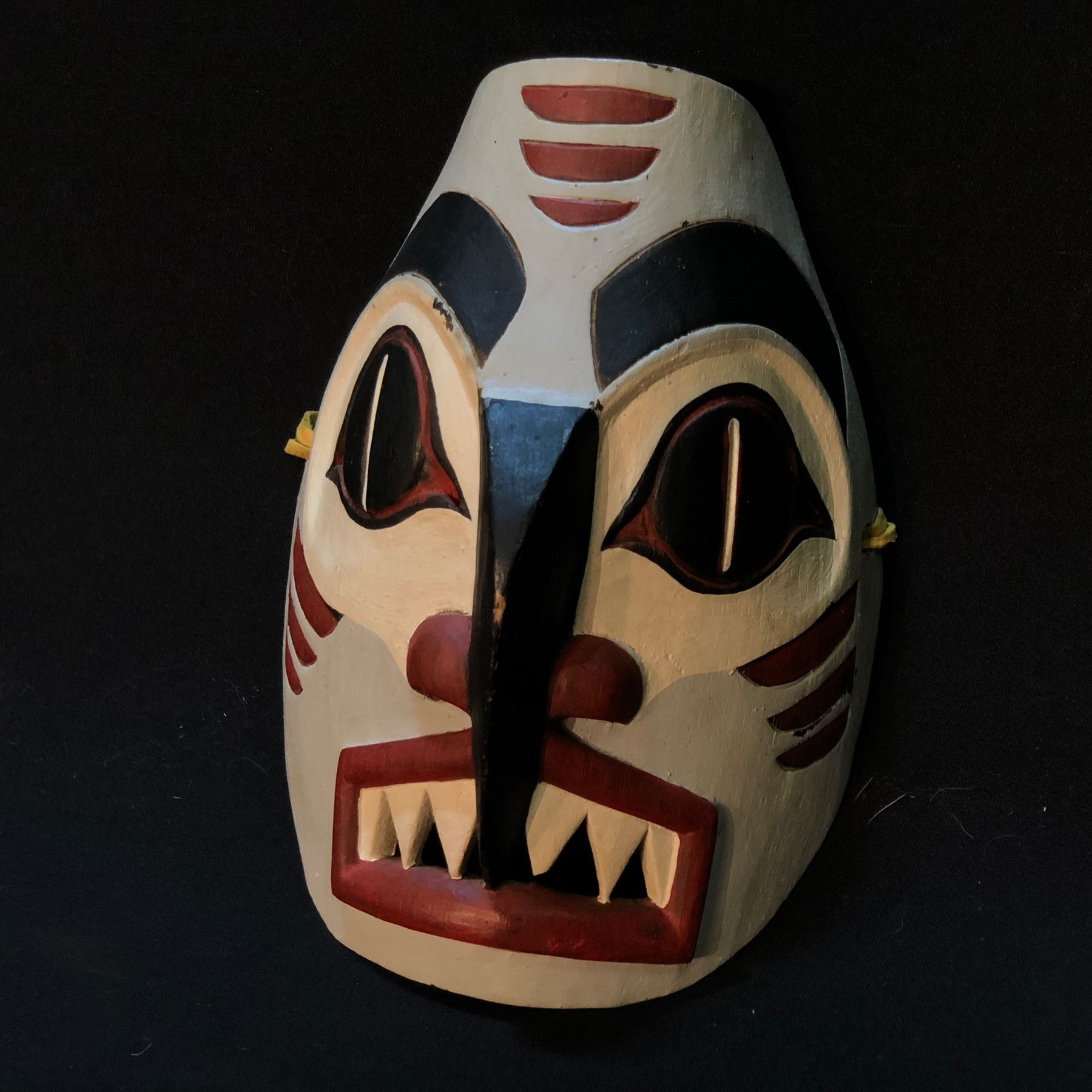 ERWIN PAUL OF SQUAMISH FIRST NATION "SAINDA" HAND CARVED AND PAINTED MASK, APPROX. 10'' TALL, SIGNED ON BACK BY ARTIST