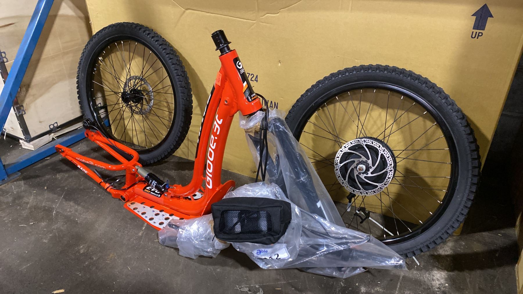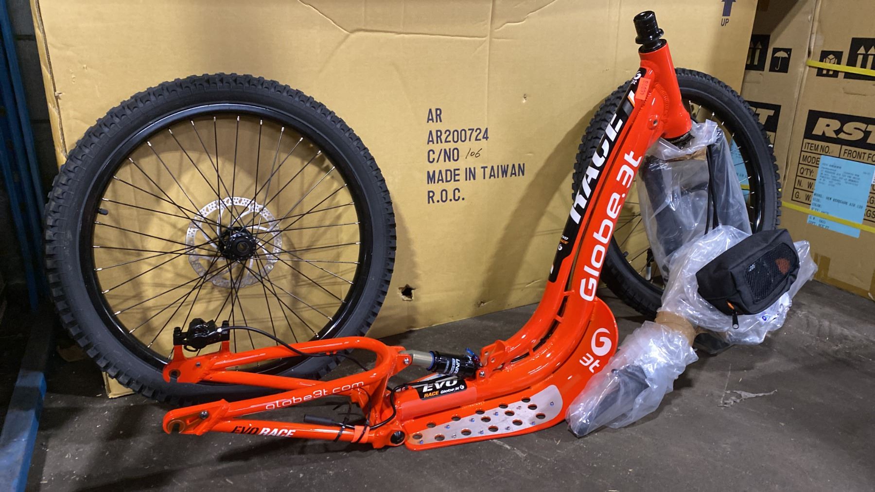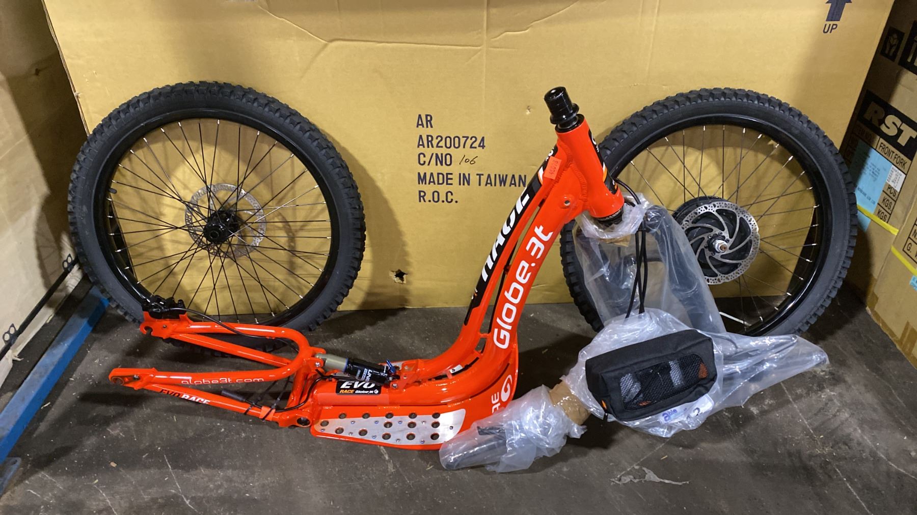 EVO RACE GLOBE 3T ORANGE STAND UP ELECTRIC FULL SUSPENSION OFF ROAD SCOOTER *NO KEY, NO CHARGER* *DISMANTLED, MAY NEED PARTS*