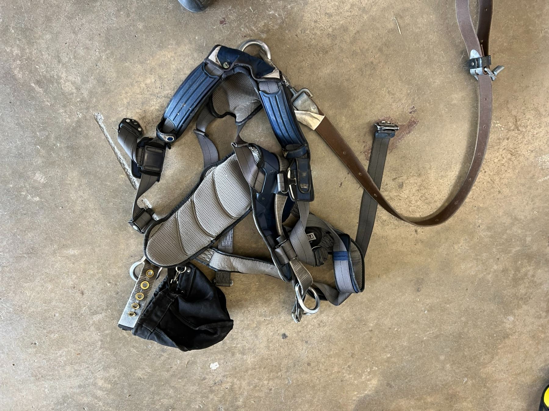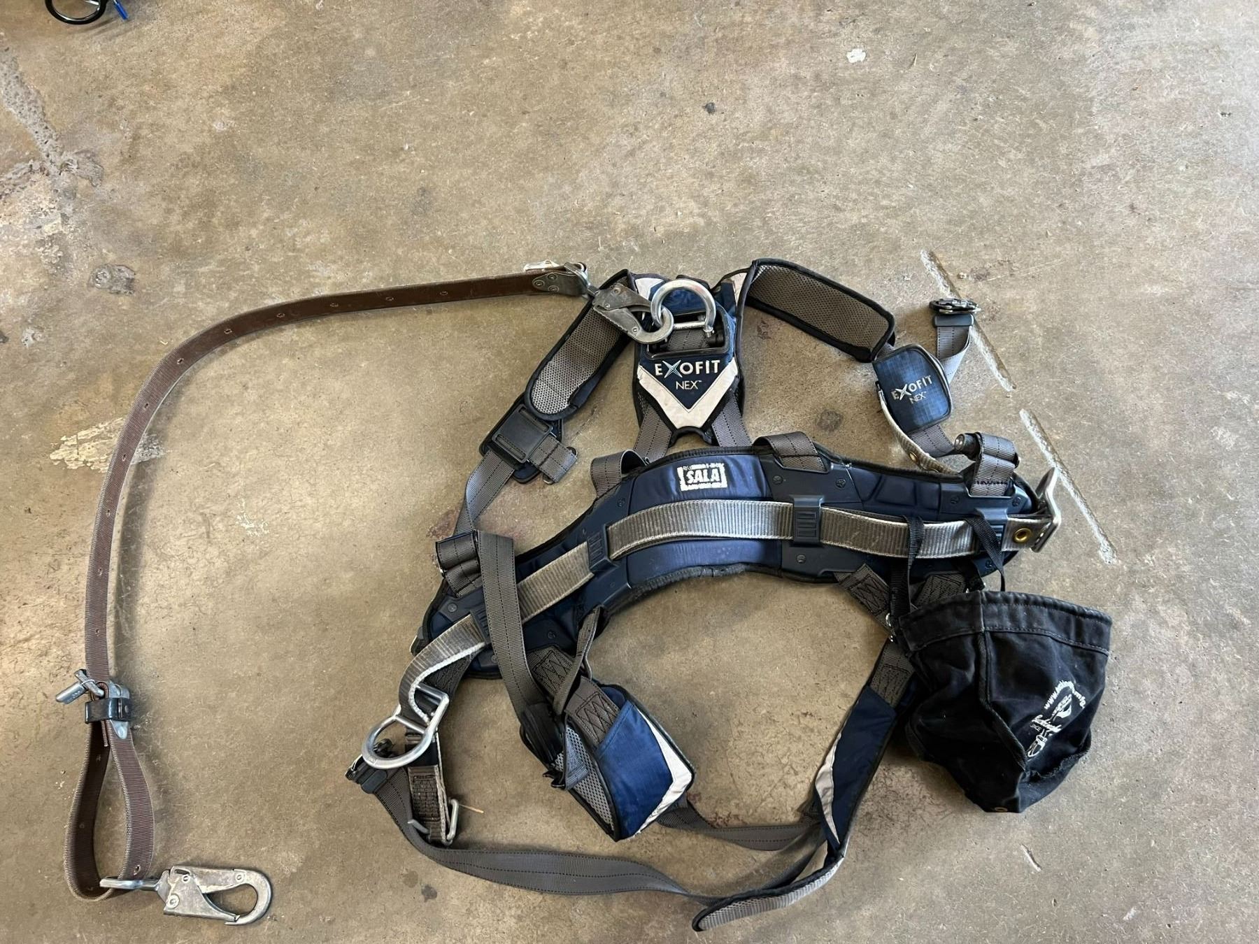 EXOFIT NEX DBI SALA CLIMBING SAFETY HARNESS. WITH TOOL POUCH & SAFETY STRAP