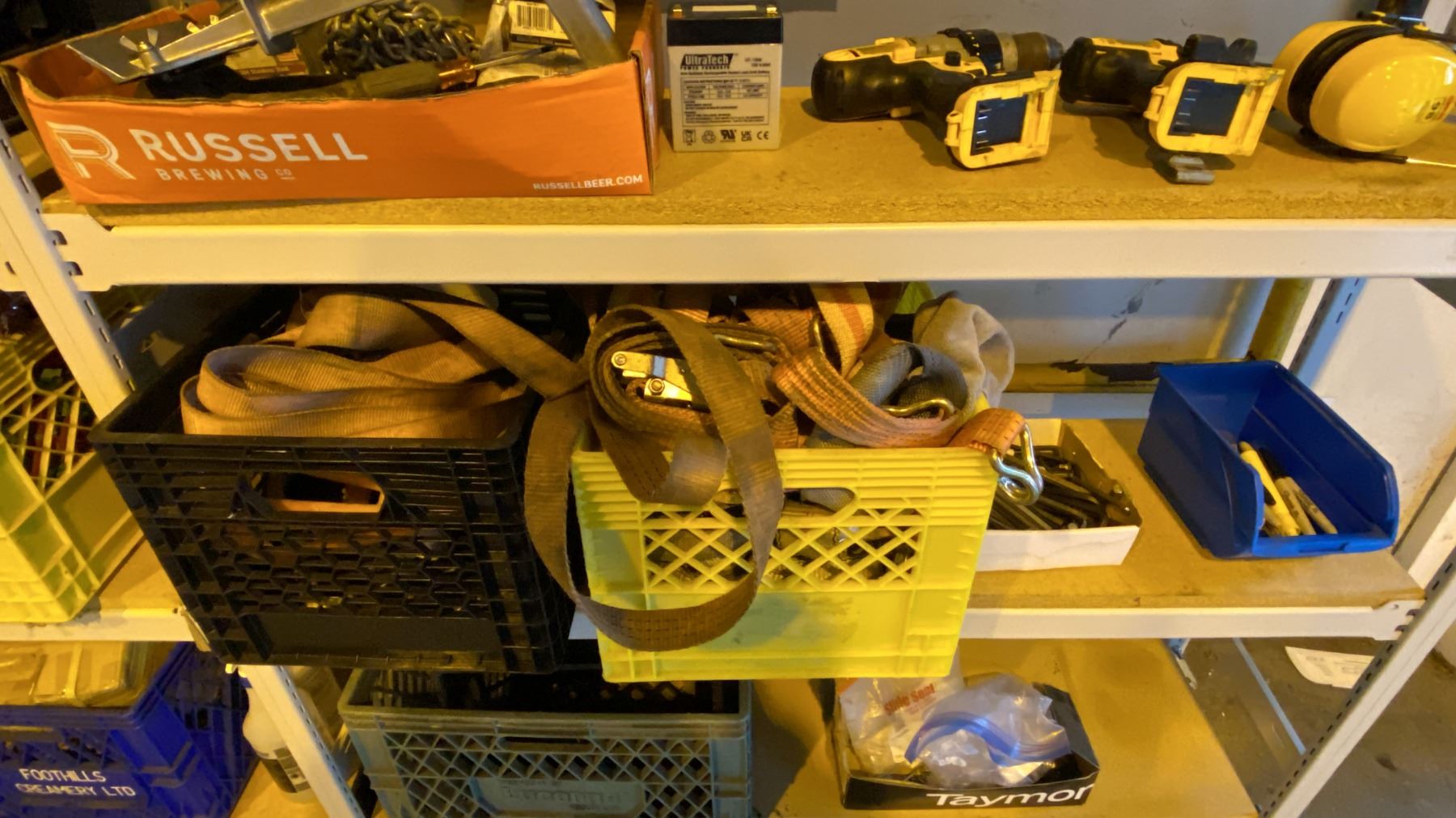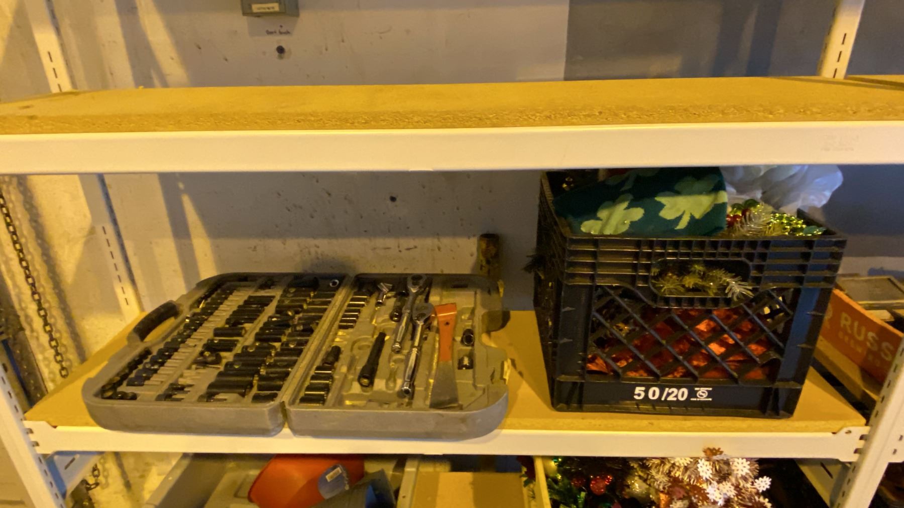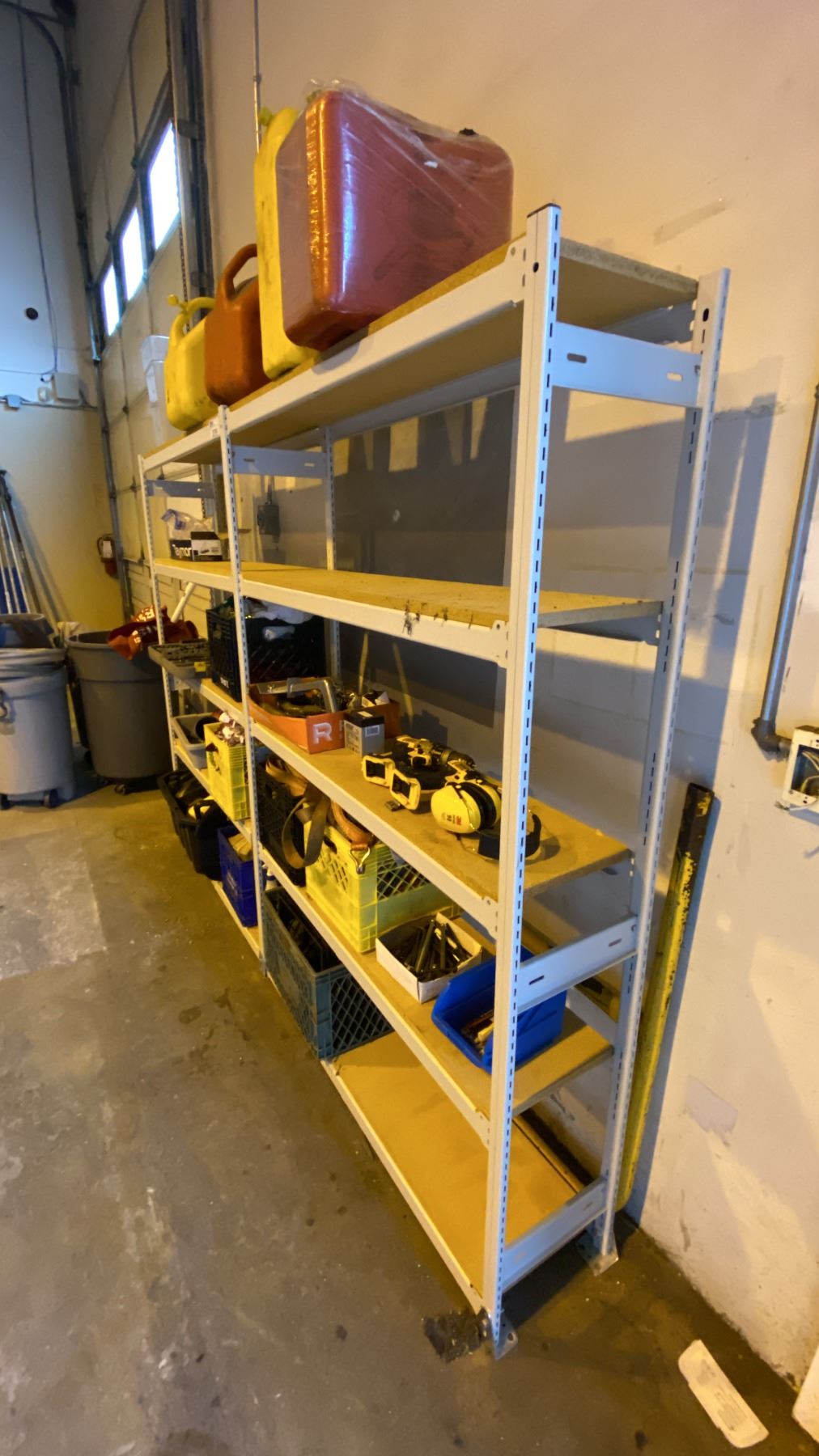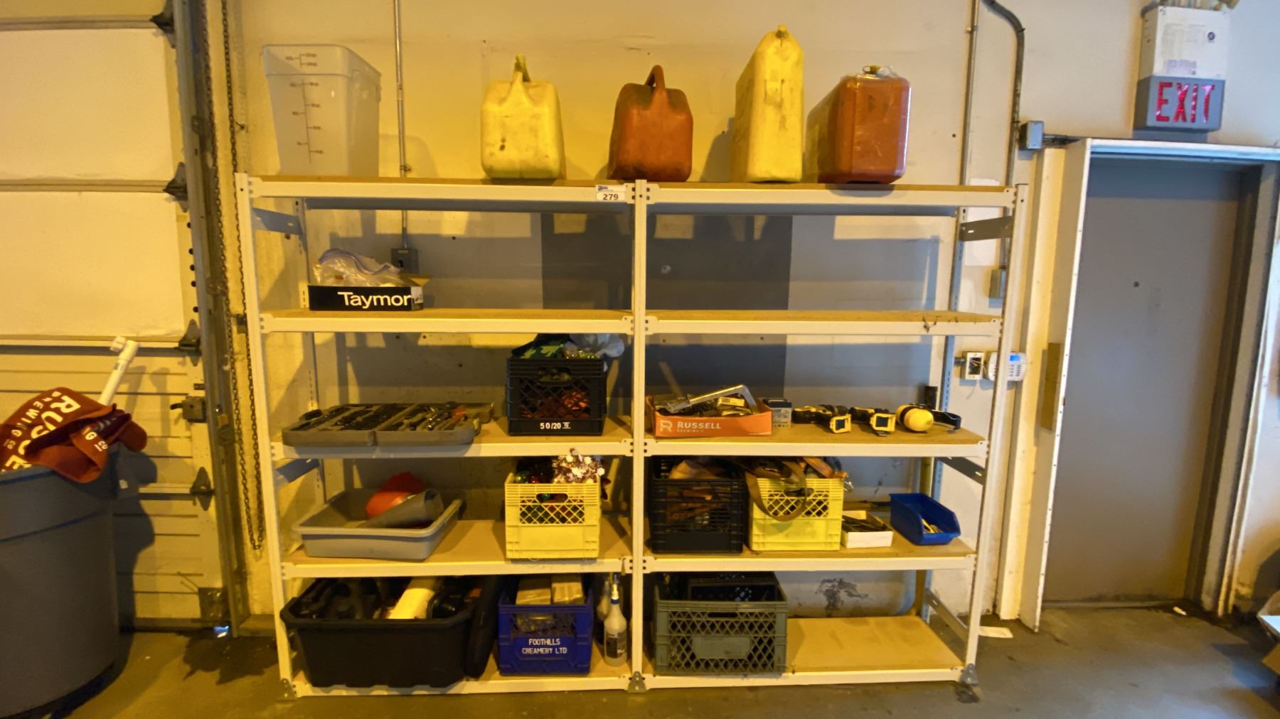 EZ RECK SHELVING SYSTEM AND CONTENTS - TOOLS AND ASSORTED MISCELLANEOUS ITEMS APPROX. 101" ACROSS X 13" WIDE X 72" HIGH