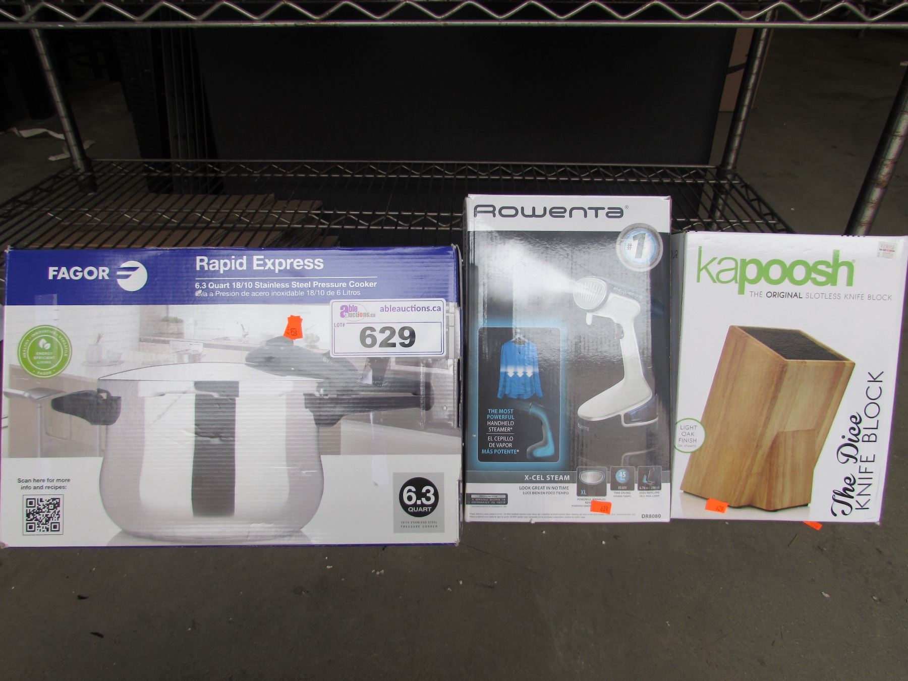 FAGOR RAPID EXPRESS 6.3 QUART STAINLESS PRESSURE COOKER/ROWENTA X-CEL STEAM MACHINE MODEL DR8080/THE DICE KNIFE BLOCK