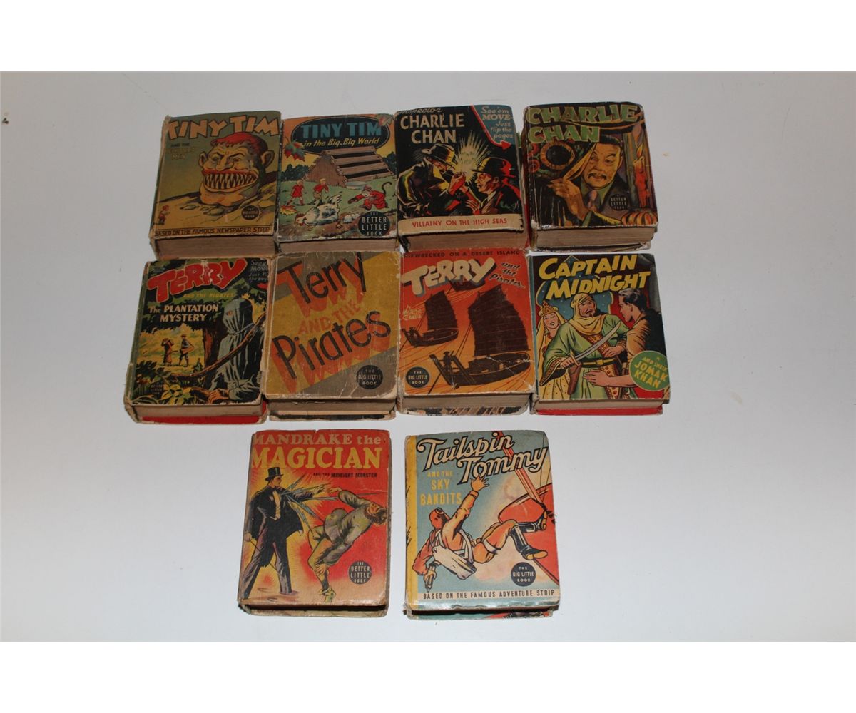FAMOUS COMIC & NEWSPAPER STRIP ADAPTED BIG LITTLE BOOKS LOT OF 10 (1935-46) INCL. CHARLIE CHAN X2 CAPTAIN MIDNIGHT, TERRY AND THE PIRATES X2, TINY TIM X2, MANDRAKE THE MAGICIAN & TAILSPIN TOMMY, LOW TO LOWER MID GRADE AVG. ALL COMPLETE