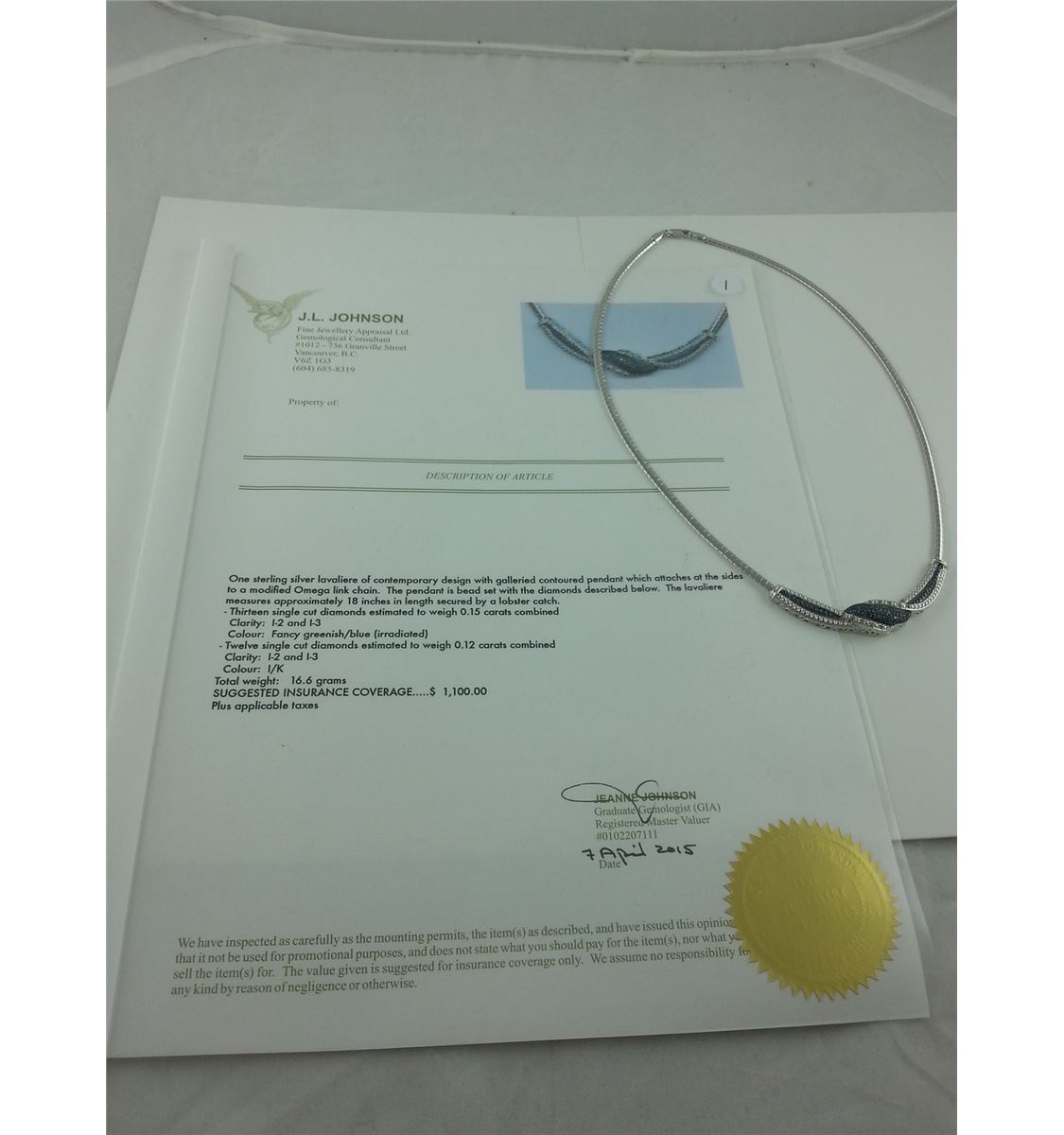 FANCY BLUE AND WHITE DIAMOND QUARTER CARAT TWIST NECKLACE. 25 DIAMONDS. INCLUDES $1100 GEMOLOGIST APPRAISAL