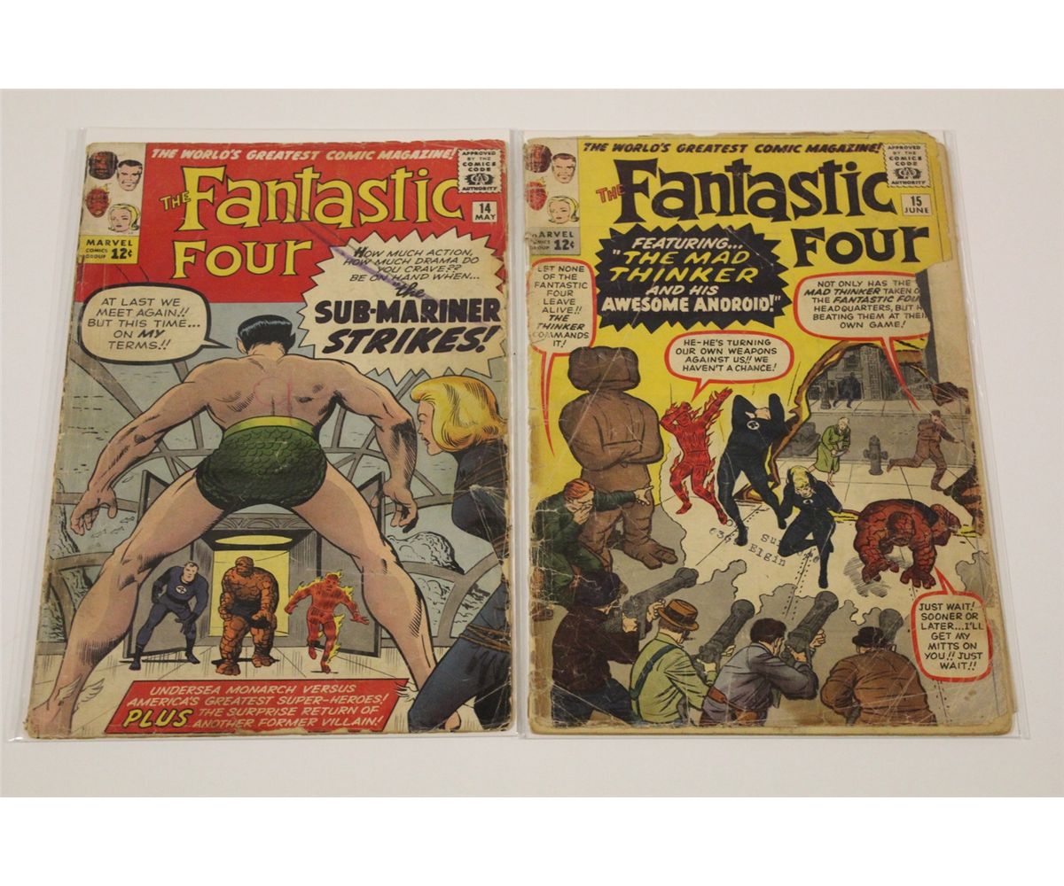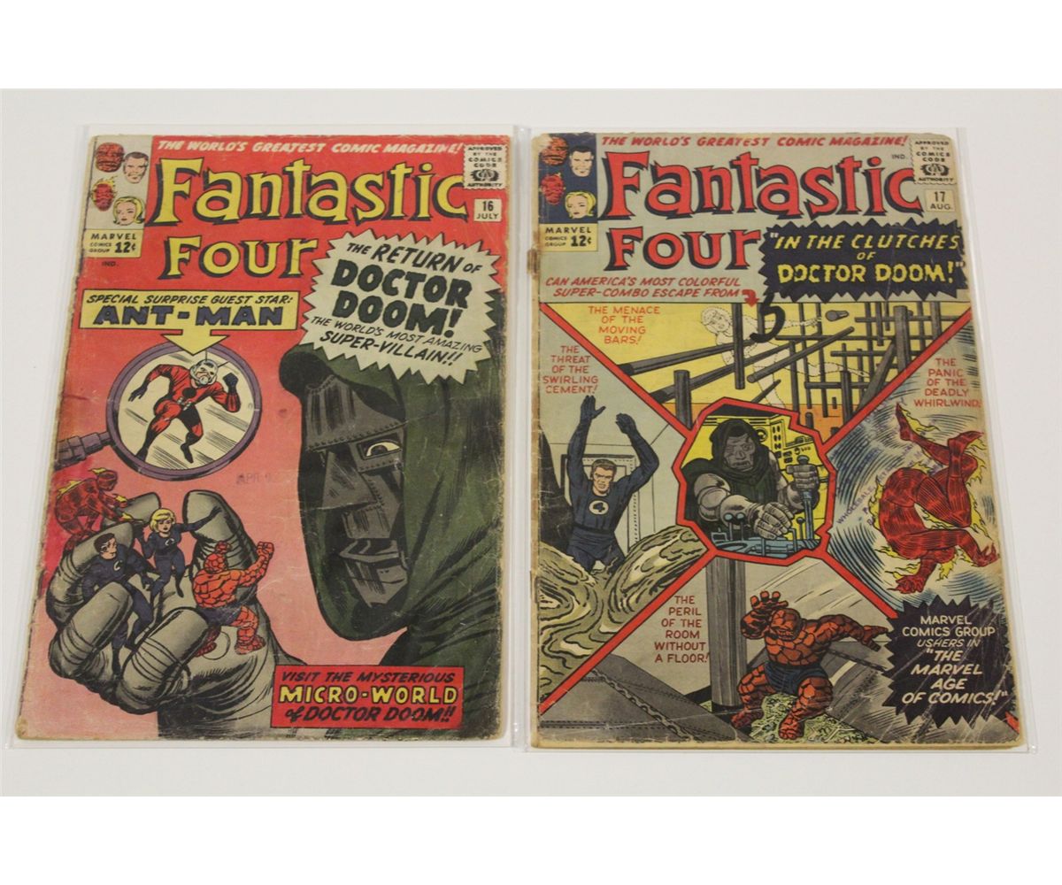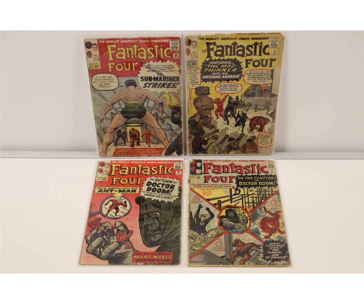 FANTASTIC FOUR #14, 15, 16 & 17 (1963) SILVER AGE RUN OF 4 EARLY FF'S - #16 - 1ST ANT-MAN X-OVER, CLASSIC KIRBY COVER. LOWER GRADE AVERAGE BUT STRUCTURALLY SOUND, ALL 4 EXCEPT #15 HAVE ATTACHED COVERS & CF WITH NO PIECES OUT, ALL SOLID, SUPPLE & COMPLETE COPIES.