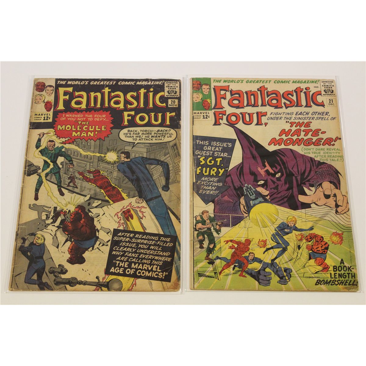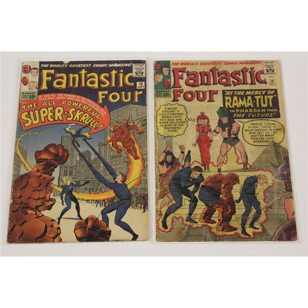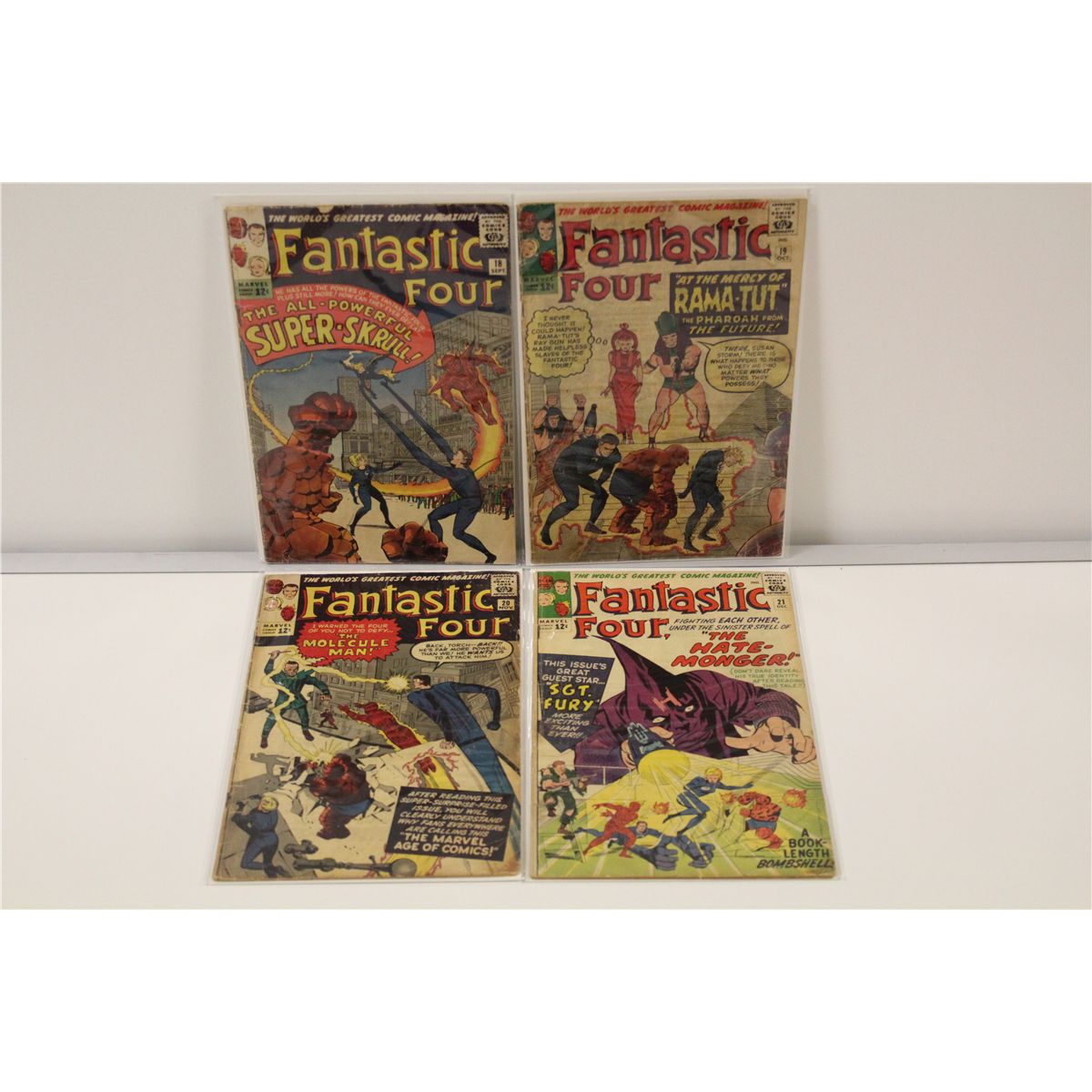 FANTASTIC FOUR #18, 19, 20 & 21 (1963) SILVER AGE RUN OF 4 EARLY FF'S - #18 - ORIGIN & 1ST APP. SUPER SKRULL, #21 - 1ST SGT. FURY X-OVER. LOWER GRADE AVERAGE BUT STRUCTURALLY SOUND, ALL 4 HAVE ATTACHED COVERS & CF WITH NO PIECES OUT, ALL SOLID, SUPPLE & COMPLETE COPIES.
