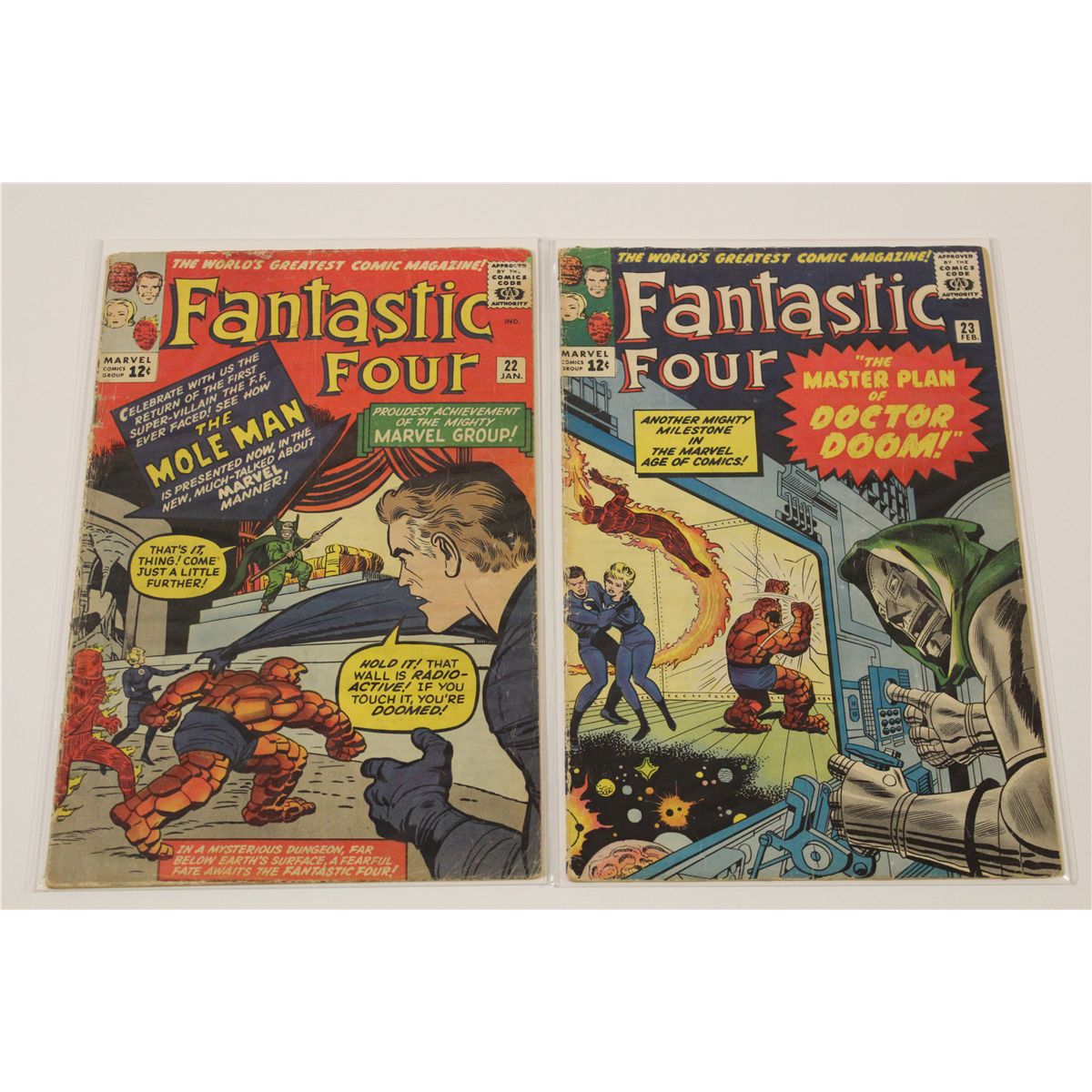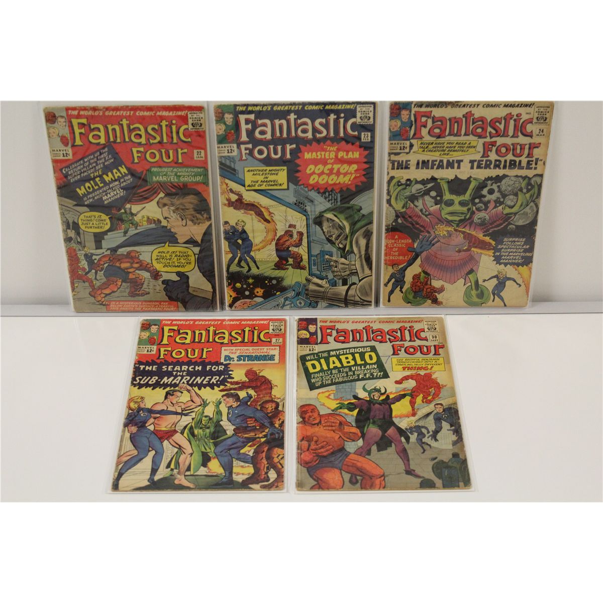 FANTASTIC FOUR #22, 23, 24, 27 & 30 (1964) SILVER AGE RUN OF 5 EARLY FF'S - #27 - 1ST DR. STRANGE X-OVER, #30 - 1ST. APP. DIABLO. LOWER GRADE AVERAGE BUT STRUCTURALLY SOUND, ALL 4 HAVE ATTACHED COVERS & CF WITH NO PIECES OUT, ALL SOLID, SUPPLE & COMPLETE COPIES.