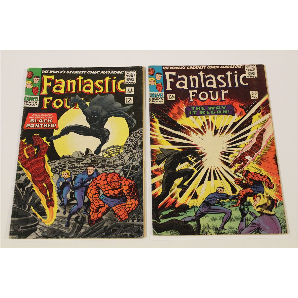 FANTASTIC FOUR #52 & 53 (1966) MAJOR MARVEL KEYS - #52 - 1ST APP. BLACK PANTHER, #53 - ORIGIN & 2ND APP. BLACK PANTHER, CLASSIC KIRBY COVERS! #52 IS A STRONG MID GRADE & #53 IS A SHARP HIGHER MID GRADE, GLOSSY, TIGHT & SUPPLE, TWO VERY NICE KEYS!