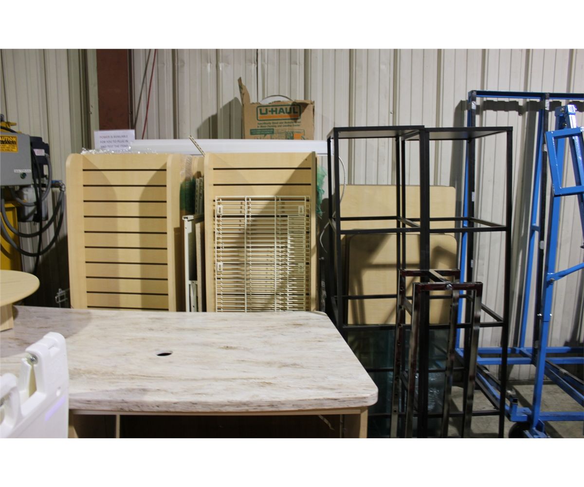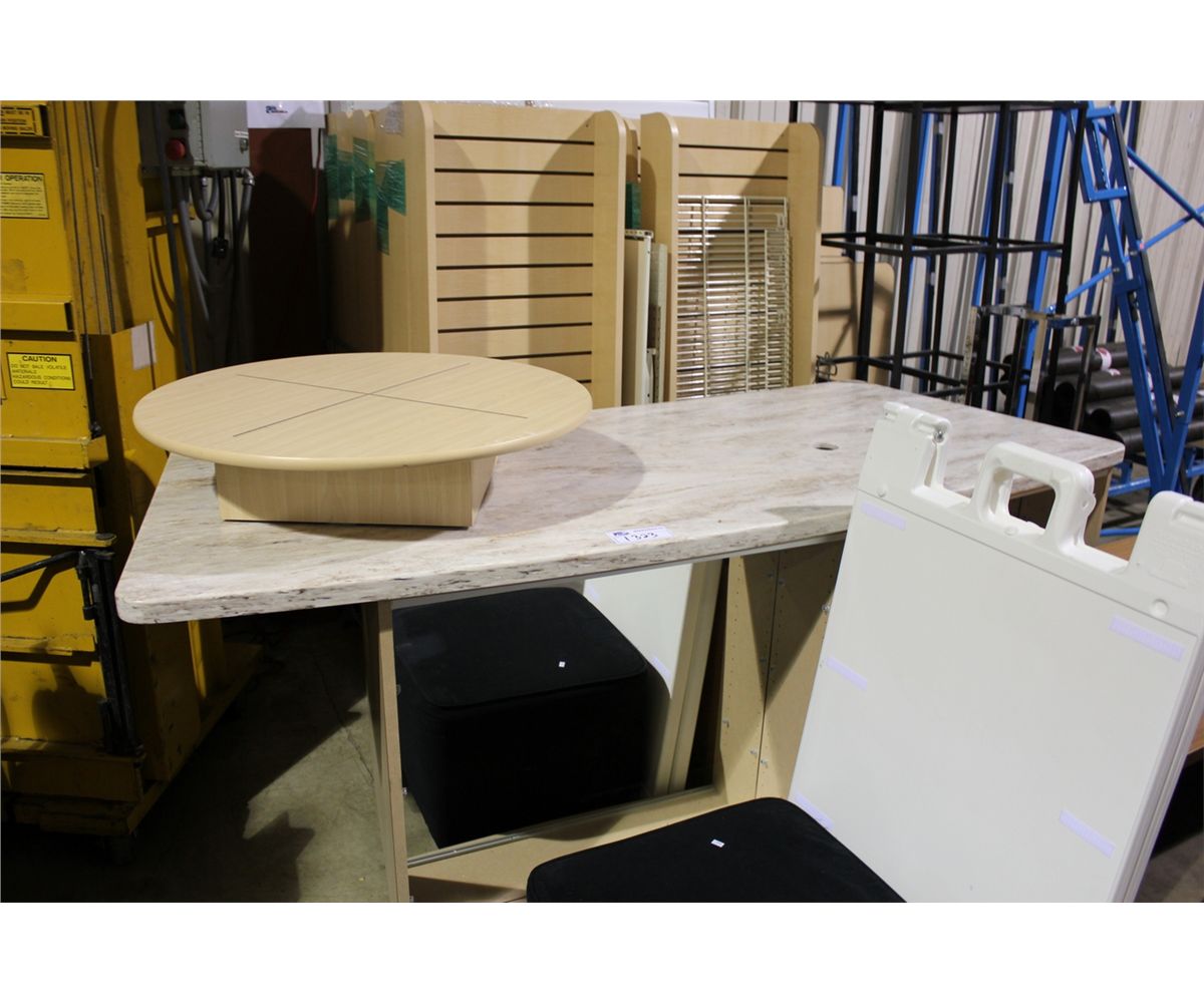 FAUX GRANITE DISPLAY COUNTER, MAPLE DISPLAY SHELVES & ASSORTED SHOWROOM RACKING