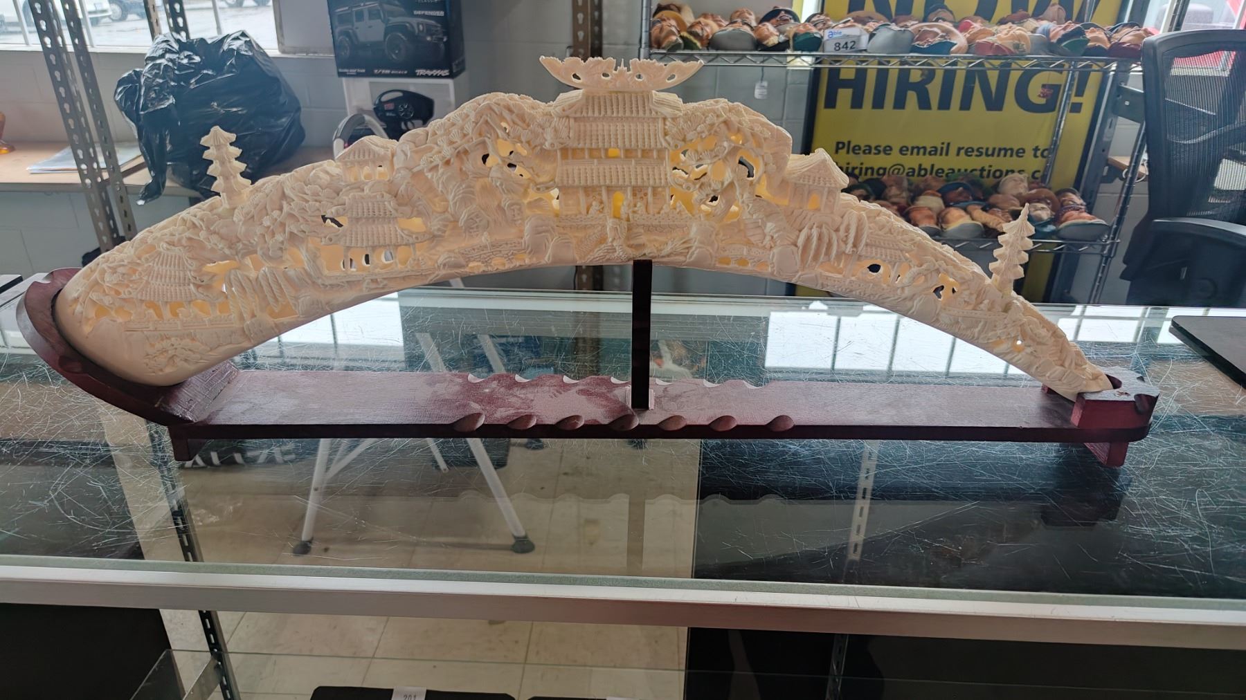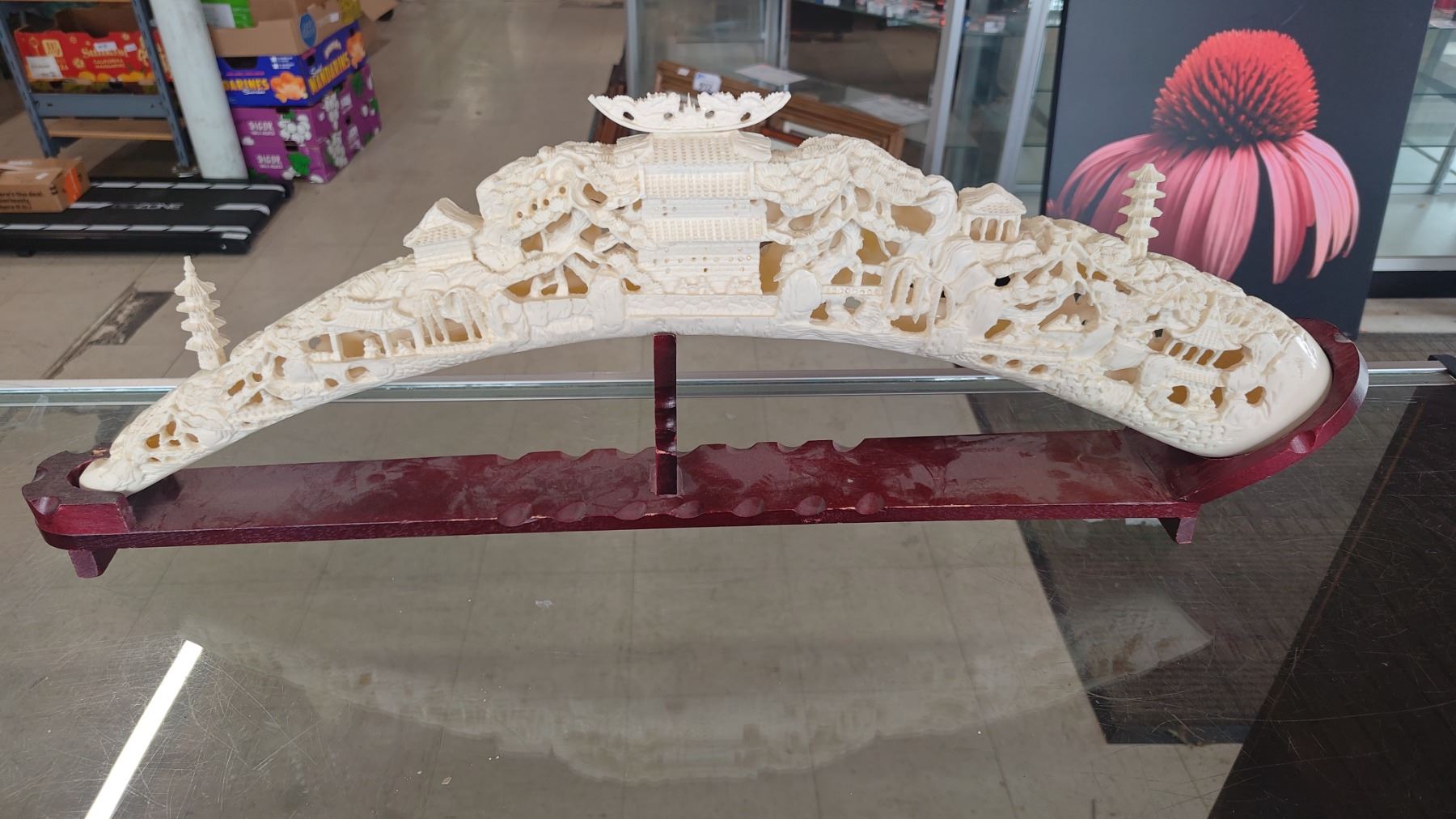 FAUX IVORY CARVED TUSK ON MAHOGANY STAND